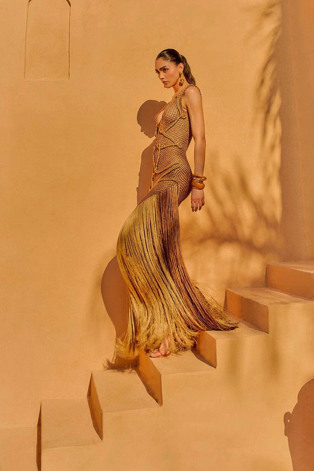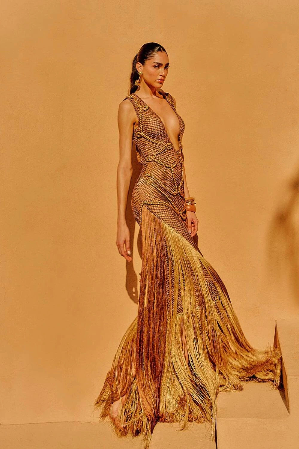 Inspirado em Oásis, esse vestido traz uma modelagem sereia com franjas em V, que valorizam a silhueta feminina de forma elegante e sensual. Desenvolvido para mulheres que desejam expressar poder, confiança e toda a essência da coleção Ammi.
