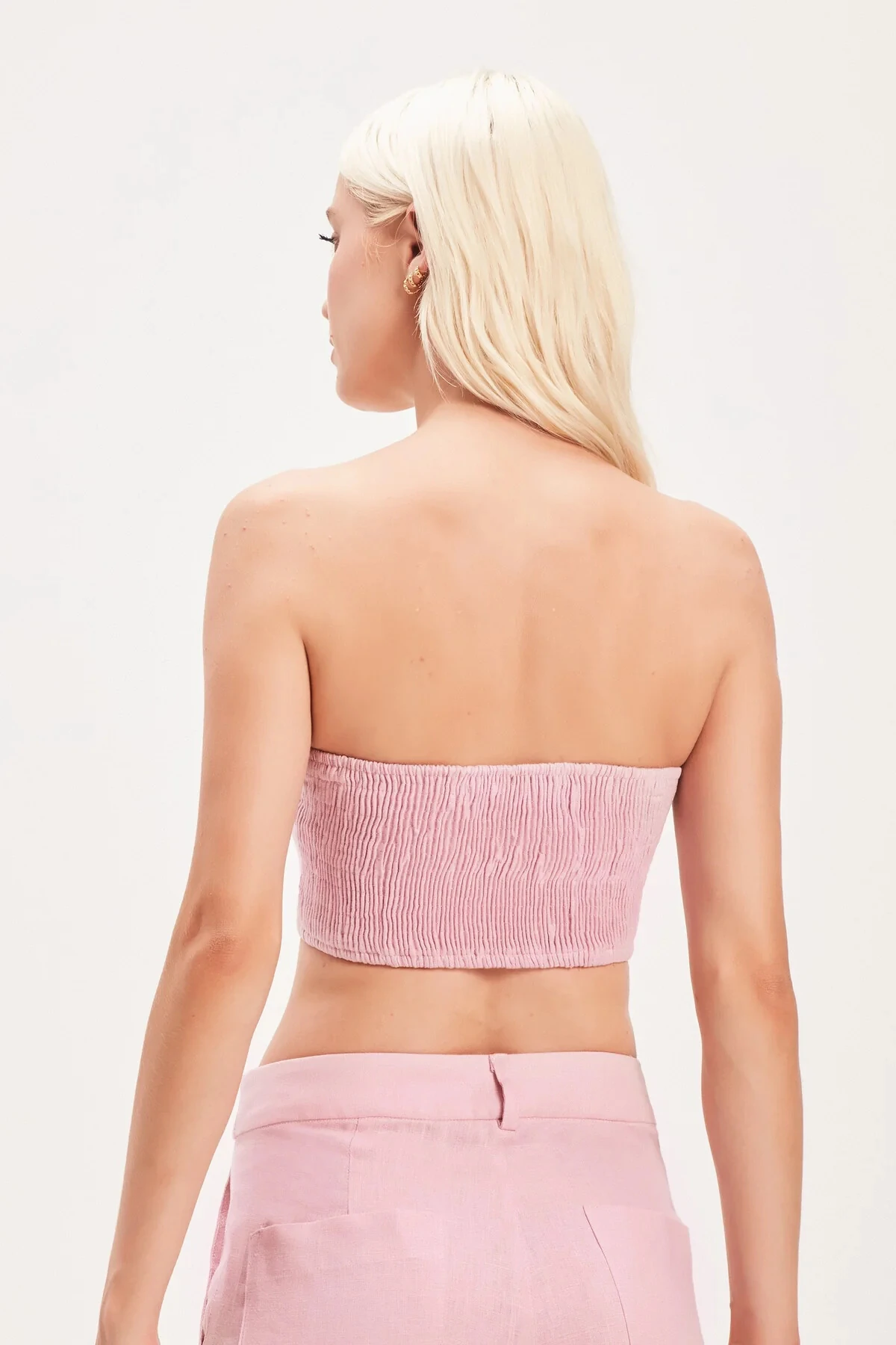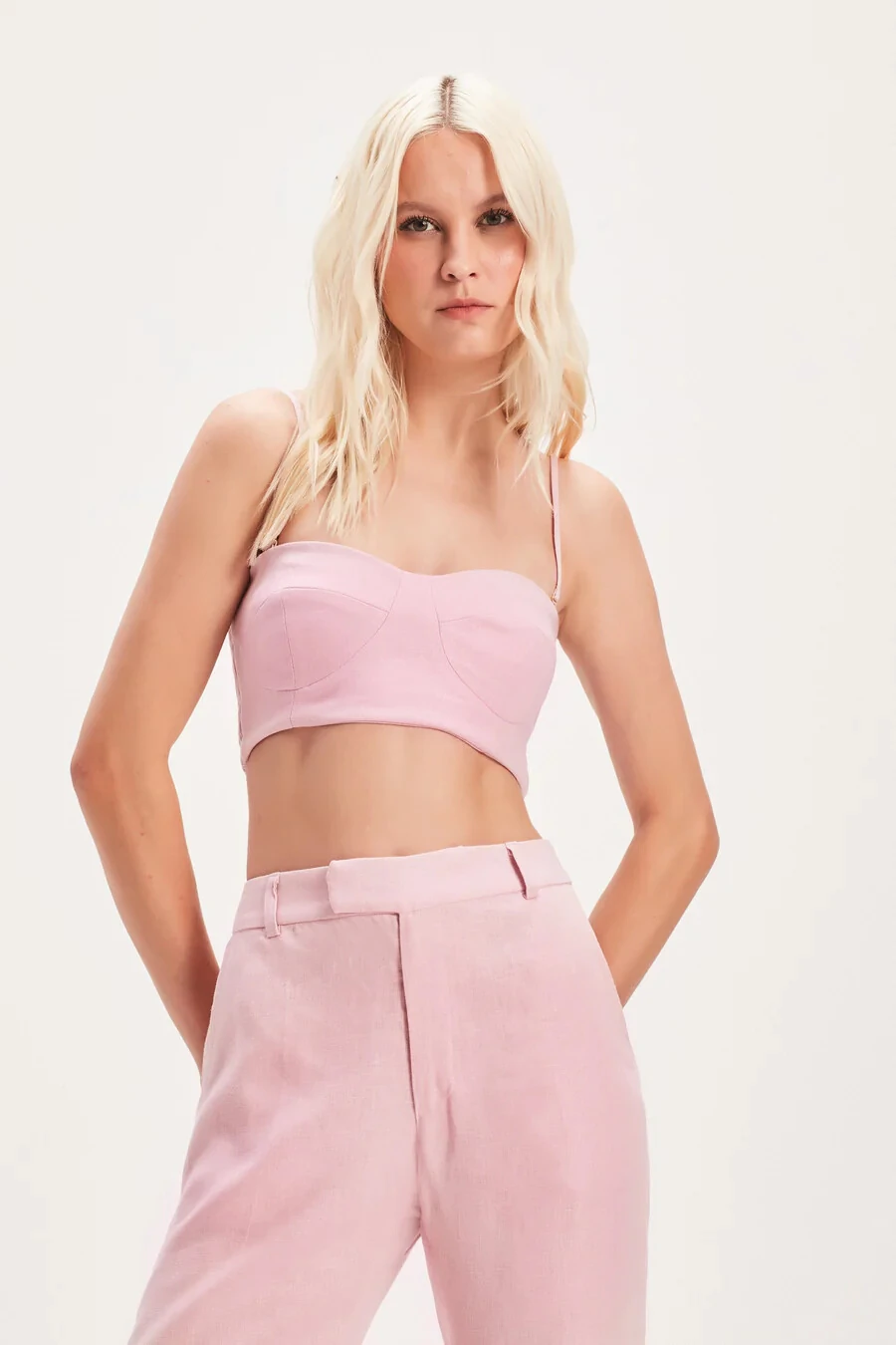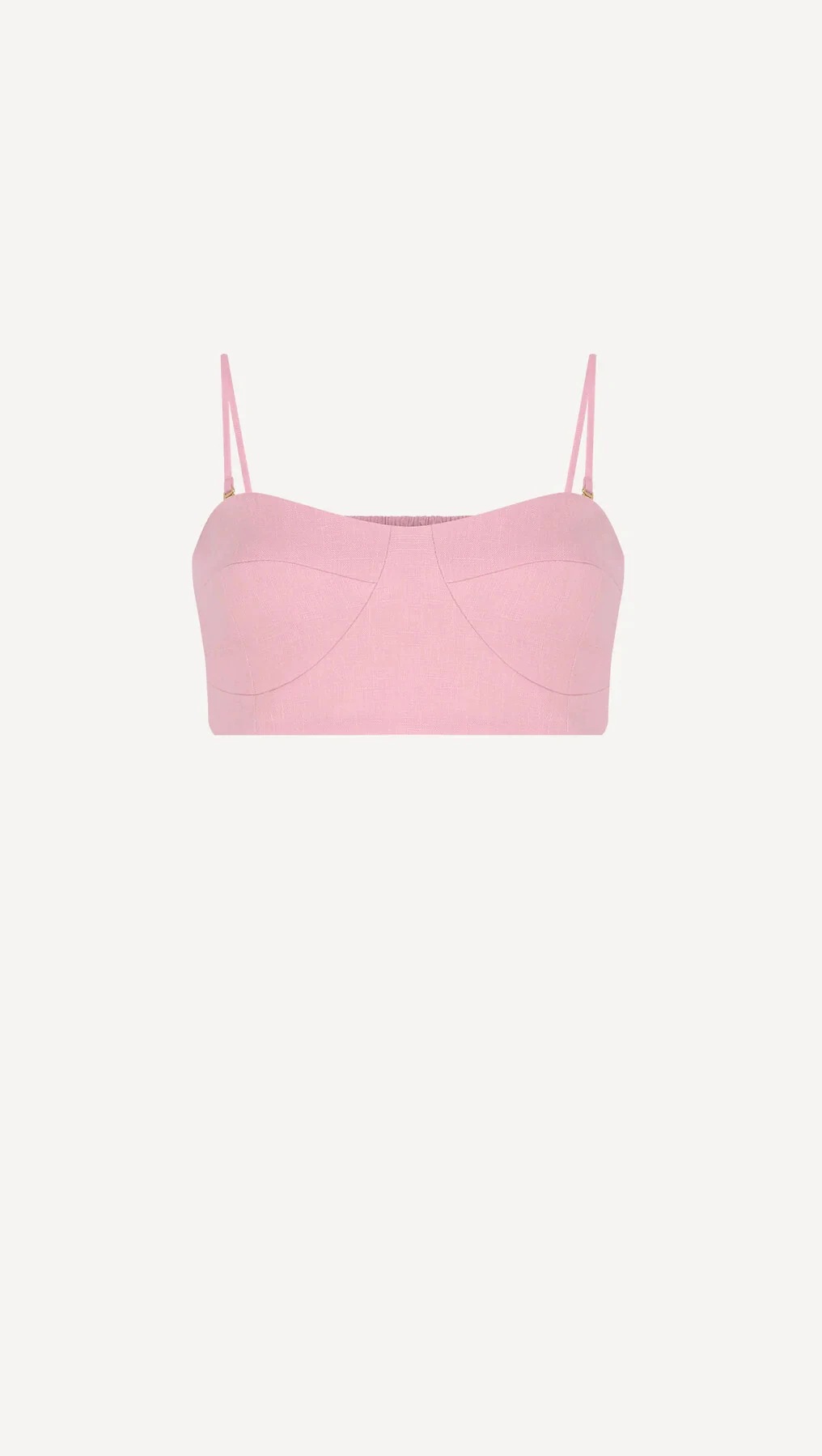 Top em linho encorpado com shape justinho ao corpo. Possui decote coração e alças removíveis com regulagem metálica. Trabalho em lastex na parte de trás. Não possui fechamento.