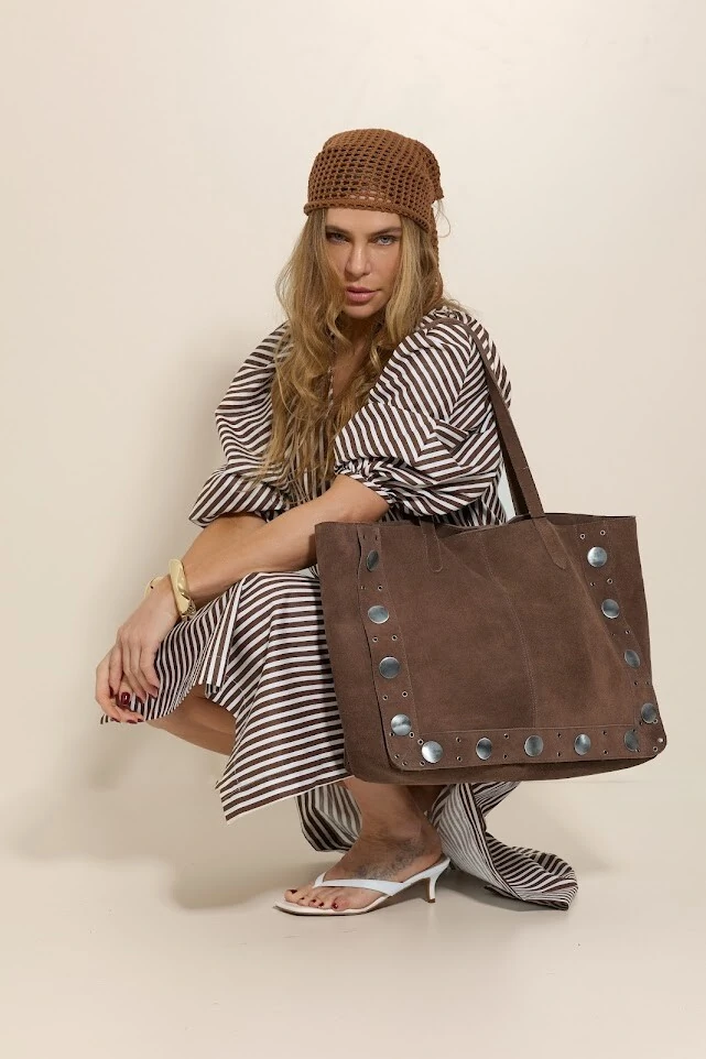 O vestido possui decote em V, mangas bufantes, caimento reto com fendas laterais, solto ao corpo, bolsos invisíveis e faixa de segurança na parte posterior do decote. Acompanha faixa para amarrar na cintura no próprio tecido.