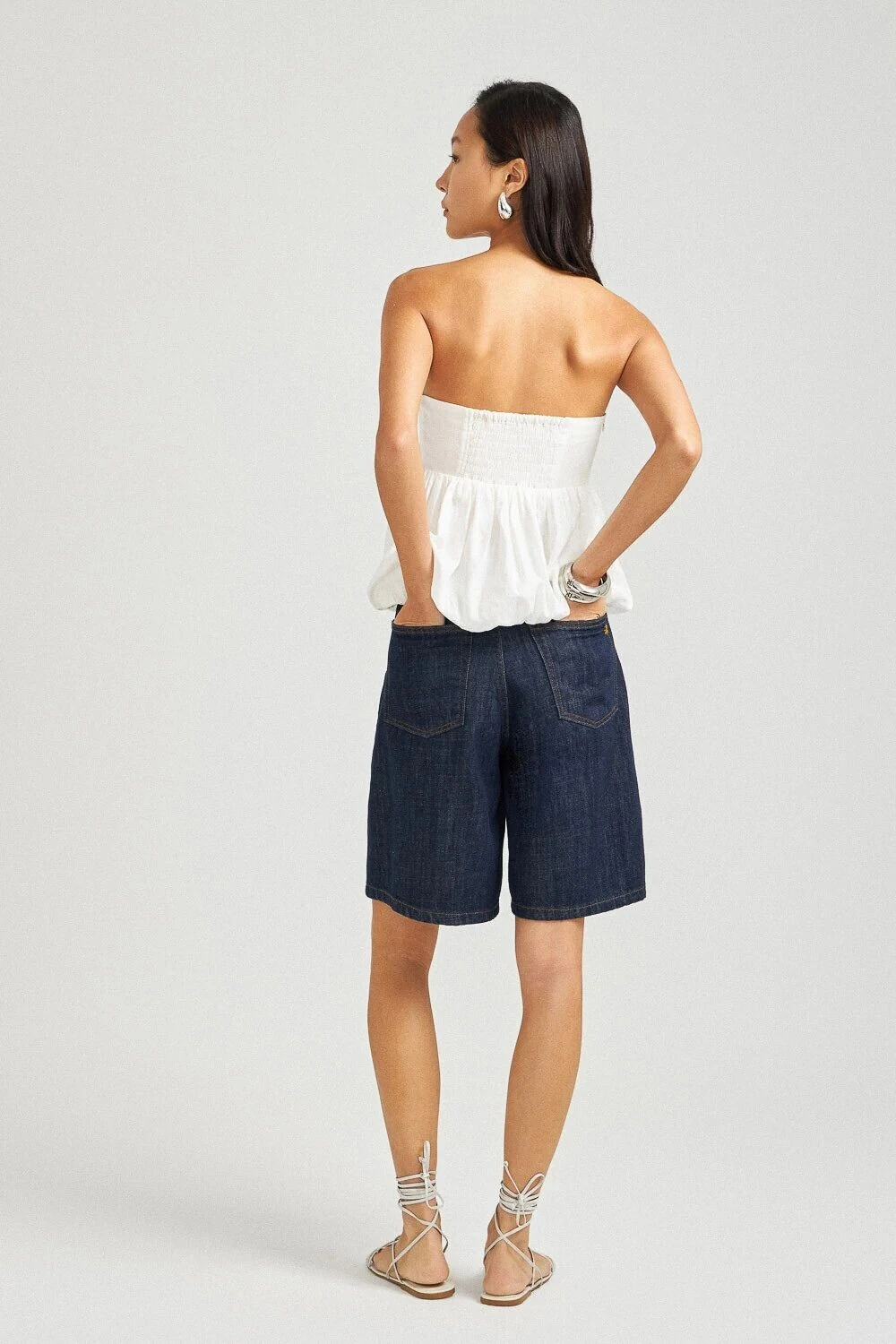 Jorts confeccionado em jeans raw e modelagem solta, a peça garante conforto e liberdade de movimento, enquanto a cintura média oferece ajuste versátil. O comprimento até o joelho confere um visual moderno e casual. O fechamento é por zíper e botão, trazendo um acabamento funcional.