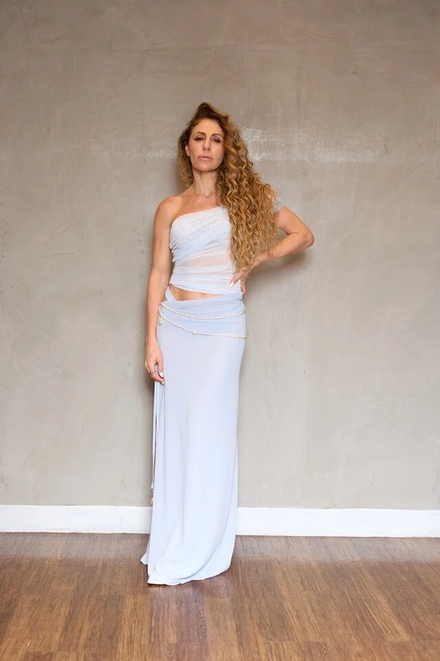 Vestido longo com blusa em tule, decote reto ombro a ombro estruturado com fita de silicone para melhor aderência. Saia de chiffon, com detalhe drapeado na lateral