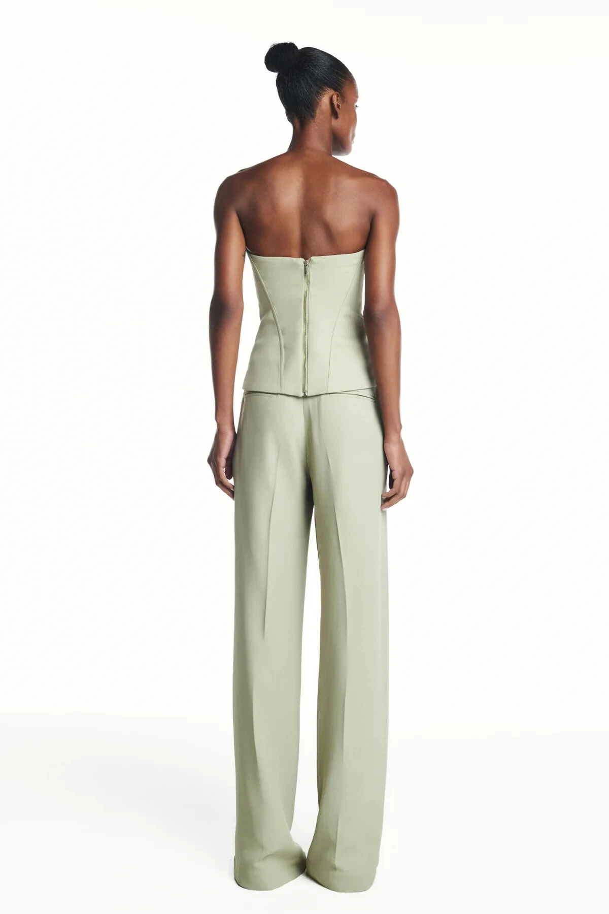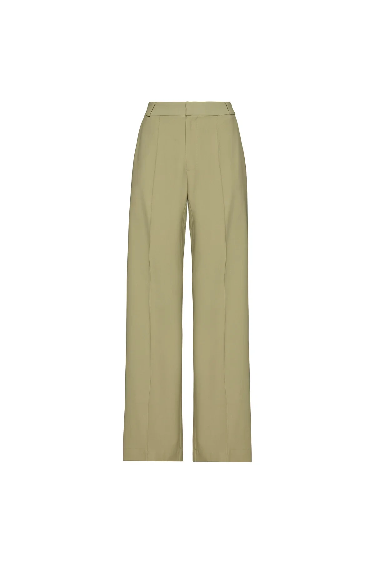 Calça de alfaiataria em tecido encorpado com toque de crepe, shape soltinho e modelagem reta. Possui cintura alta e cós com passantes. Bolsos na frente e atrás com friso frontal. Fechamento com zíper, botão e colchetes de gancho.
