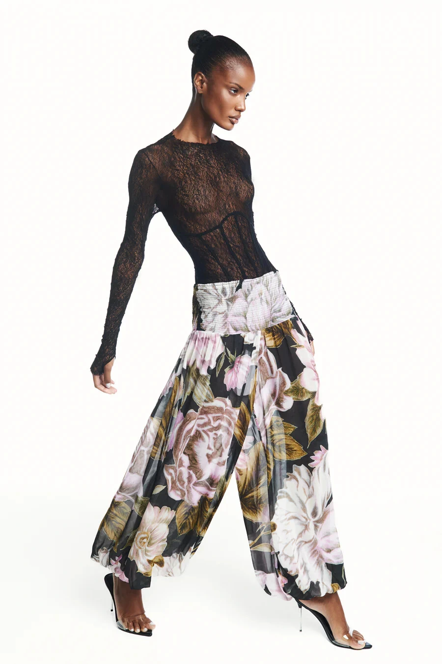 Calça em crepe leve, modelagem ampla e caimento fluido com volume. Possui cintura com aplicação de lastex dando elasticidade na cintura e quadril e elástico no acabamento da barra, remetendo ao estilo Aladim. Não possui fechamento.