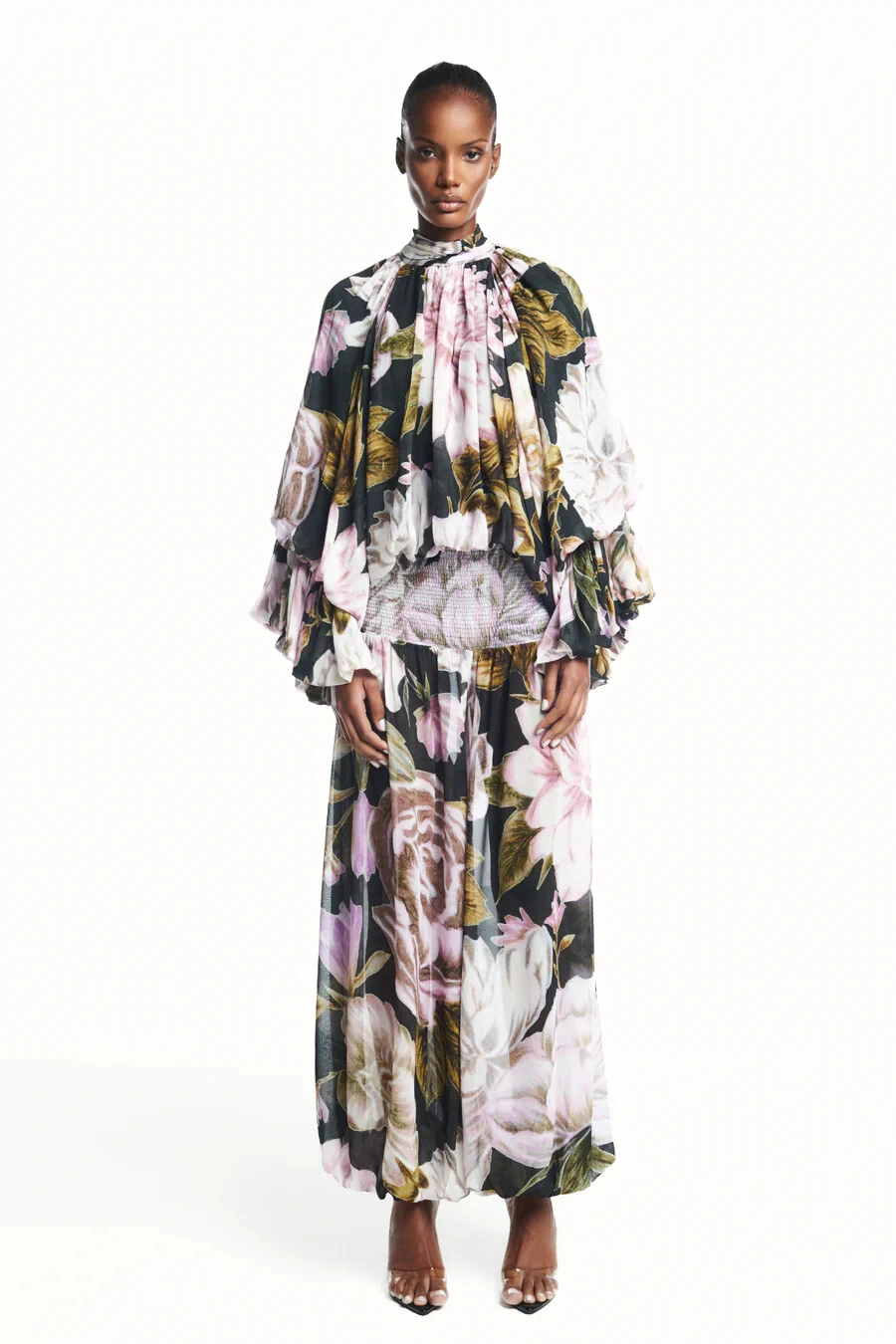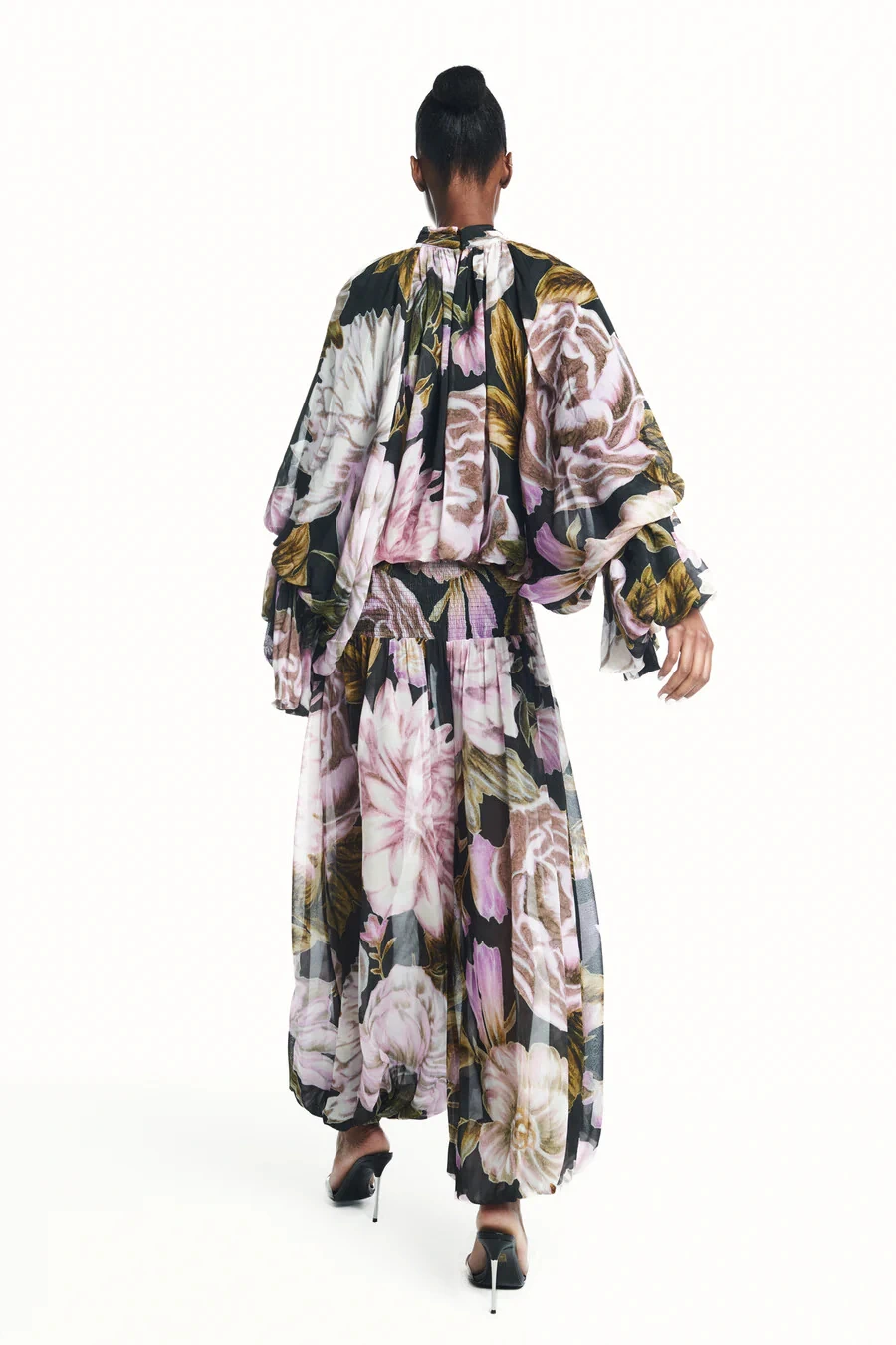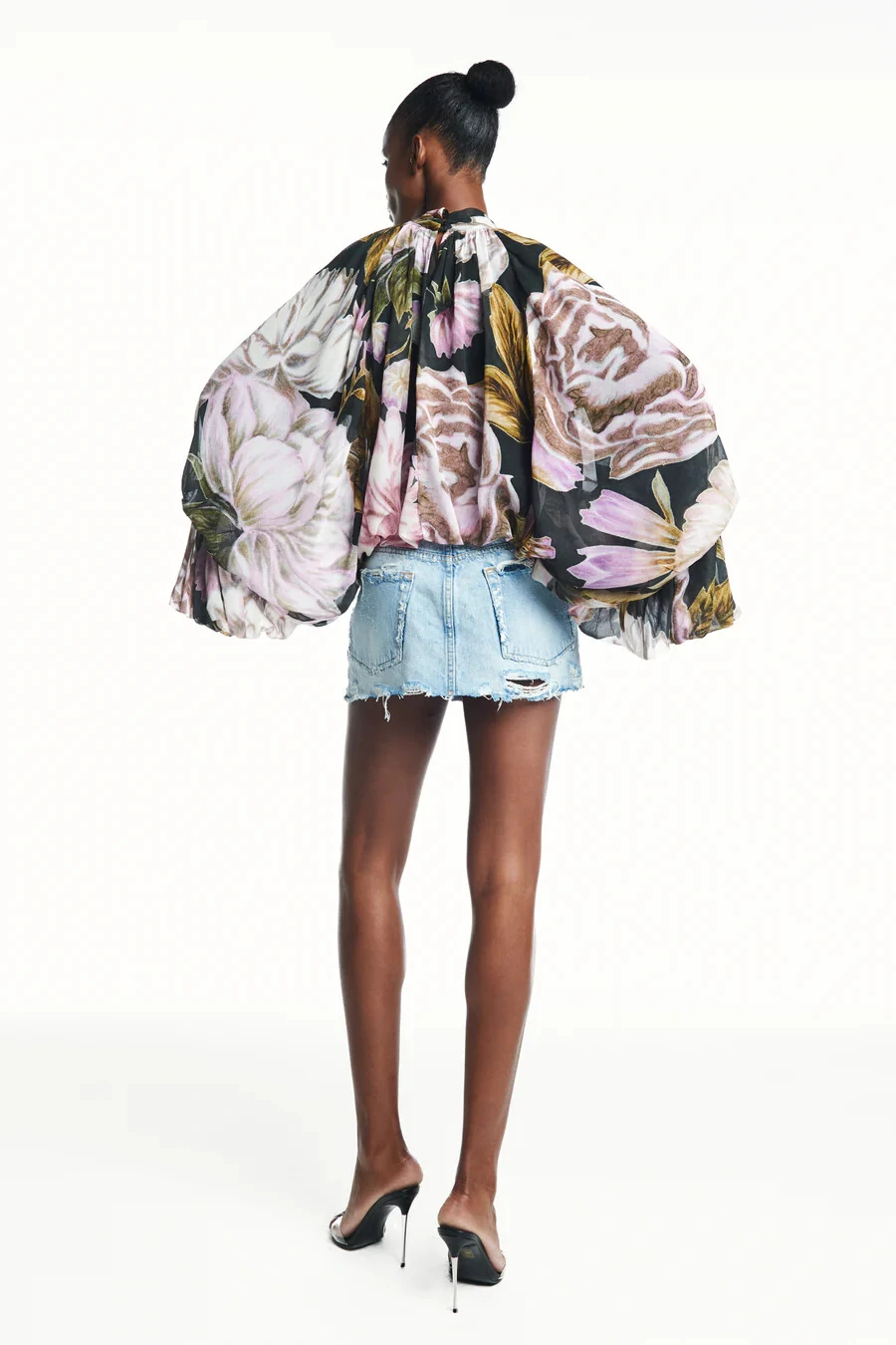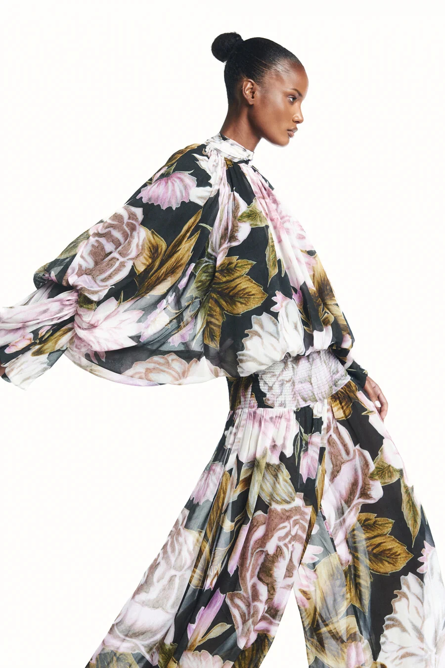 Blusa em crepe leve estampada com modelagem ampla e gola alta. Possui manga morcego com elástico na barra para melhor ajuste da peça ao corpo. Fechamento por botões na parte de trás da peça.