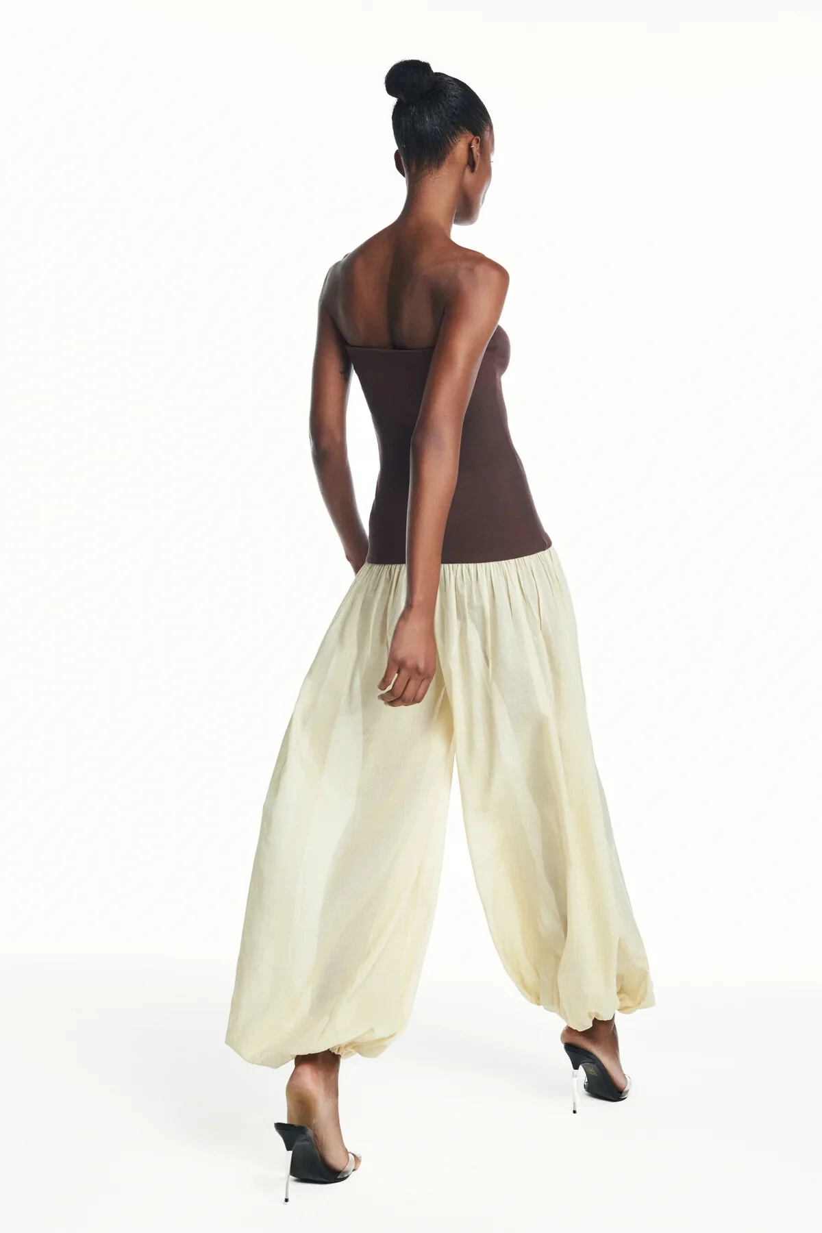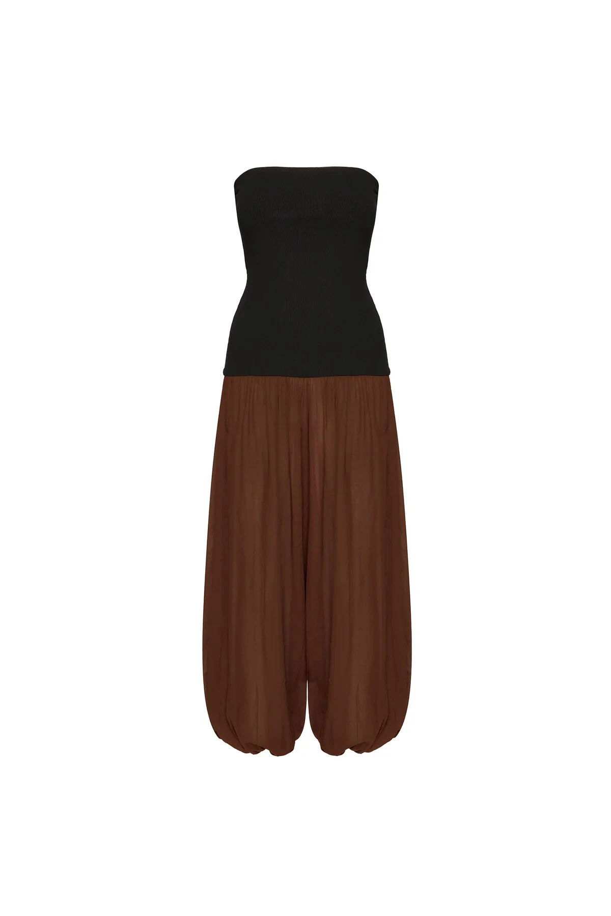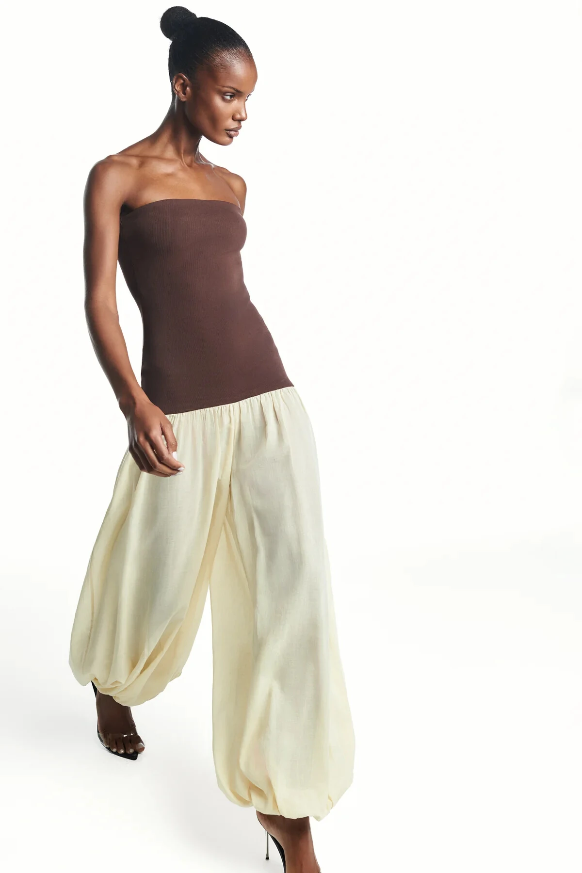 Macacão em modelagem ampla com shape justinho ao corpo e decote tomara que caia com composê de tecido. Possui malha canelada com elasticidade do busto ao quadril e algodão na parte de baixo. Possui franzidos no quadril e elástico embutido no acabamento da barra, remetendo ao estilo Aladim. Não possui fechamento.