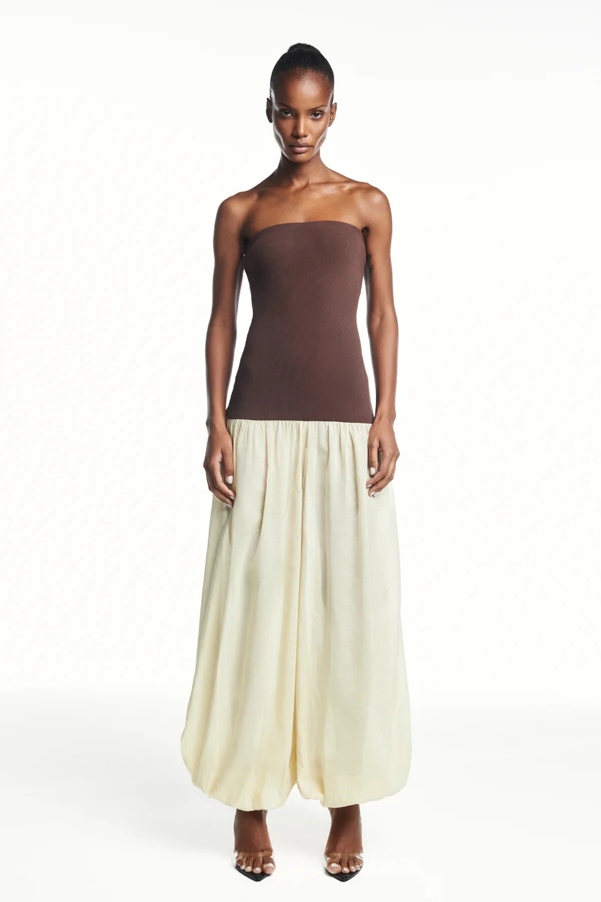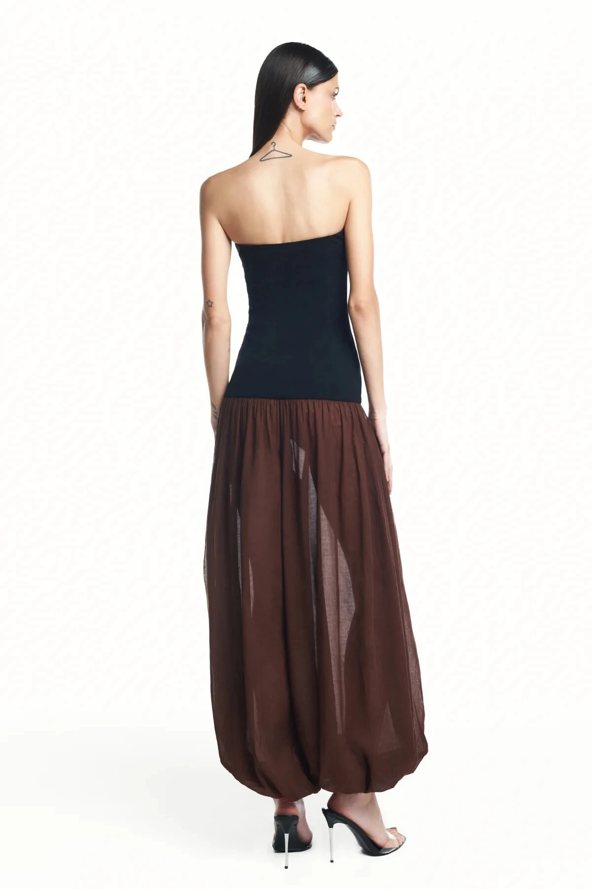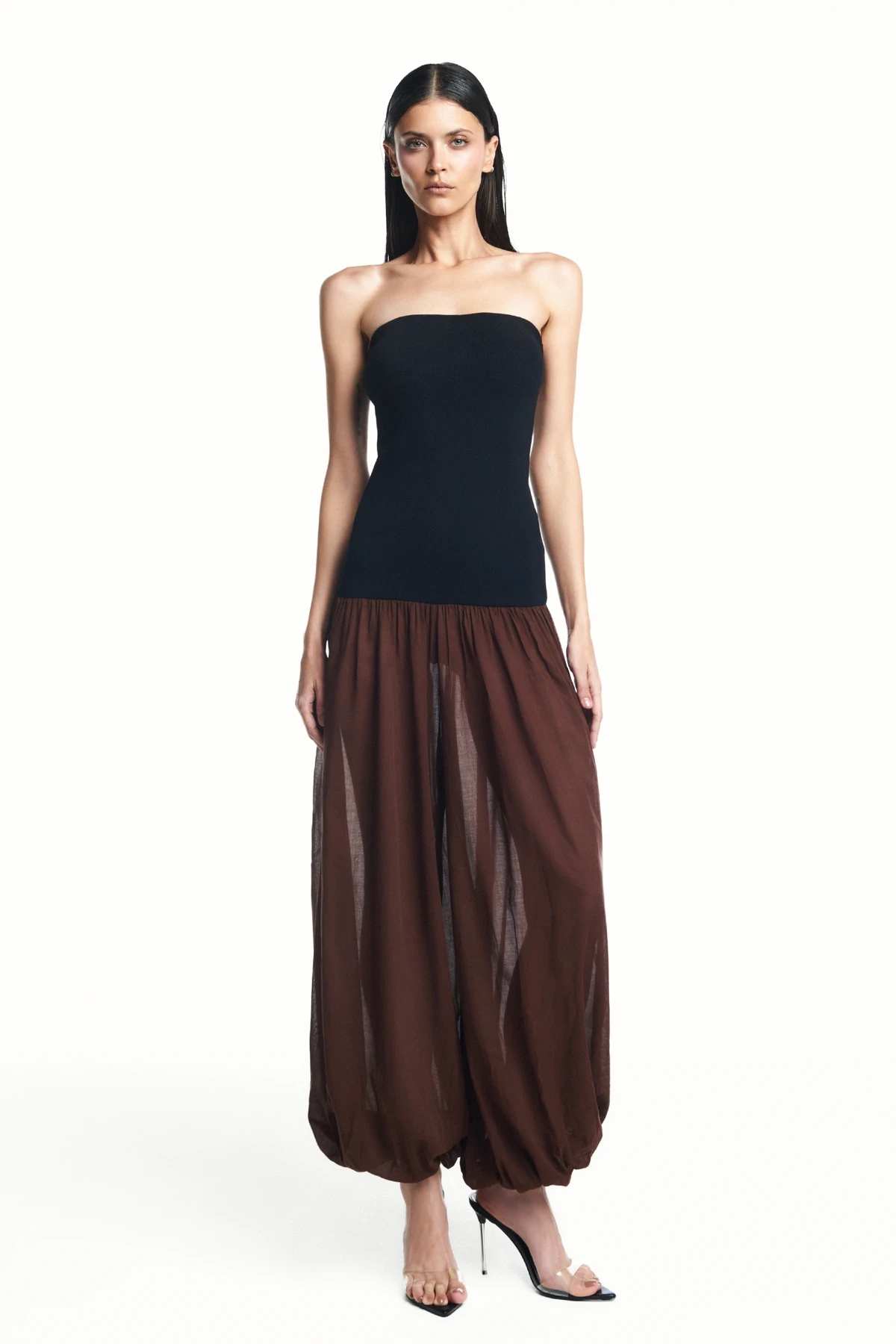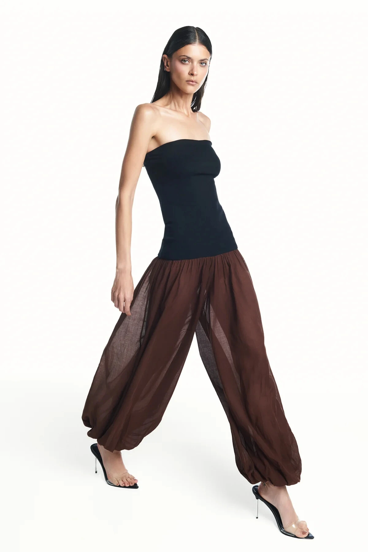 Macacão em modelagem ampla com shape justinho ao corpo e decote tomara que caia com composê de tecido. Possui malha canelada com elasticidade do busto ao quadril e algodão na parte de baixo. Possui franzidos no quadril e elástico embutido no acabamento da barra, remetendo ao estilo Aladim. Não possui fechamento.