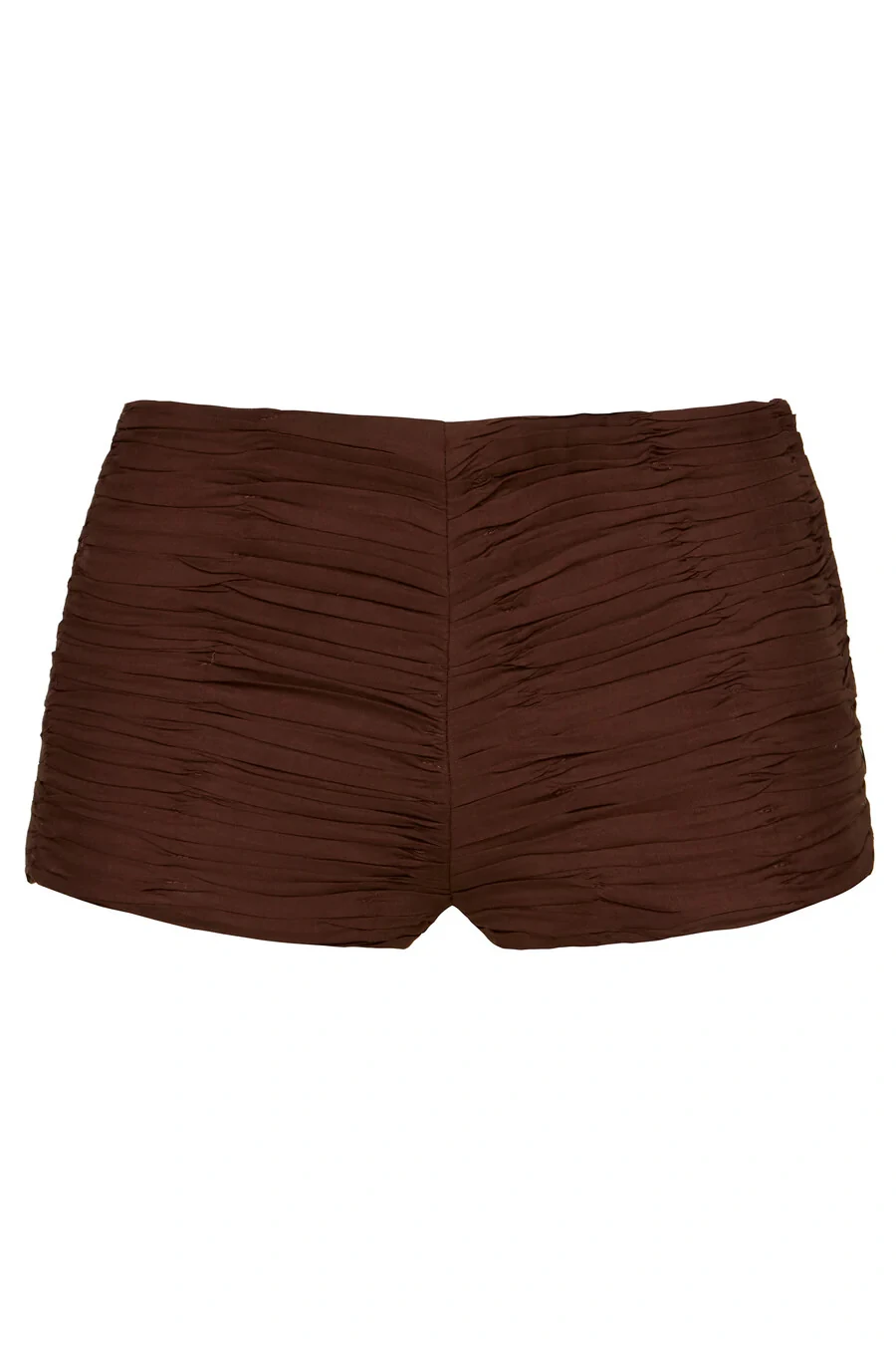 Mini shorts em algodão de cintura baixa com modelagem justinha ao corpo, drapeado por toda a peça e acabamento de forro. Fechamento com zíper na lateral.