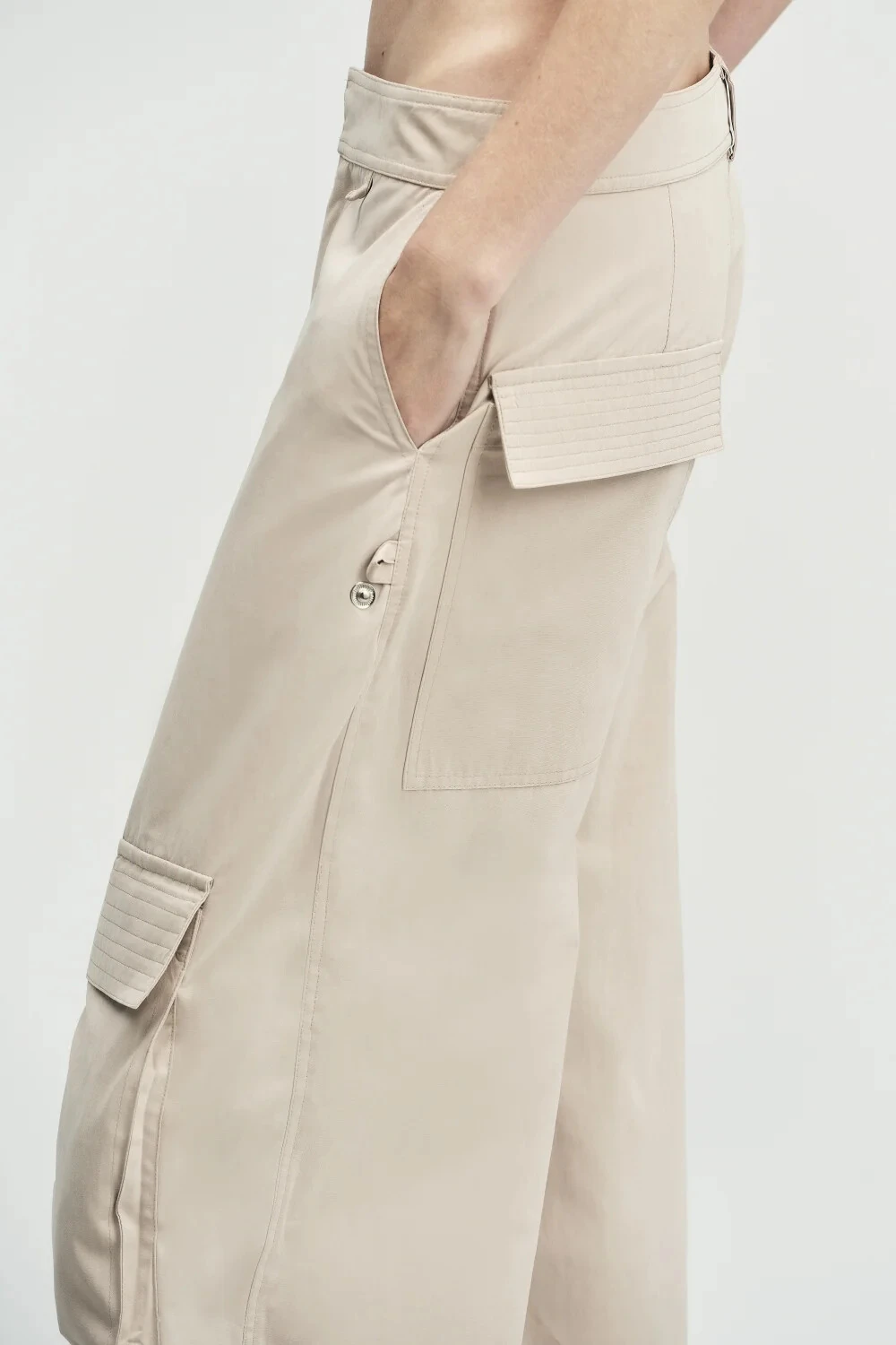 Estilo utilitário em alta. A calça éter funcional tem modelagem ampla, cintura ajustada e múltiplos bolsos que são de verdade — funcionais, espaçosos e estilosos. O visual urbano encontra o conforto com o tecido estruturado e leve na medida certa.