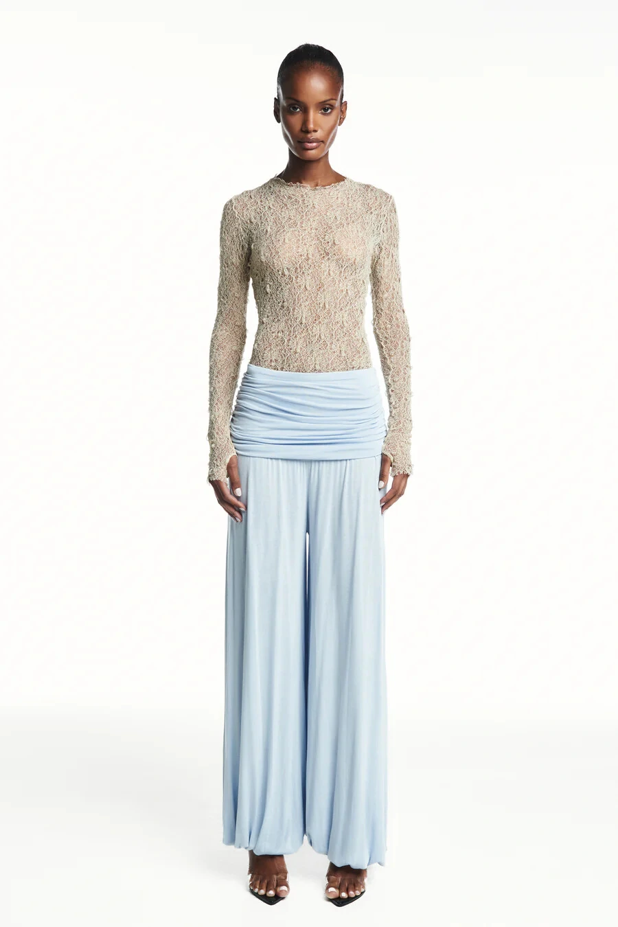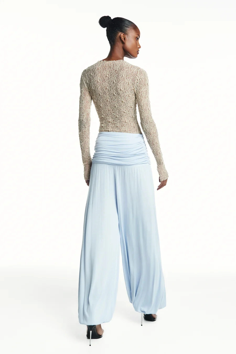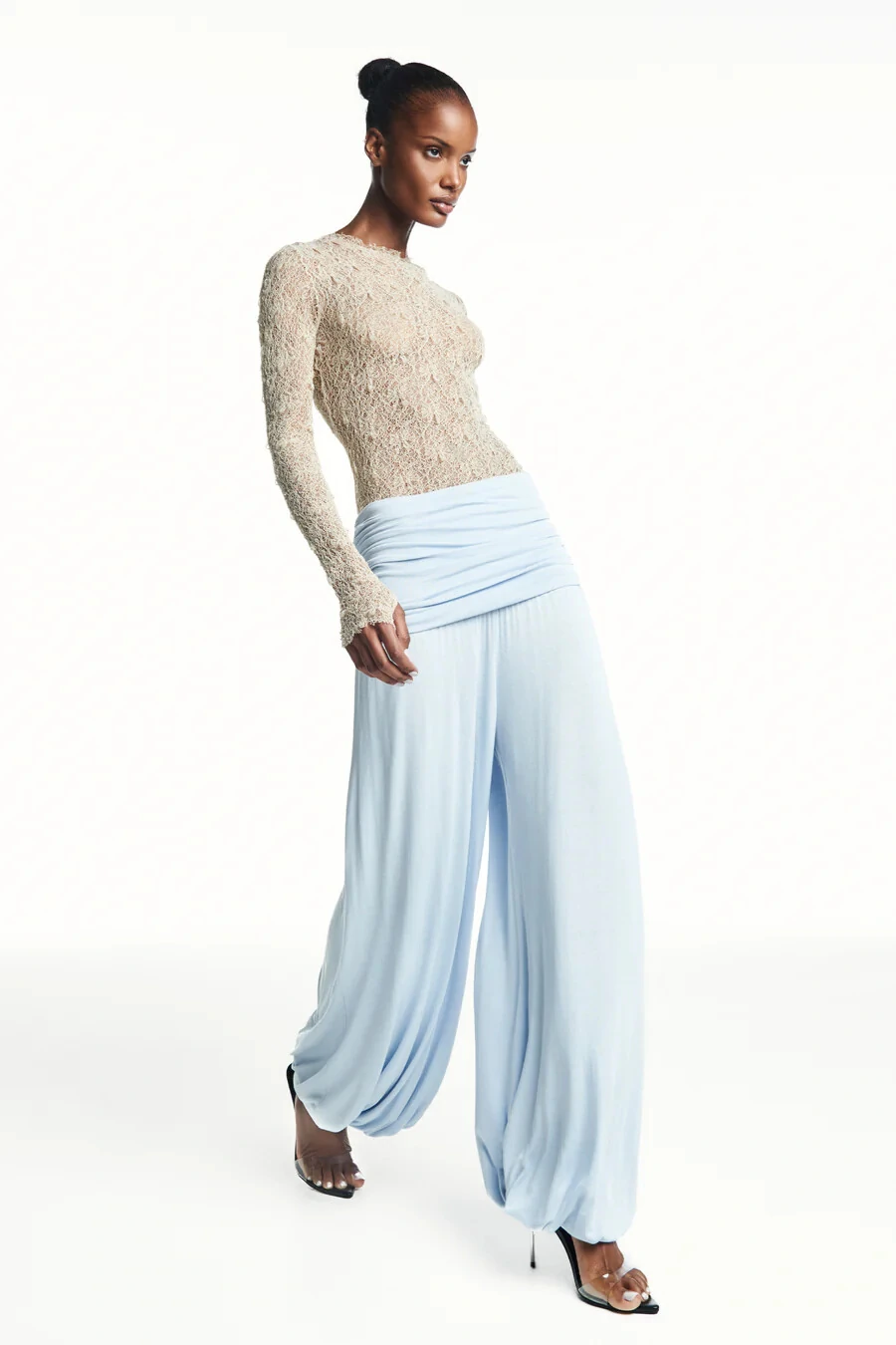 Calça em modelagem ampla de malha com toque macio. Possui caimento fluido e pala drapeada na cinura . O acabamento nas barras com elástico remete ao estilo Aladim. Não possui fechamento.