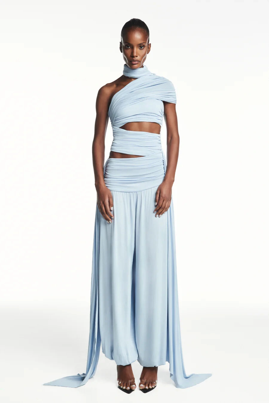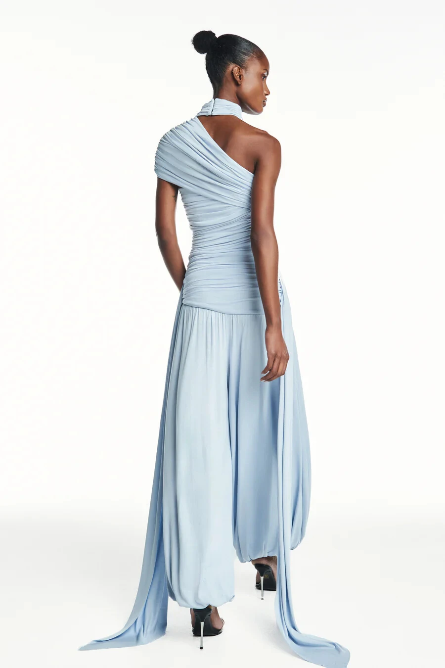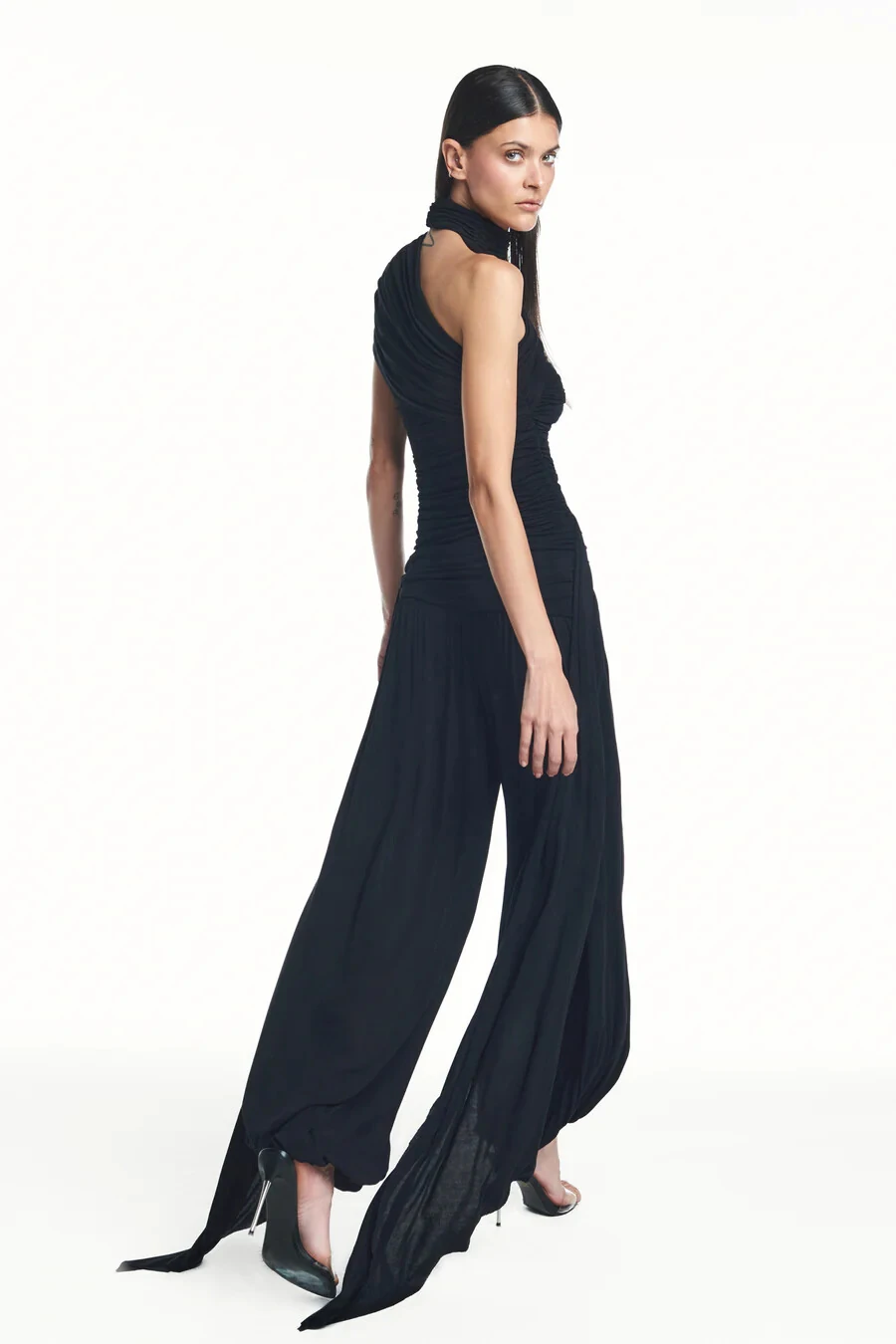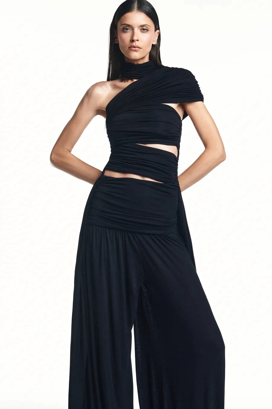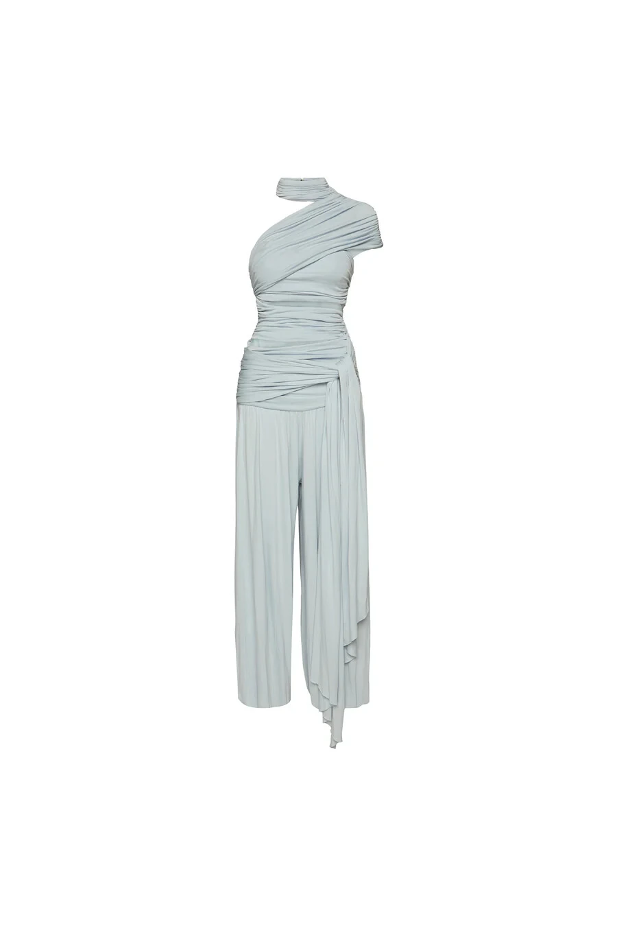 Macacão em malha com elasticidade. Modelagem ajustada ao corpo. Possui gola alta transpassada e detalhe de recortes com elástico embutido para melhor ajuste e conforto ao corpo. Ponta comprida na lateral. Fechamento por botões na parte de trás da nuca.