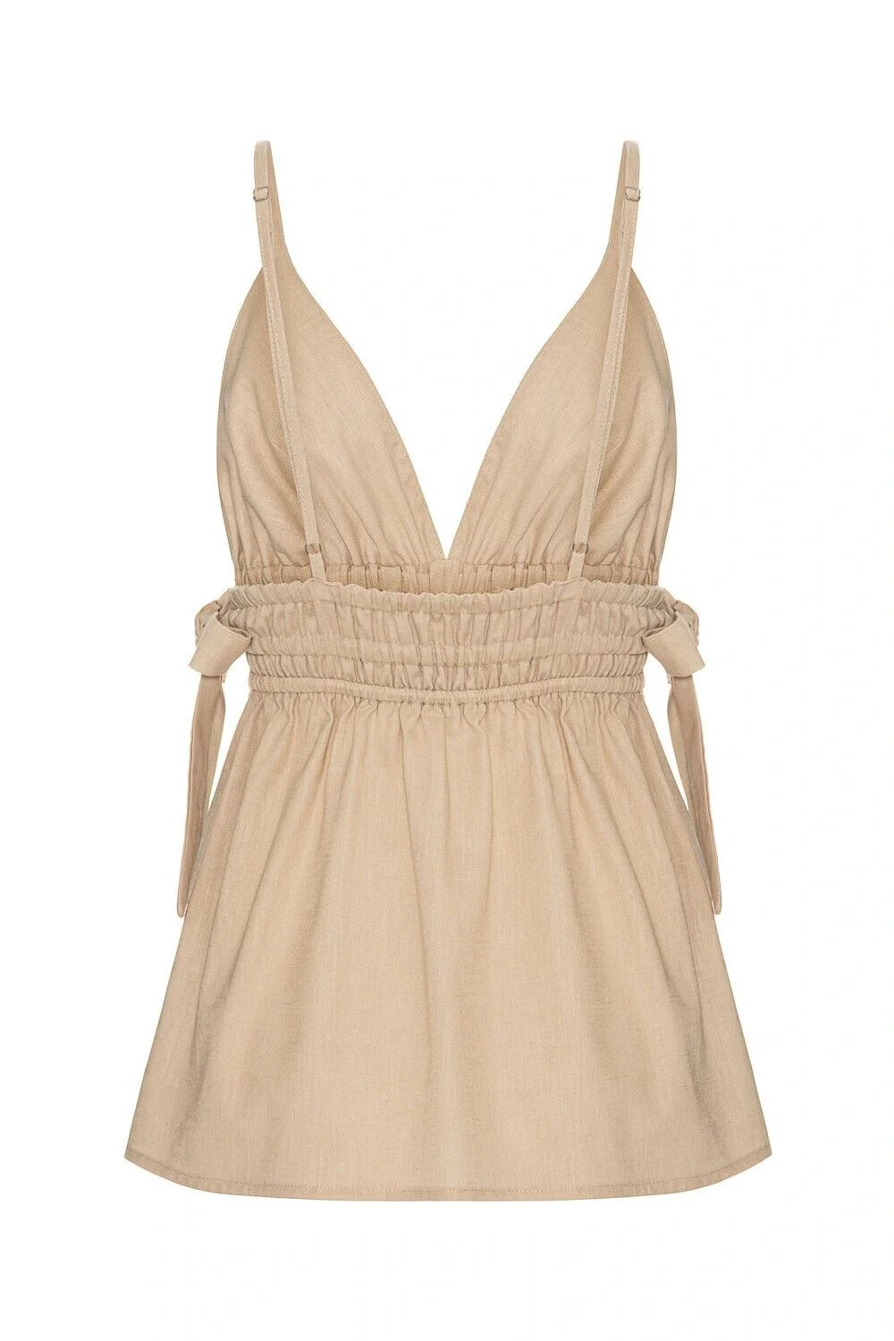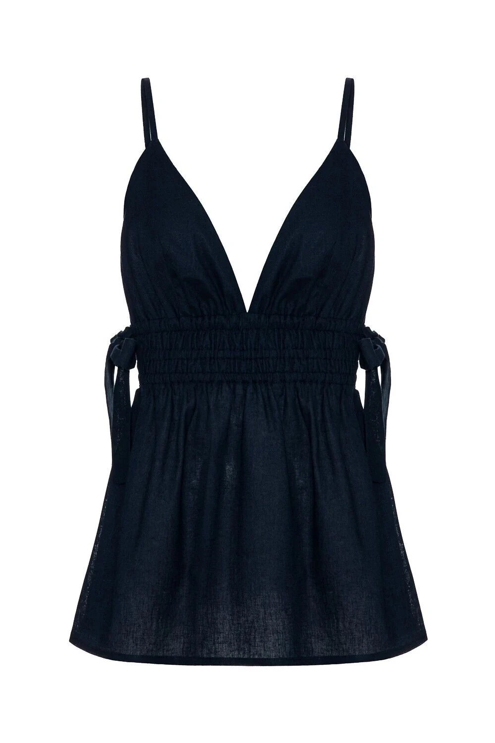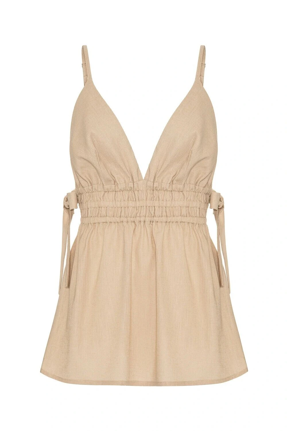 Top de alça em cambraia de linho com algodão, com decote delicado que valoriza o colo e ajuste na cintura para definir a silhueta.
