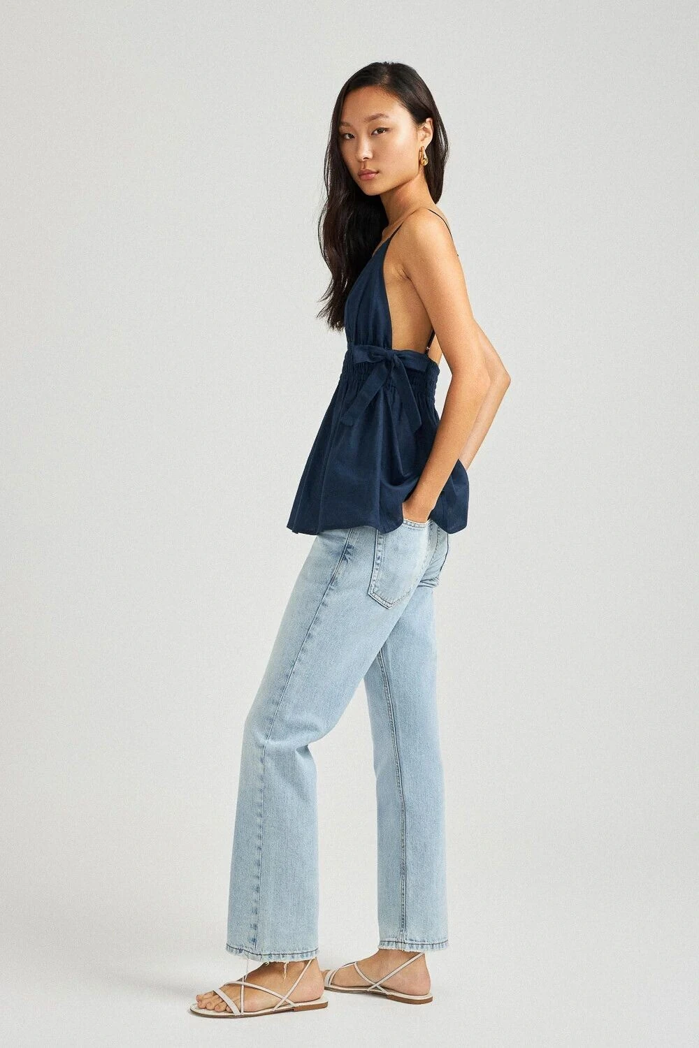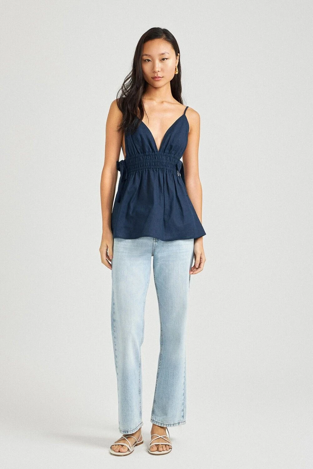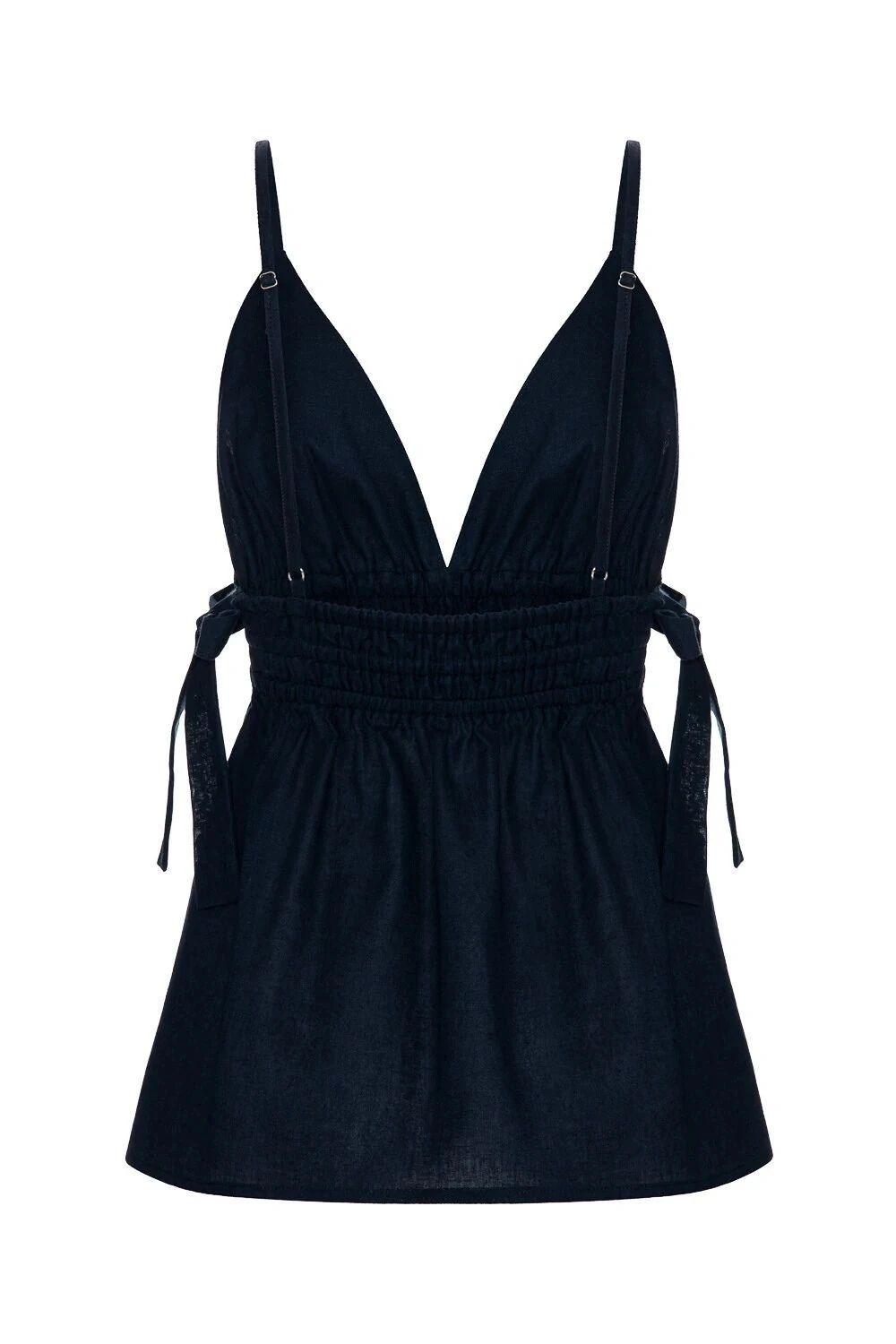 Top de alça em cambraia de linho com algodão, com decote delicado que valoriza o colo e ajuste na cintura para definir a silhueta.