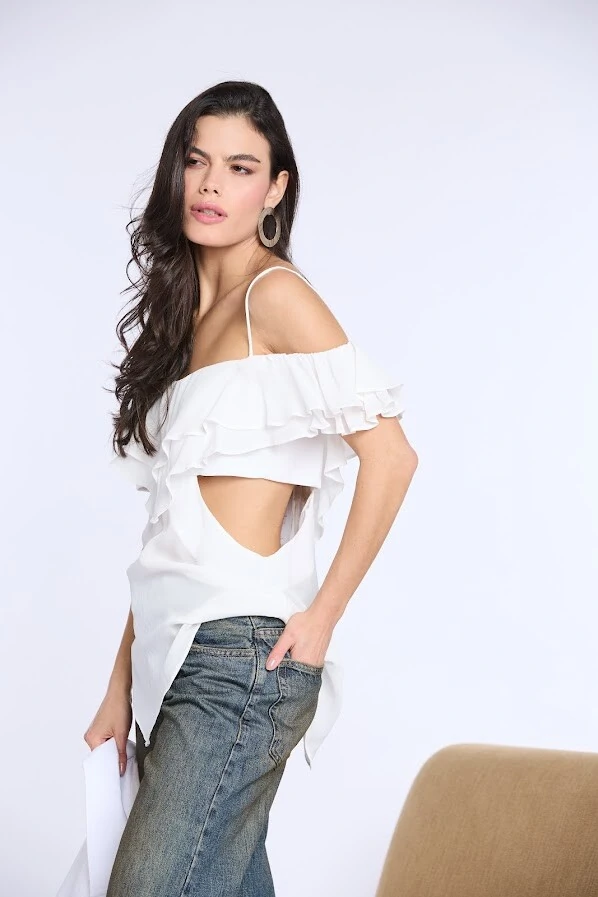 Blusa Georgete Ombro A Ombro em Crepe materiais fluidos como georgette, destacam-se pela sofisticação, feminilidade e design atemporal. Peça comum inclue decotes ombro a ombro com babados, recortes estratégicos, modelagem ampla e mangas elaboradas, utilizando tecidos que conferem leveza e uma leve transparência, ideais para um estilo sofisticado.