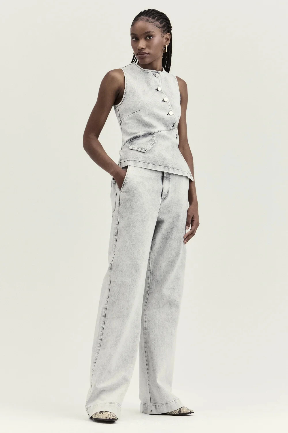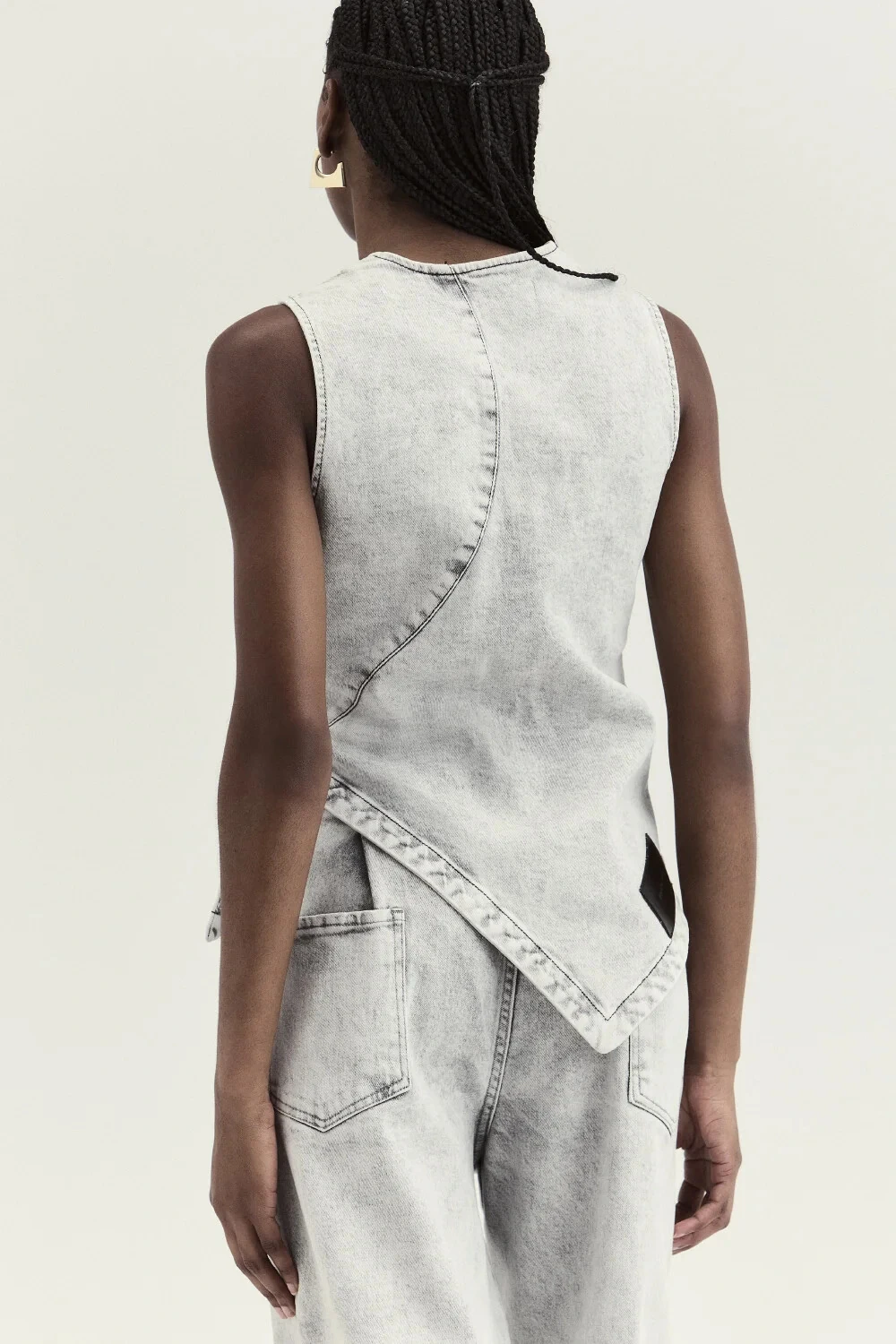 Colete com fechamento em botões e modelagem acinturada. O corte estruturado e a barra irregular tornam a peça um diferencial de styling. Ideal para sobrepor e compor looks fashion-forward.