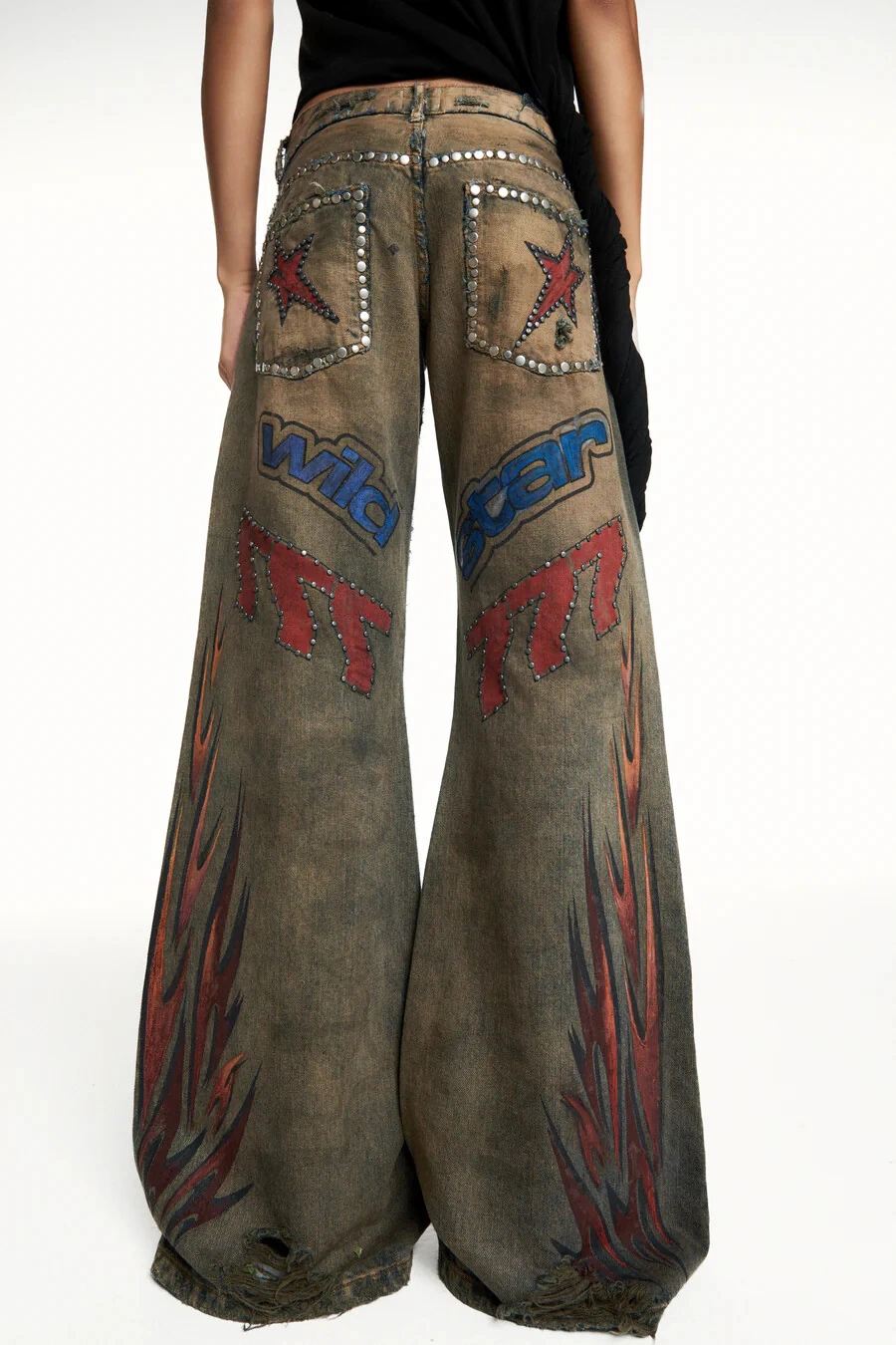 Calça jeans estampada em silk com detalhe de pinceladas feito à mão. Possui modelagem justa flare, cintura baixa, cós com passantes e bolsos na frente e atrás da peça. Detalhe de rasgos e tachas por toda a peça. Fechamento por zíper e colchetes.