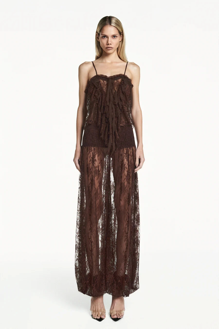 Regata em renda e ponta assimétrica. Possui babados de renda com passantes e tiras a fio, detalhe de rendas no busto e alça regulável para melhor ajuste. Não possui fechamento.