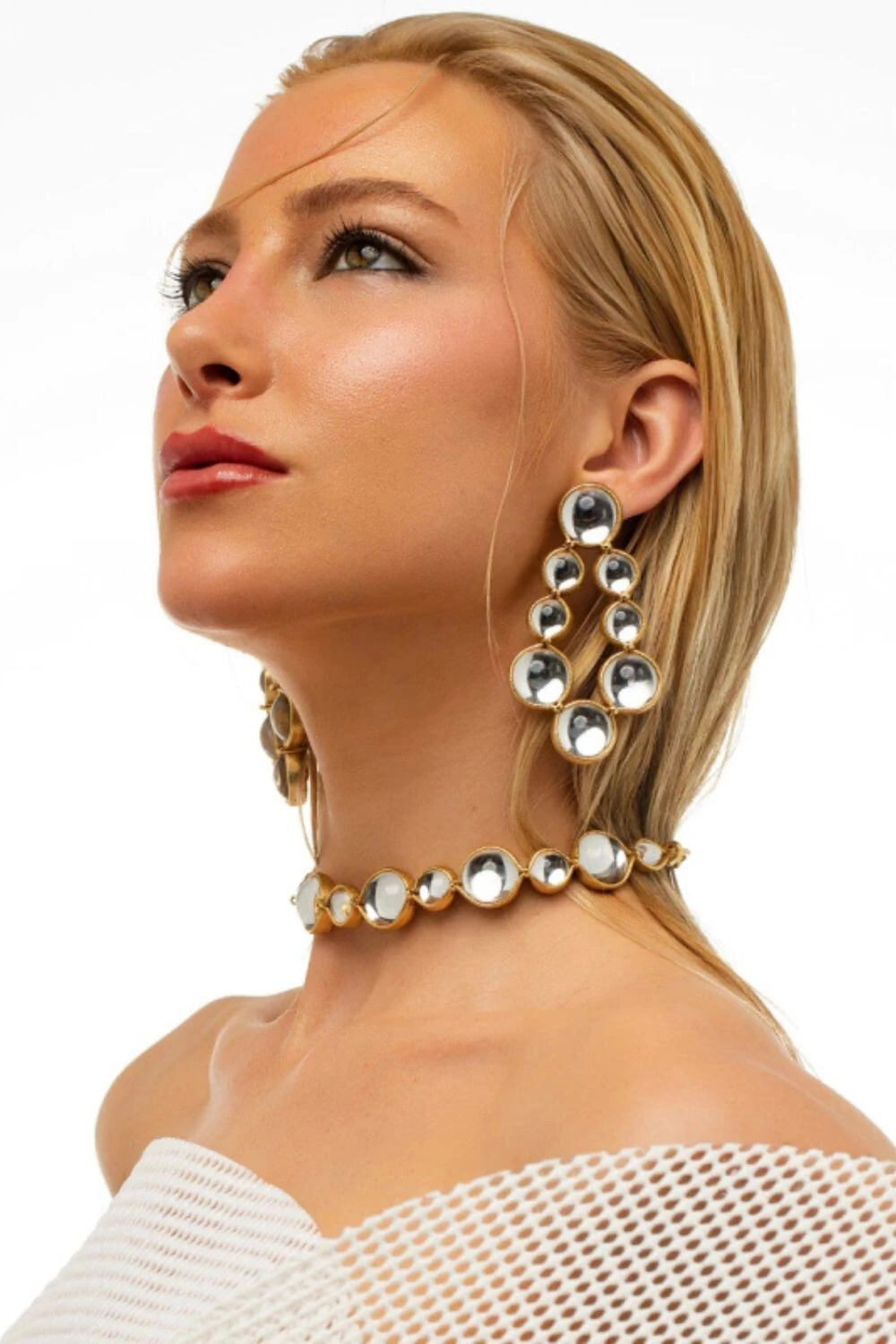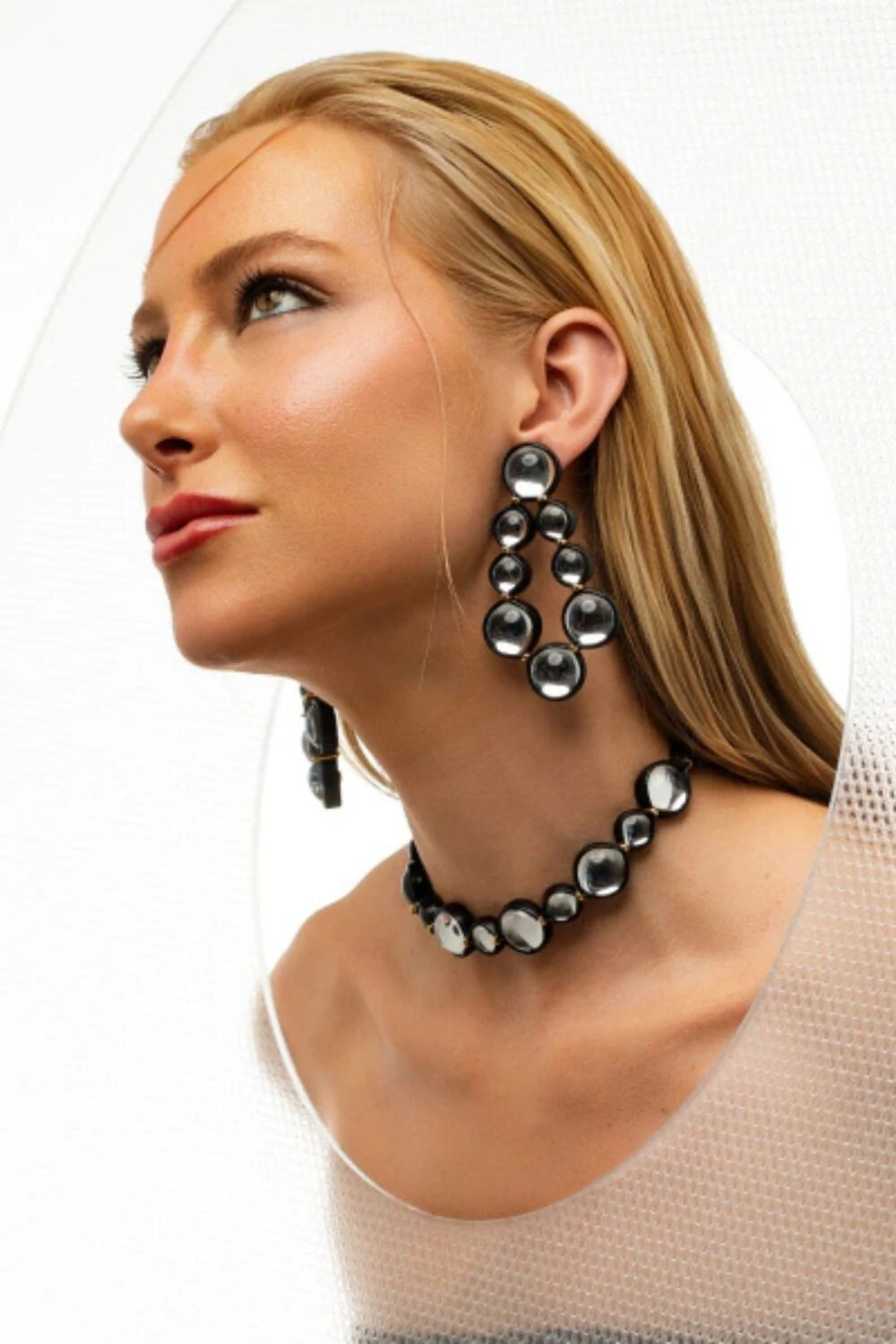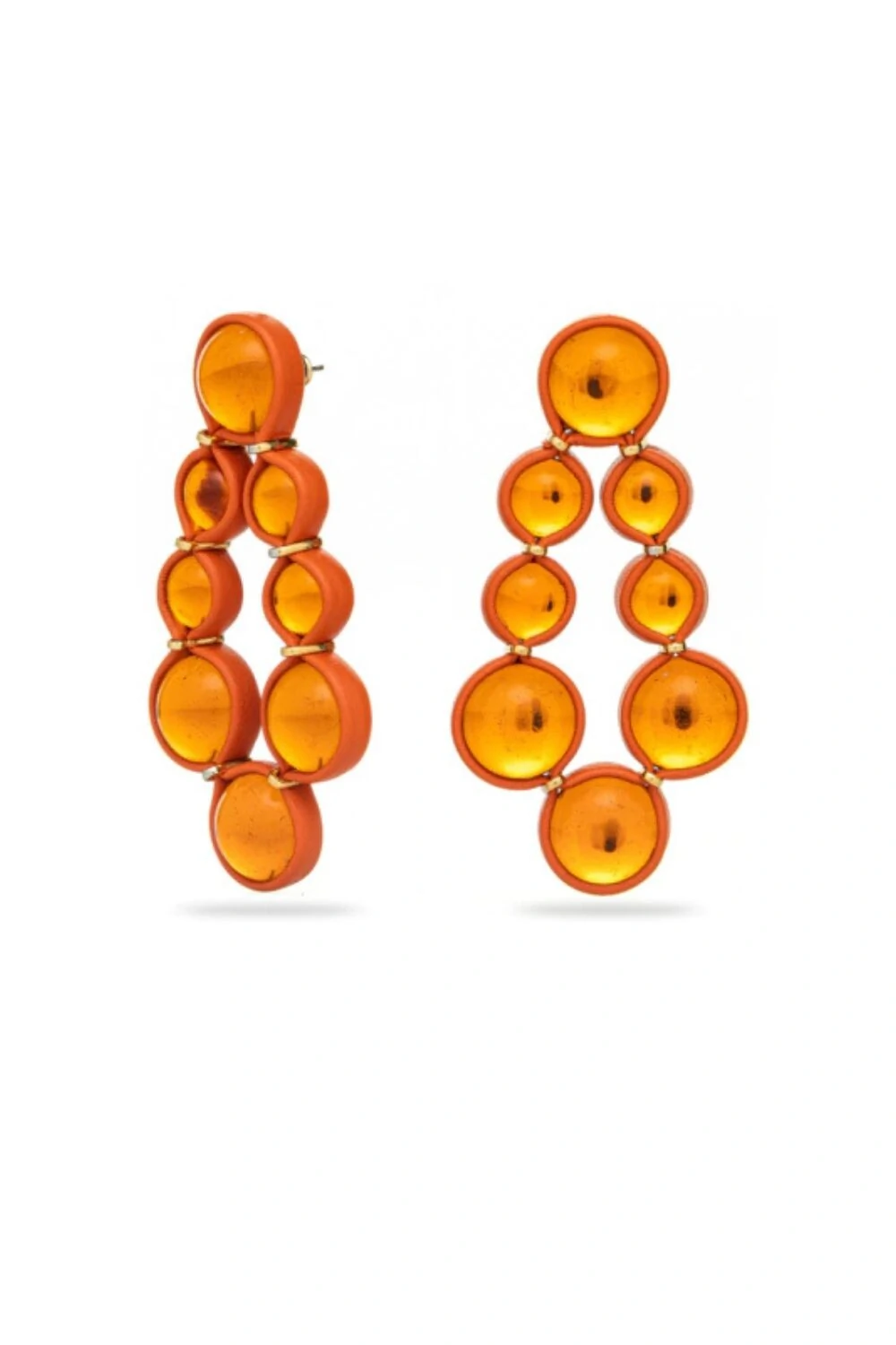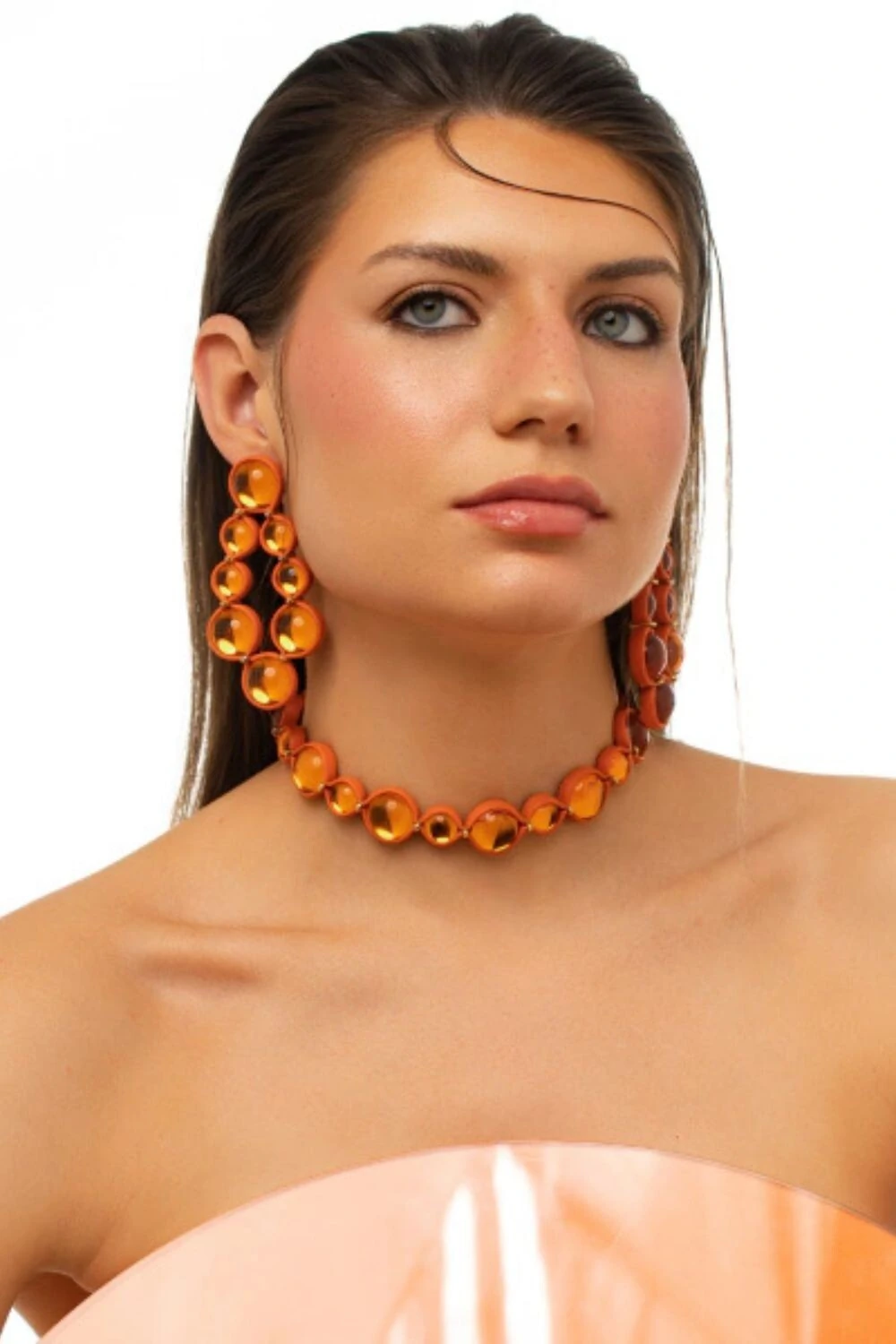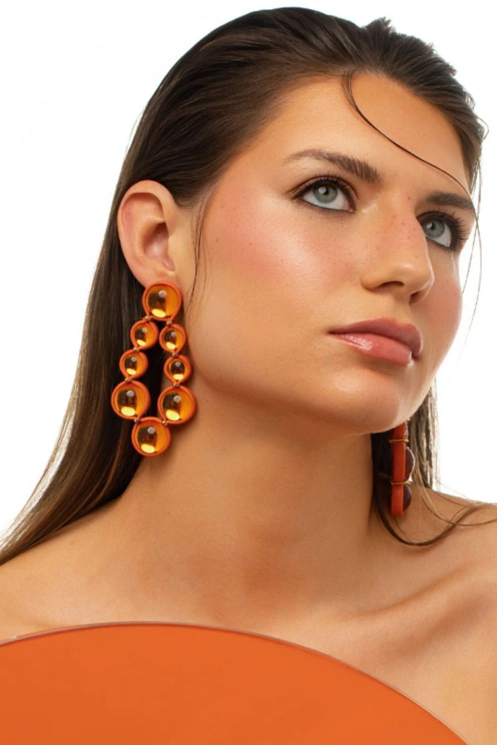 O Brinco Sun é a representação destas gotículas aglomeradas, onde pedras acrílicas com uma camada translúcida fazem referência a água. O couro moldado a mão com a inconfundível excelência da marca, arremata essa peça de cores intensas que vibram o alto astral de um verão marcante