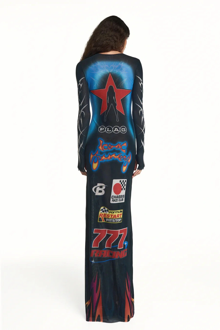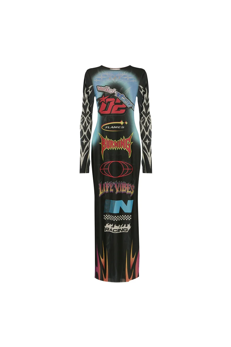 Vestido longo em tule estampado com elasticidade, modelagem justinha ao corpo e acabamento à fio. Possui decote redondo e manga comprida. Detalhe de elástico embutido no decote para maior ajuste e conforto ao corpo. Não possui fechamento.