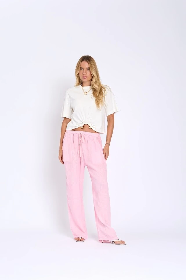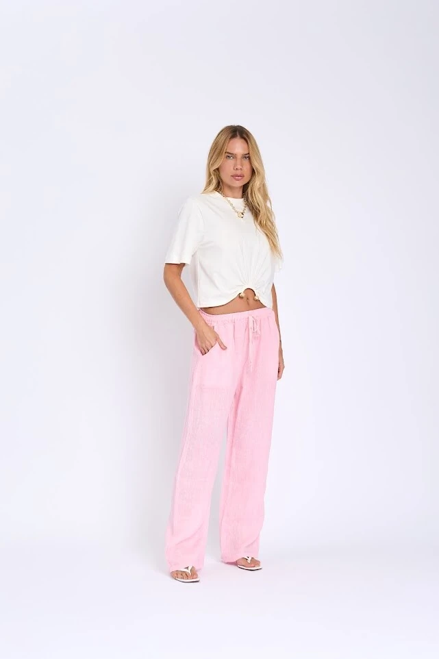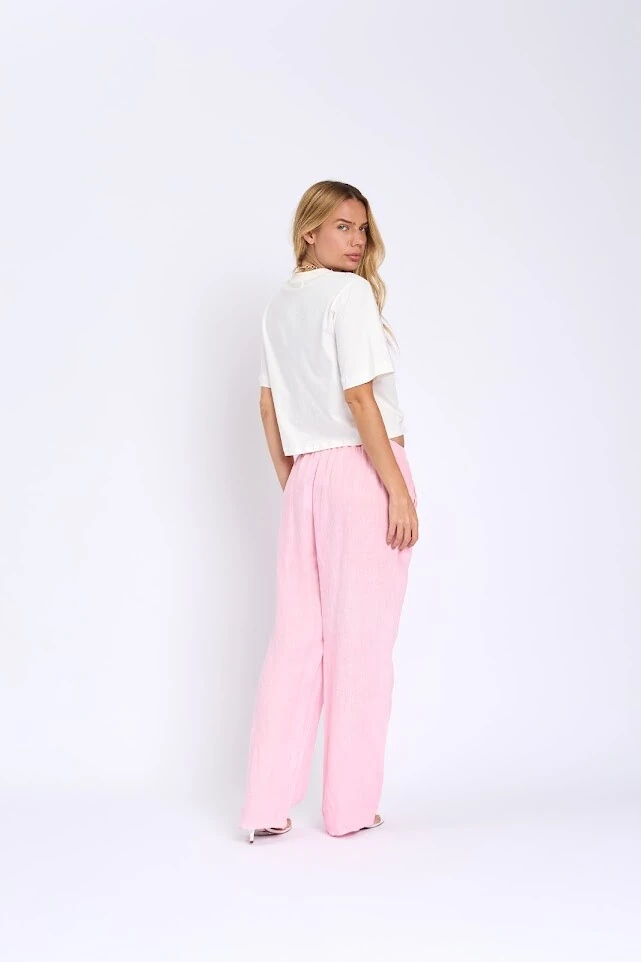 A blusa branca é confeccionada em malha de algodão de média elasticidade. A peça solta ao corpo, possui decote redondo com acabamento canelado, mangas curtas, detalhe metálico com nome da marca gravado aplicado na parte frontal da barra, efeito franzido frontal e comprimento cropped*.