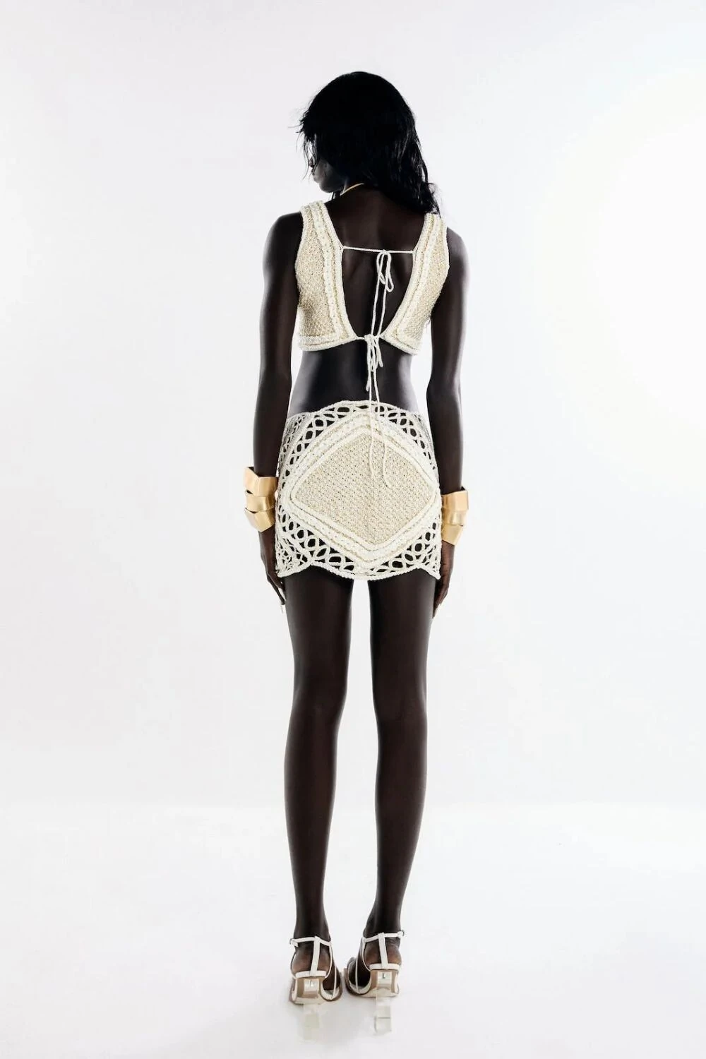 Perfeito para aquelas férias especiais, nosso belíssimo Vestido Relicário combina crochê moderno com design escultural. O estilo abraça o corpo e apresenta recorte sexy na lateral da barriga e costas, afinando a cintura. Possui cor off white e cintilante em dourado na sua base. Possui amarração nas costas.