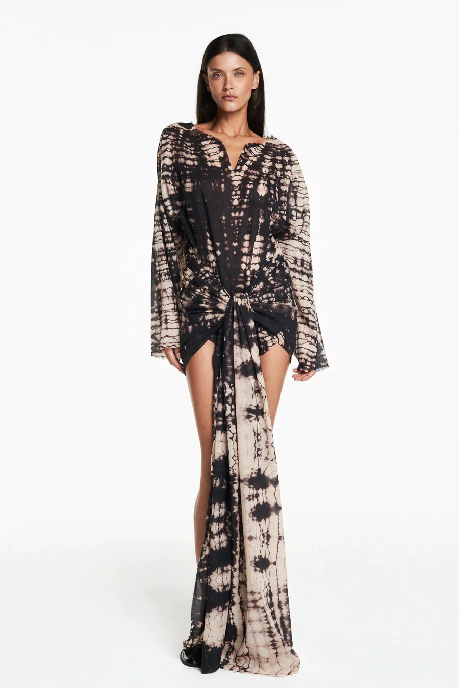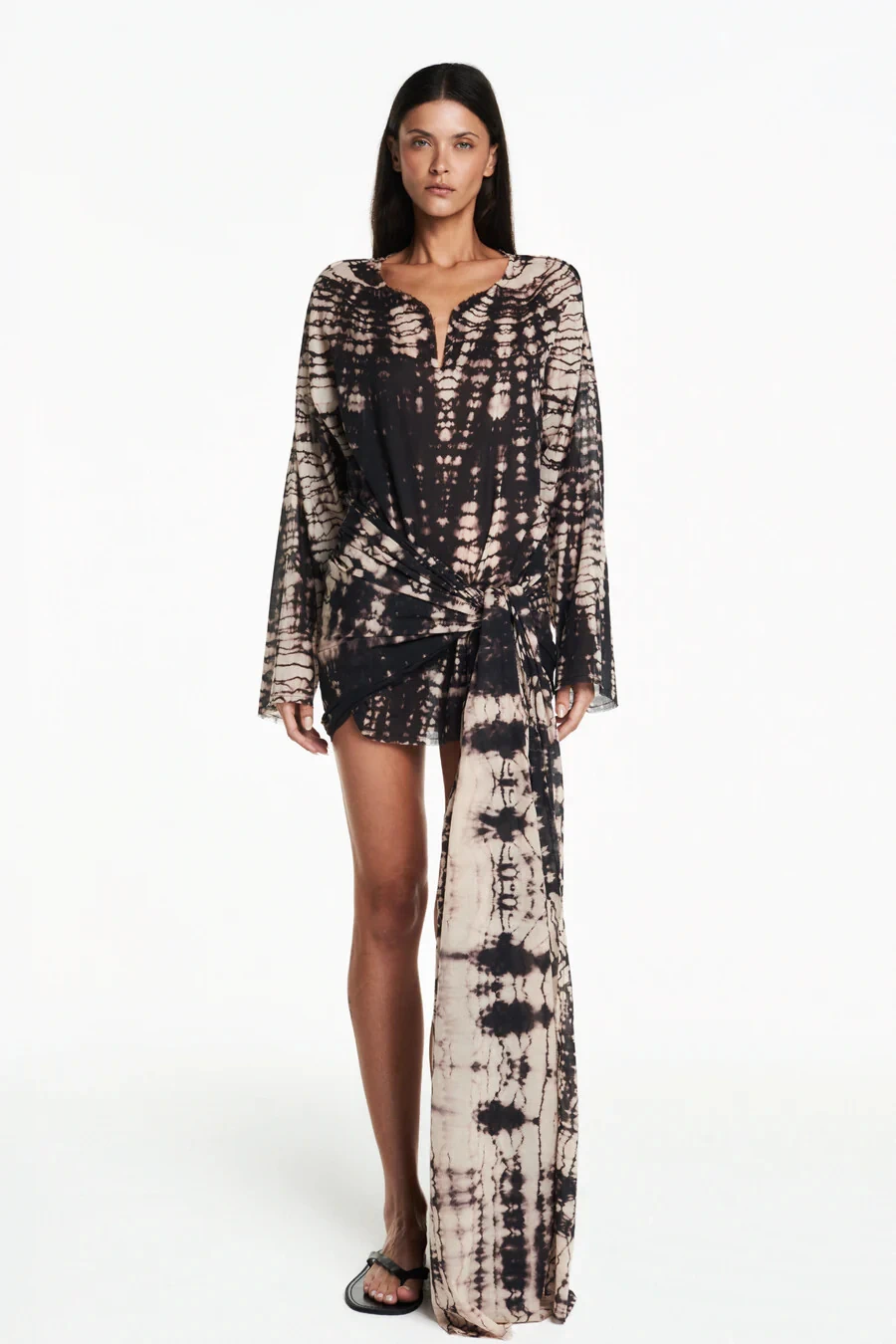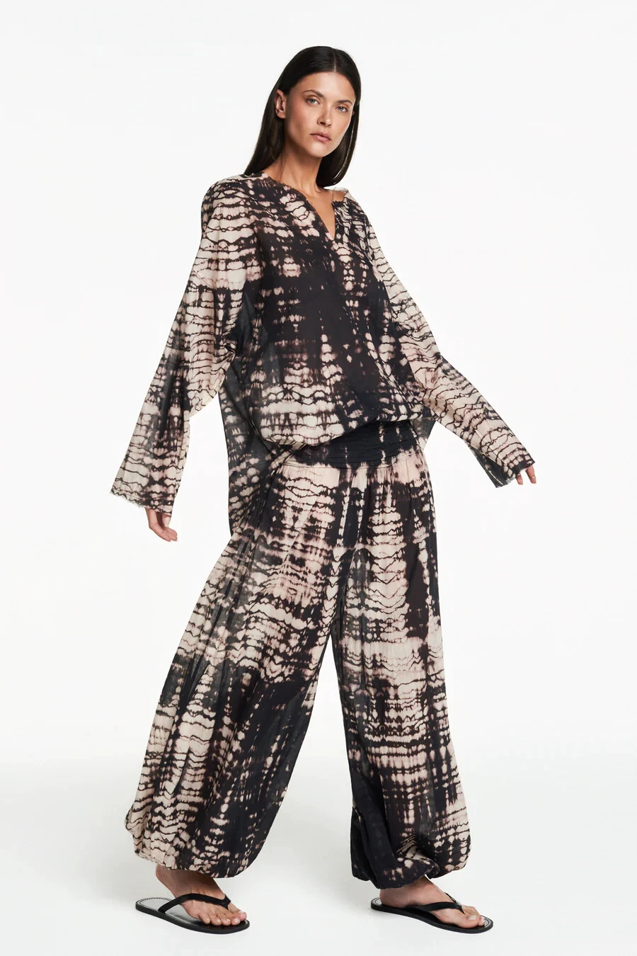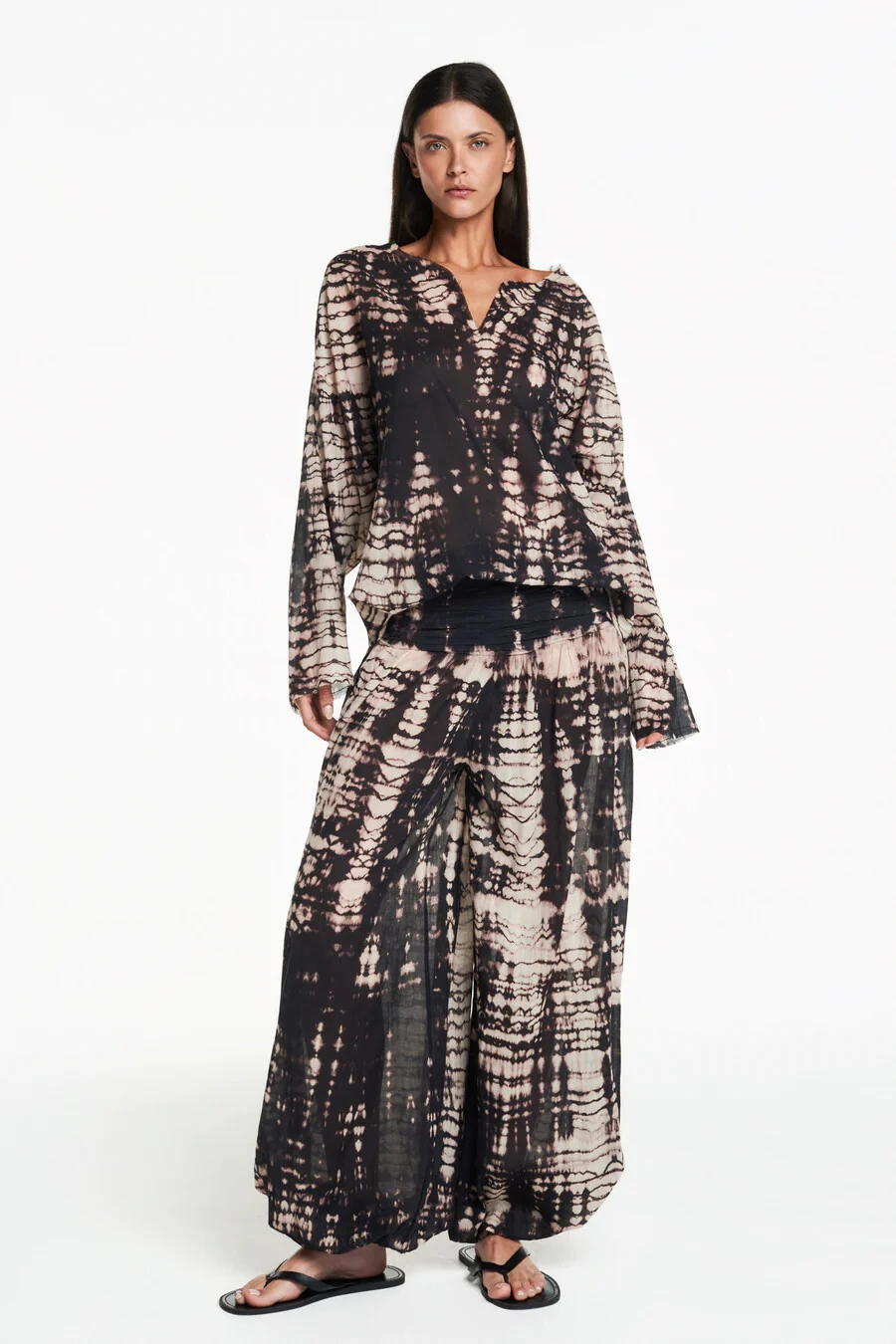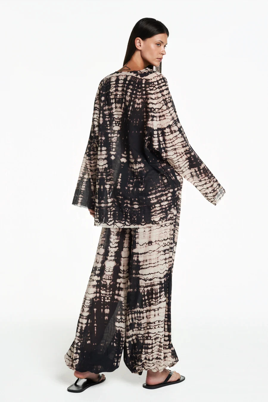 Bata em algodão tie dye com acabamento á fio. Modelagem ampla e mangas compridas bufantes. Não possui fechamento.
