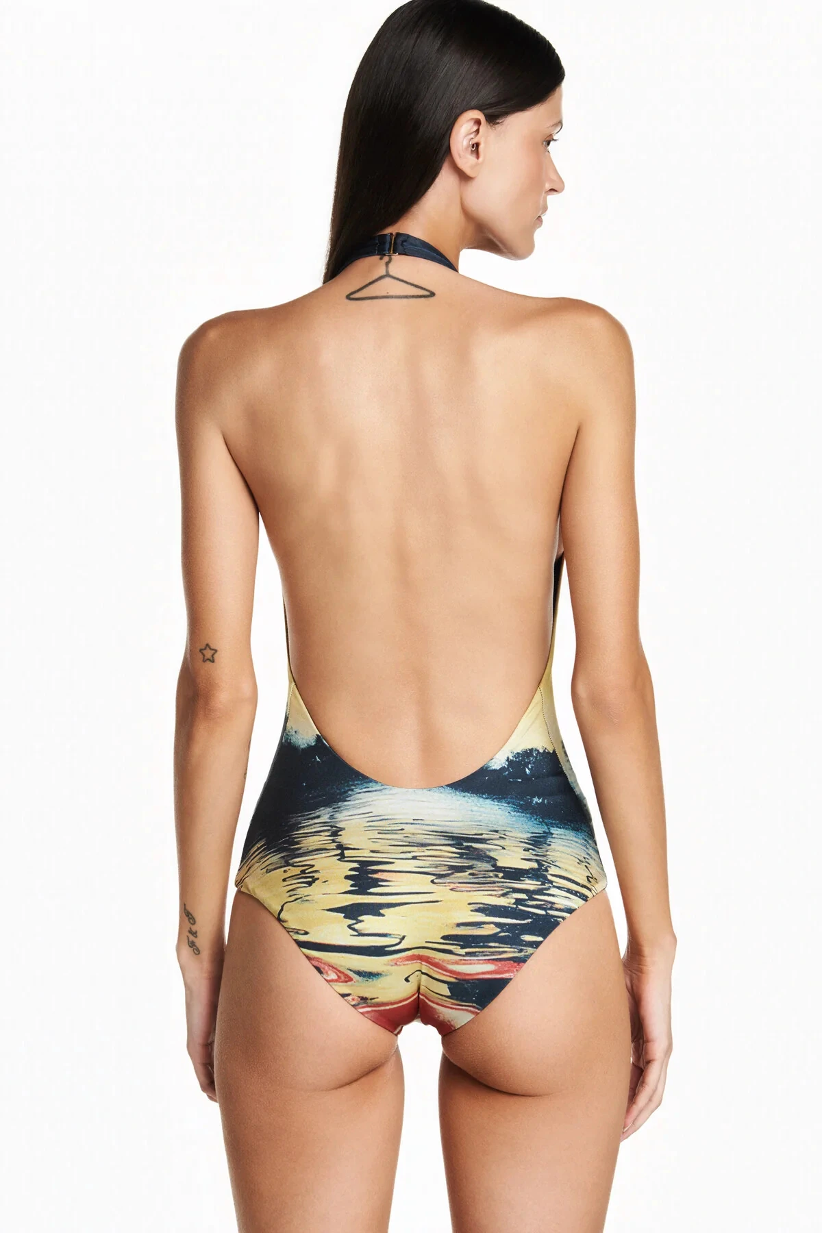 Maiô em malha com elasticidade e forro embutido de poliamida. Modelagem justinha ao corpo. Possui decote v profundo frente única com elástico embutido para melhor ajuste e conforto ao corpo. Não possui fechamento.