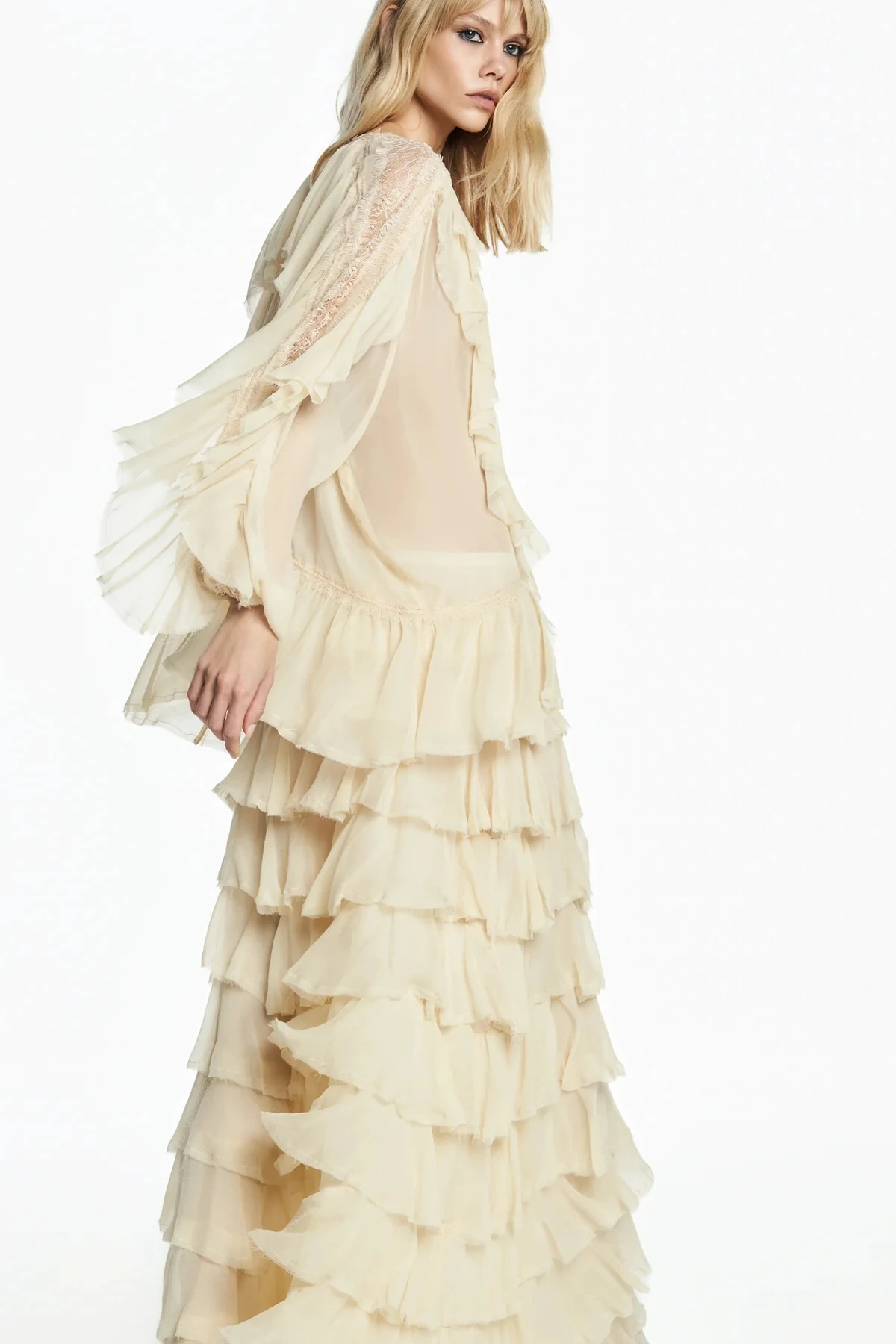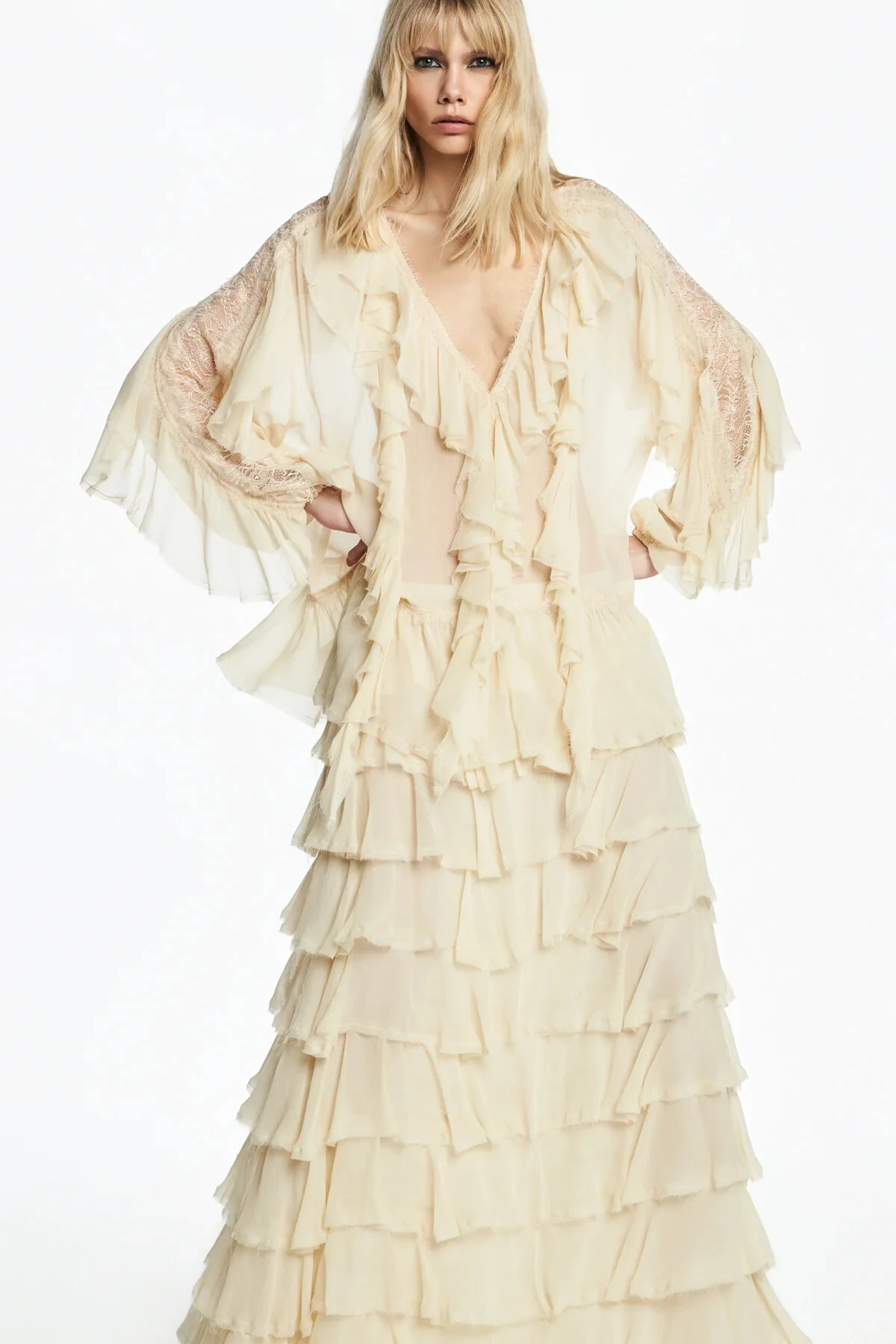 Bata em crepe leve texturizado com modelagem ampla e decote V. Possui manga comprida com detalhe franzido e elástico embutido. Sobreposição de babados a fio e aplicação de rendas por toda a peça. Não possui fechamento.
