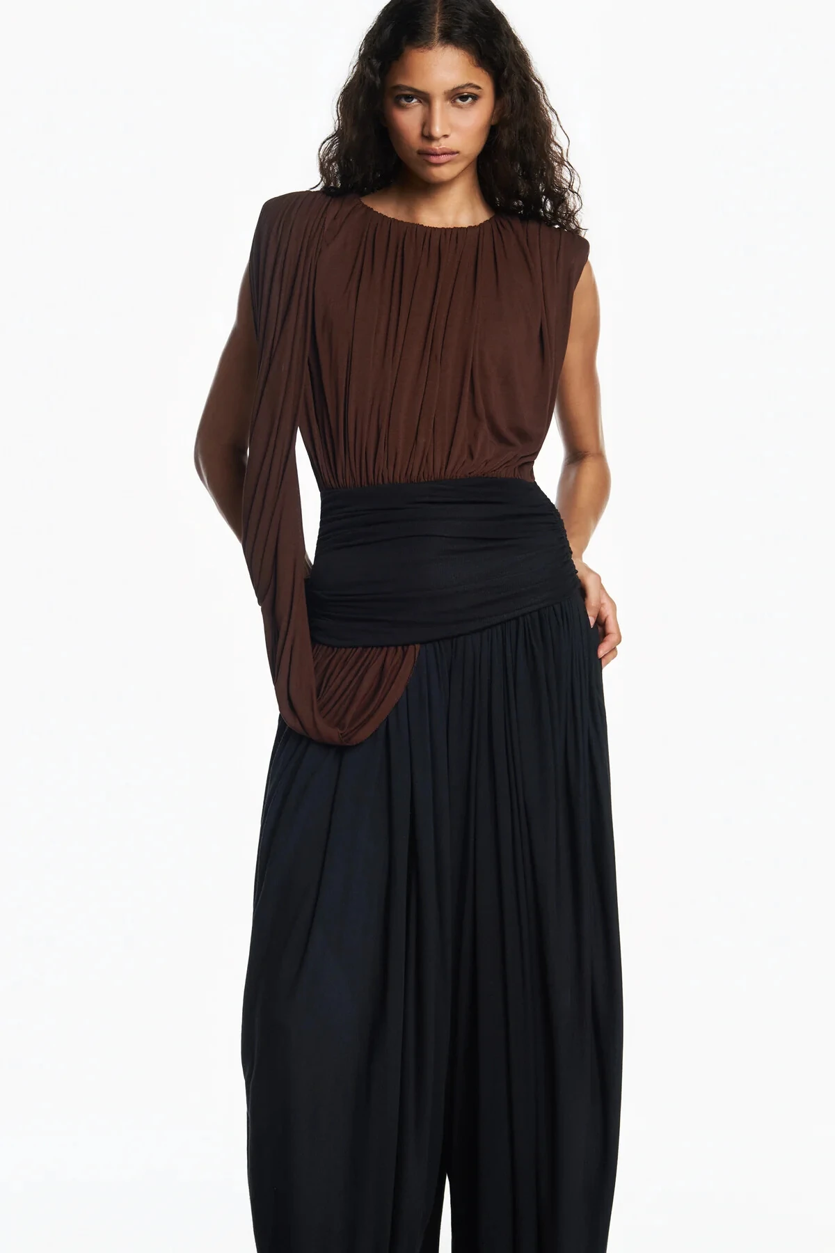 Blusa bicolor em malha com elasticidade e toque macio. Modelagem ajustada ao corpo. Possui drapeado caído no braço direito, forro embutido, ombreiras para melhor sustentação e detalhe franzido na pala da cintura. Fechamento por abotoamento na nuca.