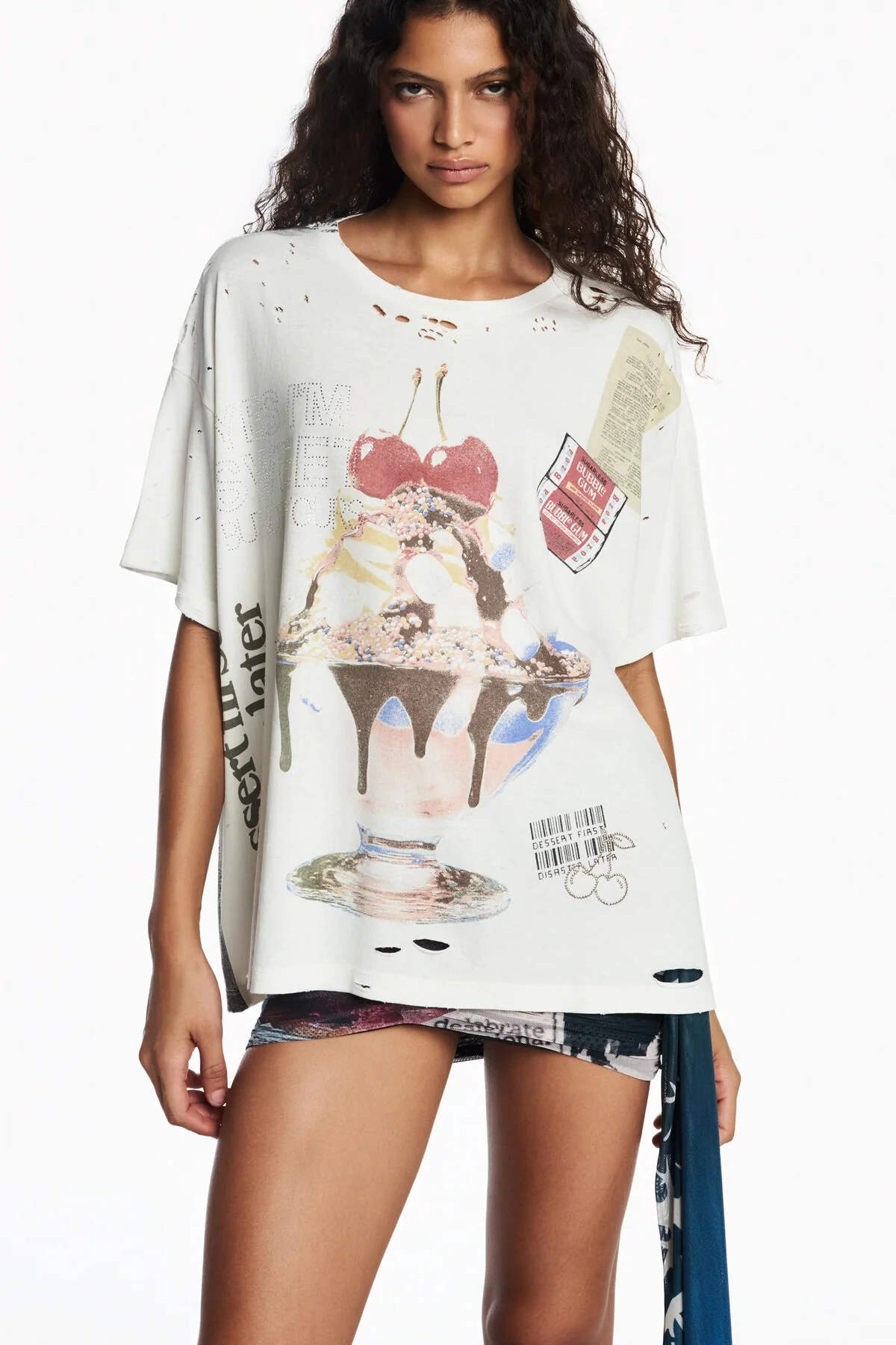 Camiseta em algodão com modelagem ampla e estampa localizada na frente e atrás da peça. Possui aplicação de pedrarias, hotfixes e efeito destroyed por toda a peça, decote redondo e manga curta. Não possui fechamento. Produto com adesivos exclusivos personalizados em quantidade limitada.
