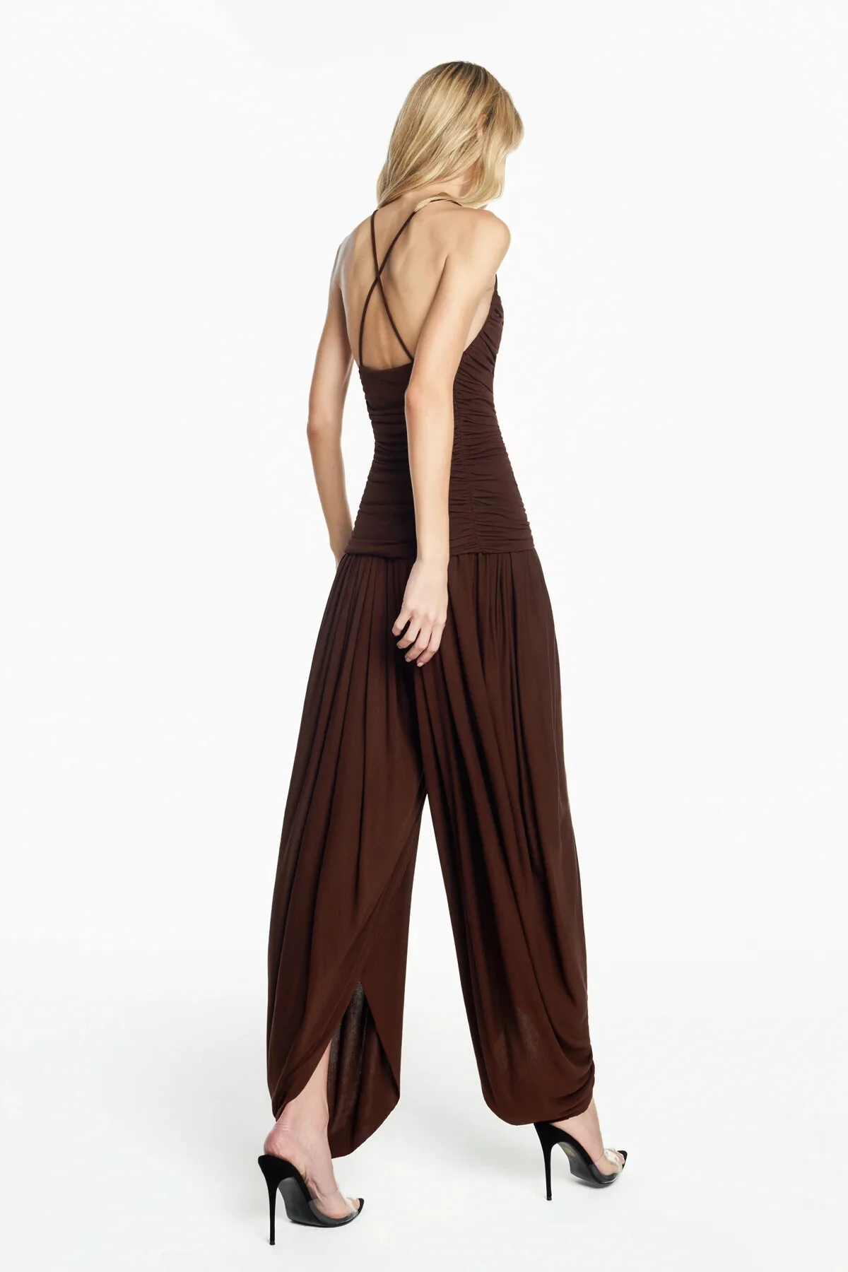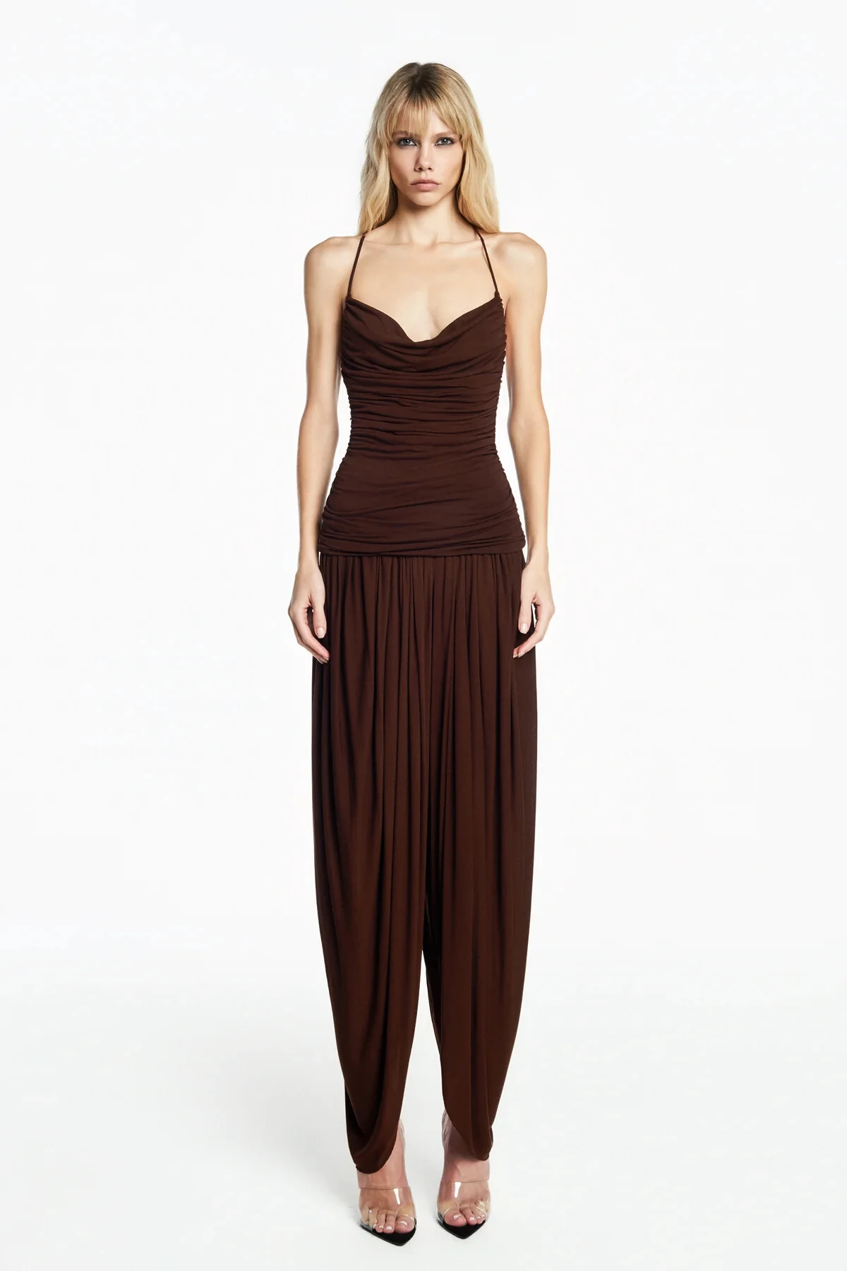 Saia longa drapeado frontal cetim