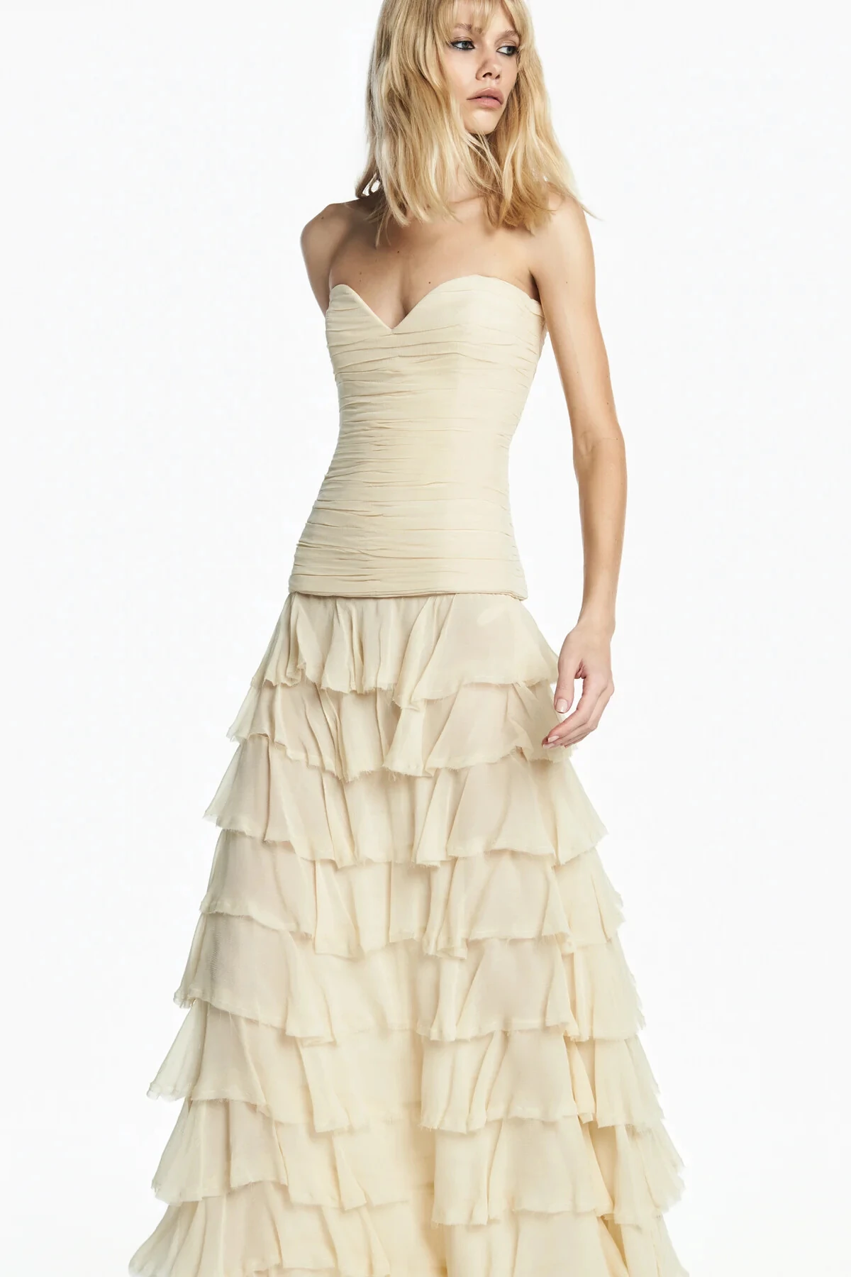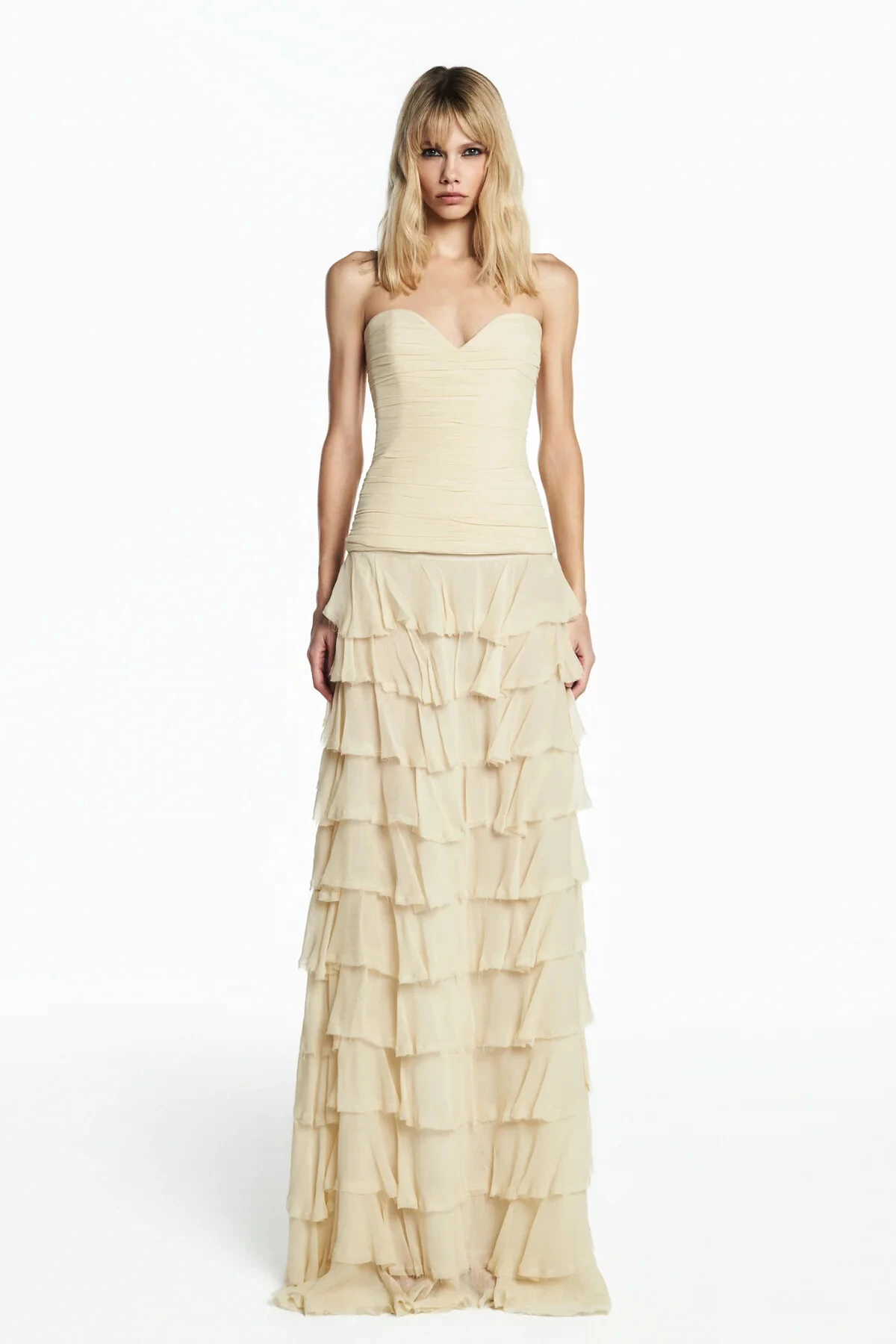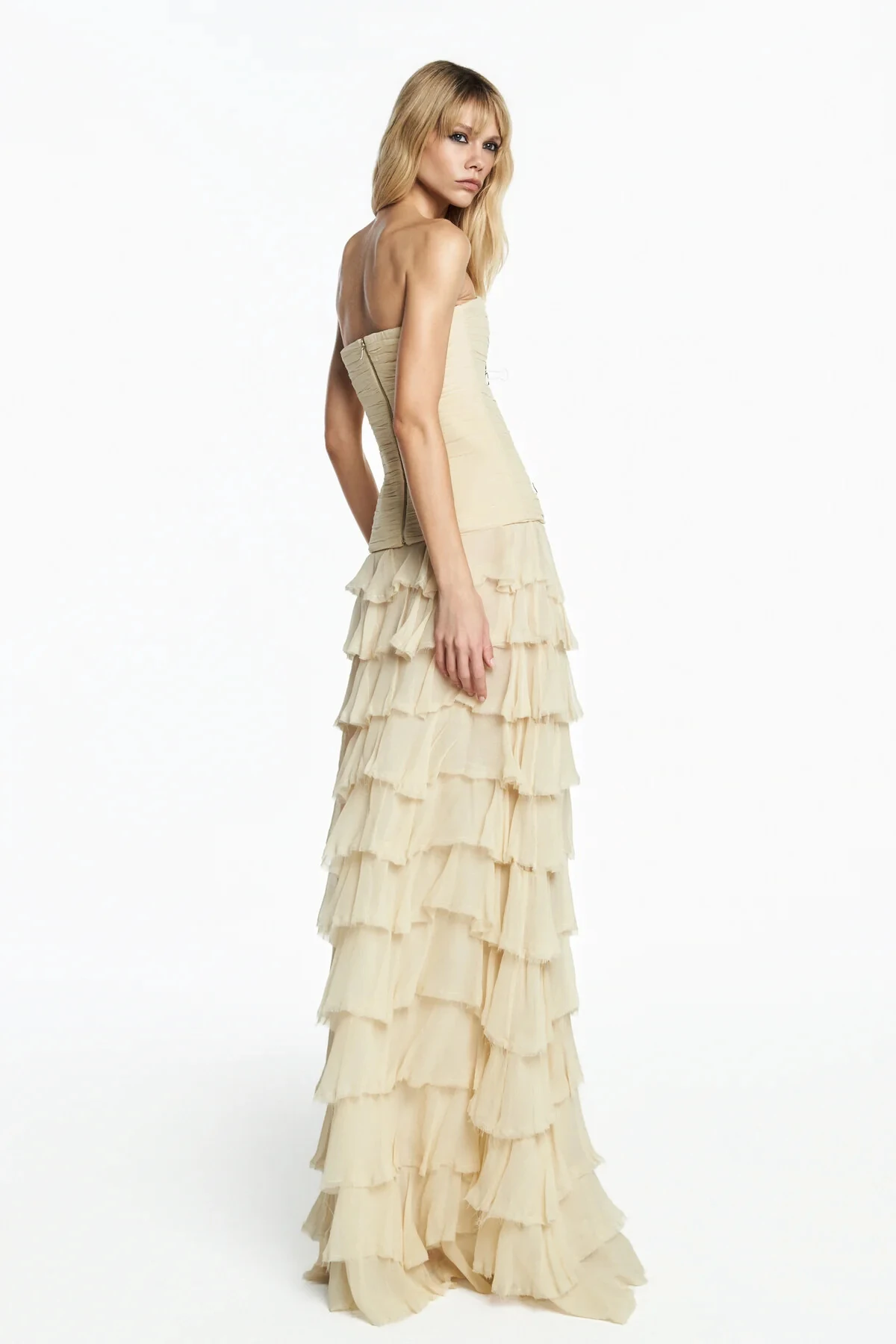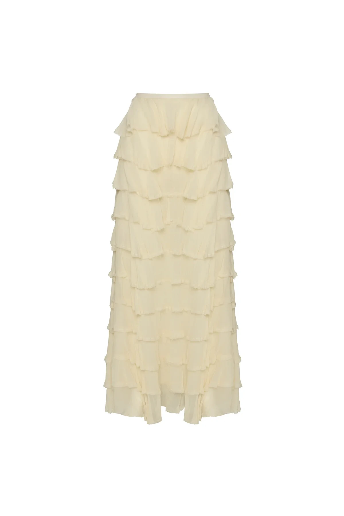 Saia comprida em crepe leve texturizado com modelagem reta e shape soltinho. Possui sobreposição de babados por toda a peça, trazendo movimento e leveza. Fechamento por zíper invisível.