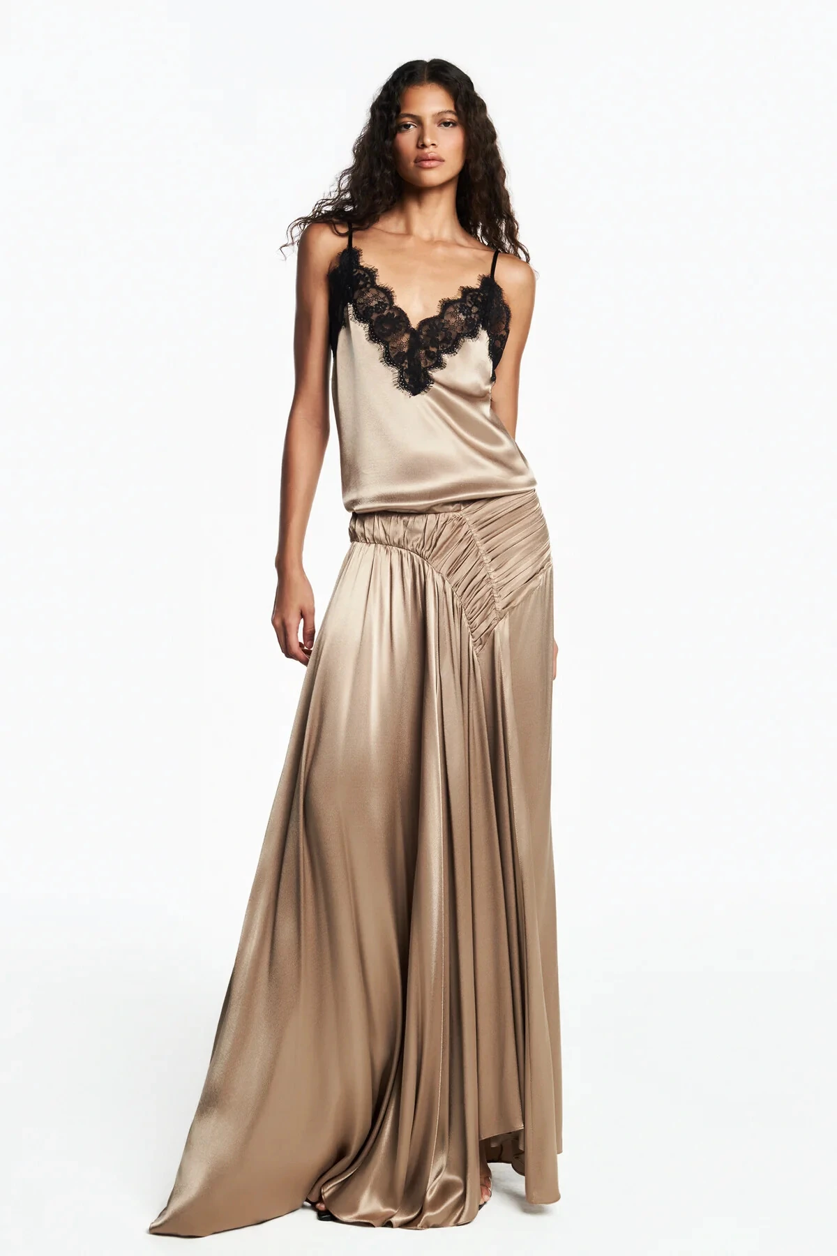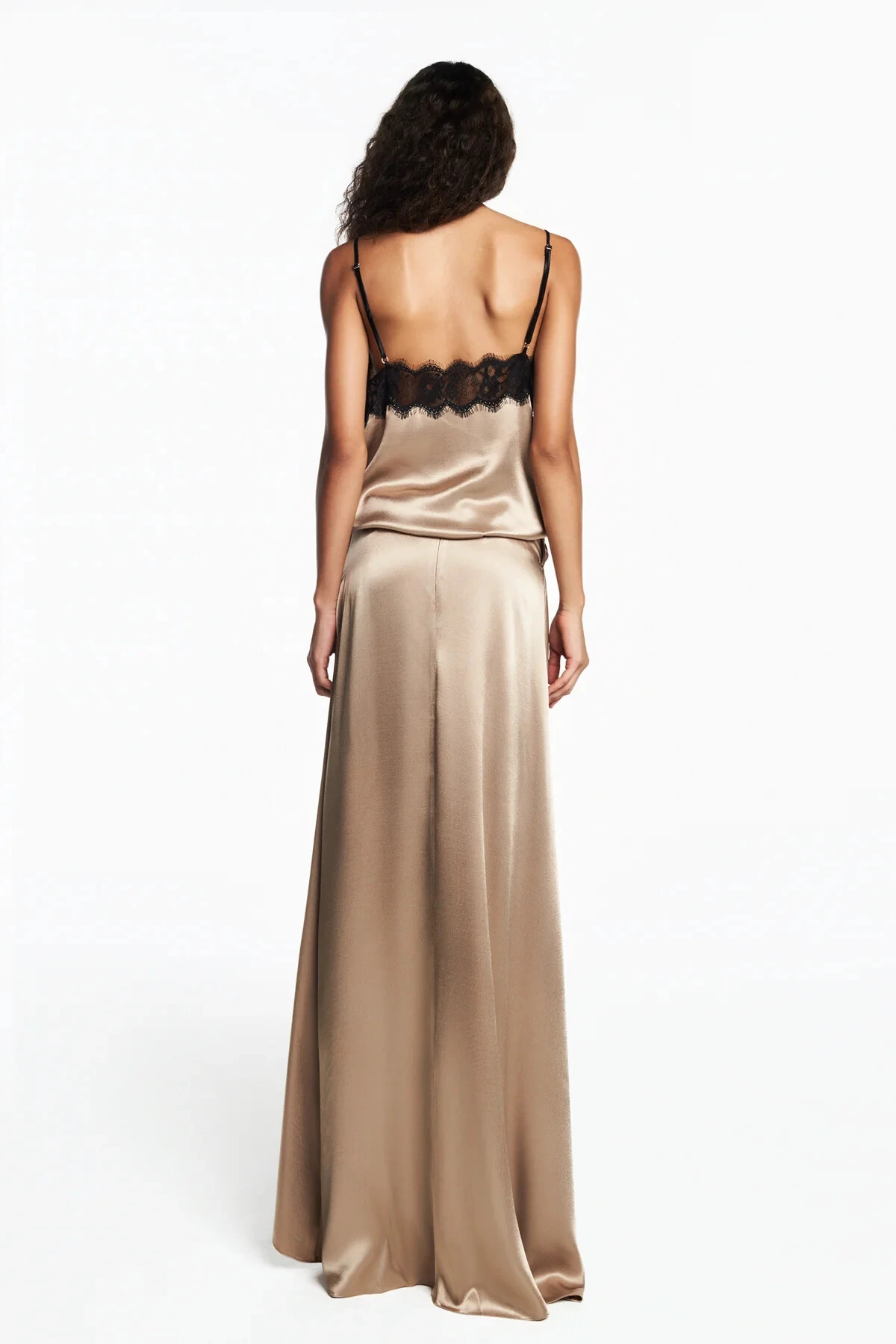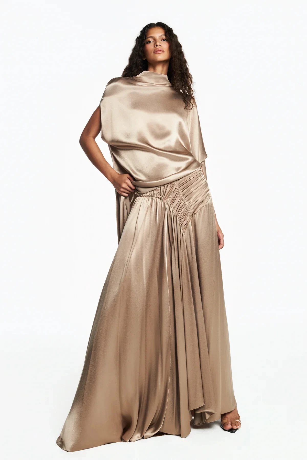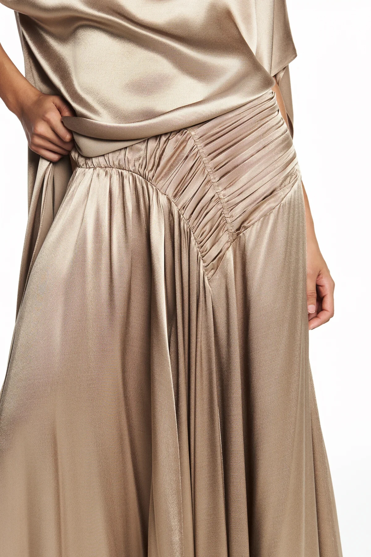 Saia longa em cetim com suave brilho e drapeado frontal com recorte assimétrico. Possui modelagem fluida ao corpo e shape soltinho. Fechamento por zíper invisível na lateral da peça.