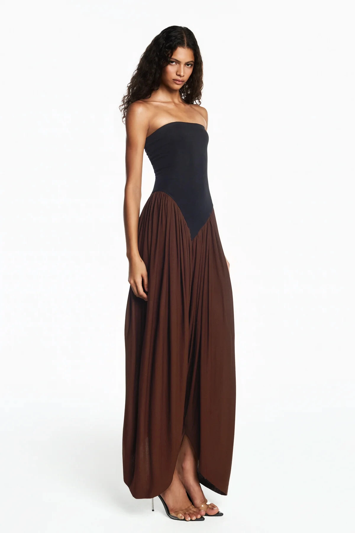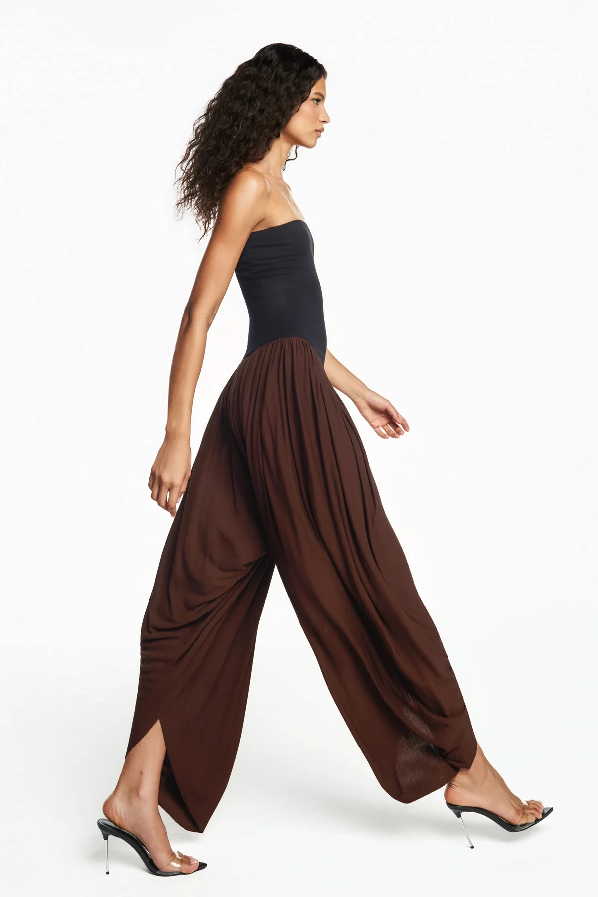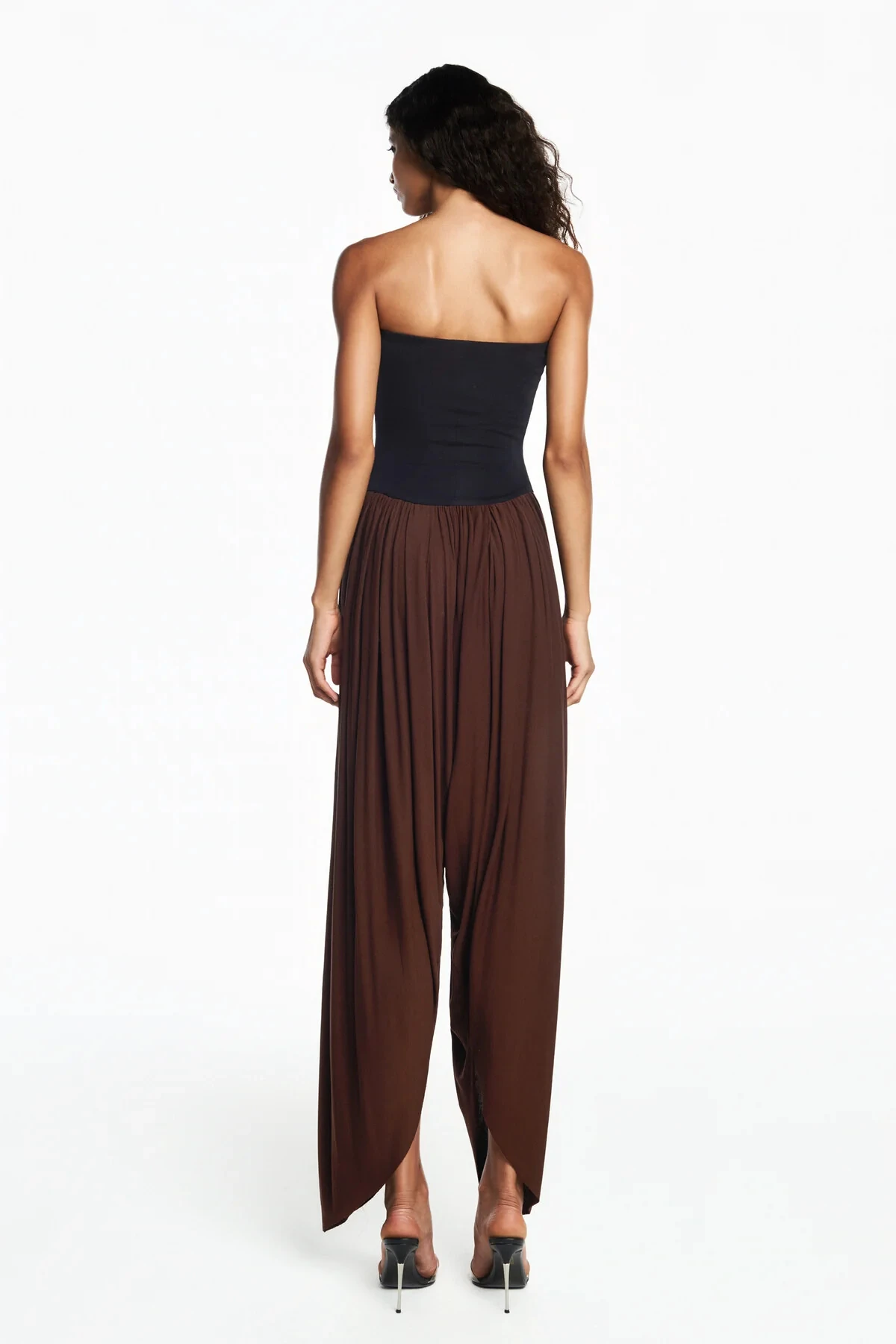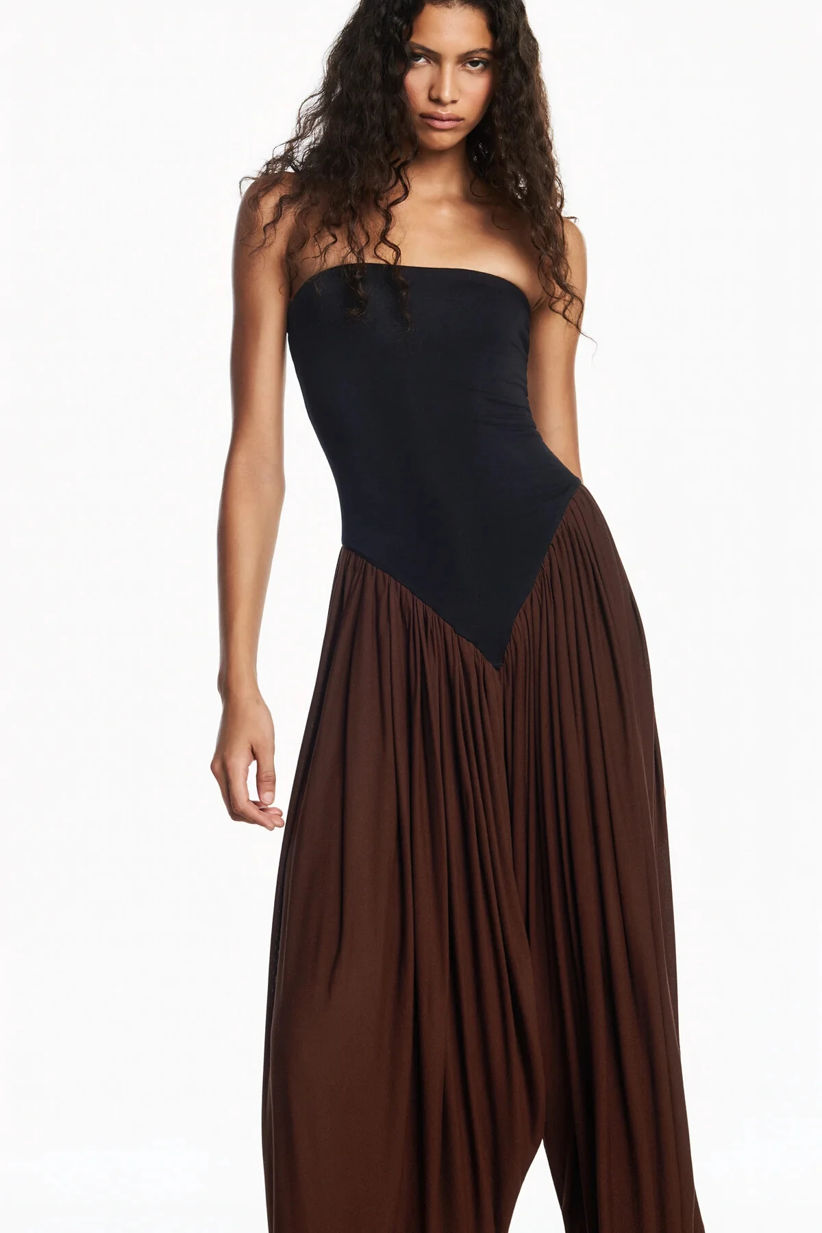Macacão bicolor em malha com elasticidade e toque macio. Possui modelagem saruel com shape justinho ao corpo, decote tomara que caia e detalhe franzido diagonal no quadril. Elástico embutido no busto e no quadril para melhor ajuste e conforto ao corpo. Não possui fechamento.