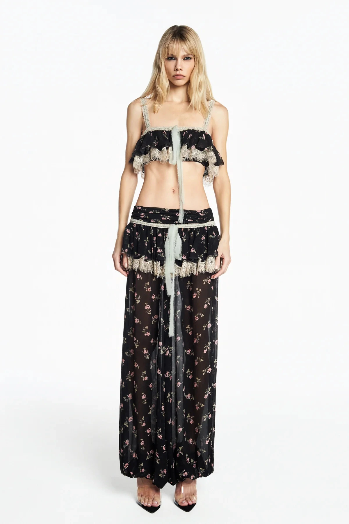 Top em chiffon com estampa floral. Possui shape soltinho, decote de renda com passa fita a fio, detalhe de renda no busto e no acabamento e alças fixas. Não possui fechamento.