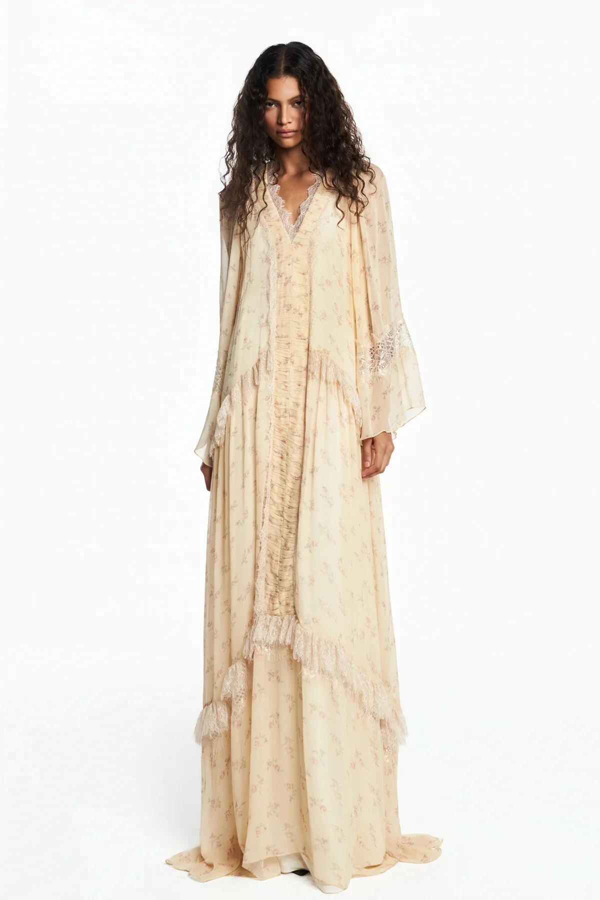 Vestido longo em renda com transparência, estampa floral e modelagem fluida com shape soltinho. Possui decote V, mangas compridas com punho franzido, e detalhe de rendas vazadas por toda a peça. Não possui fechamento. Acompanha combinação (Camisola).