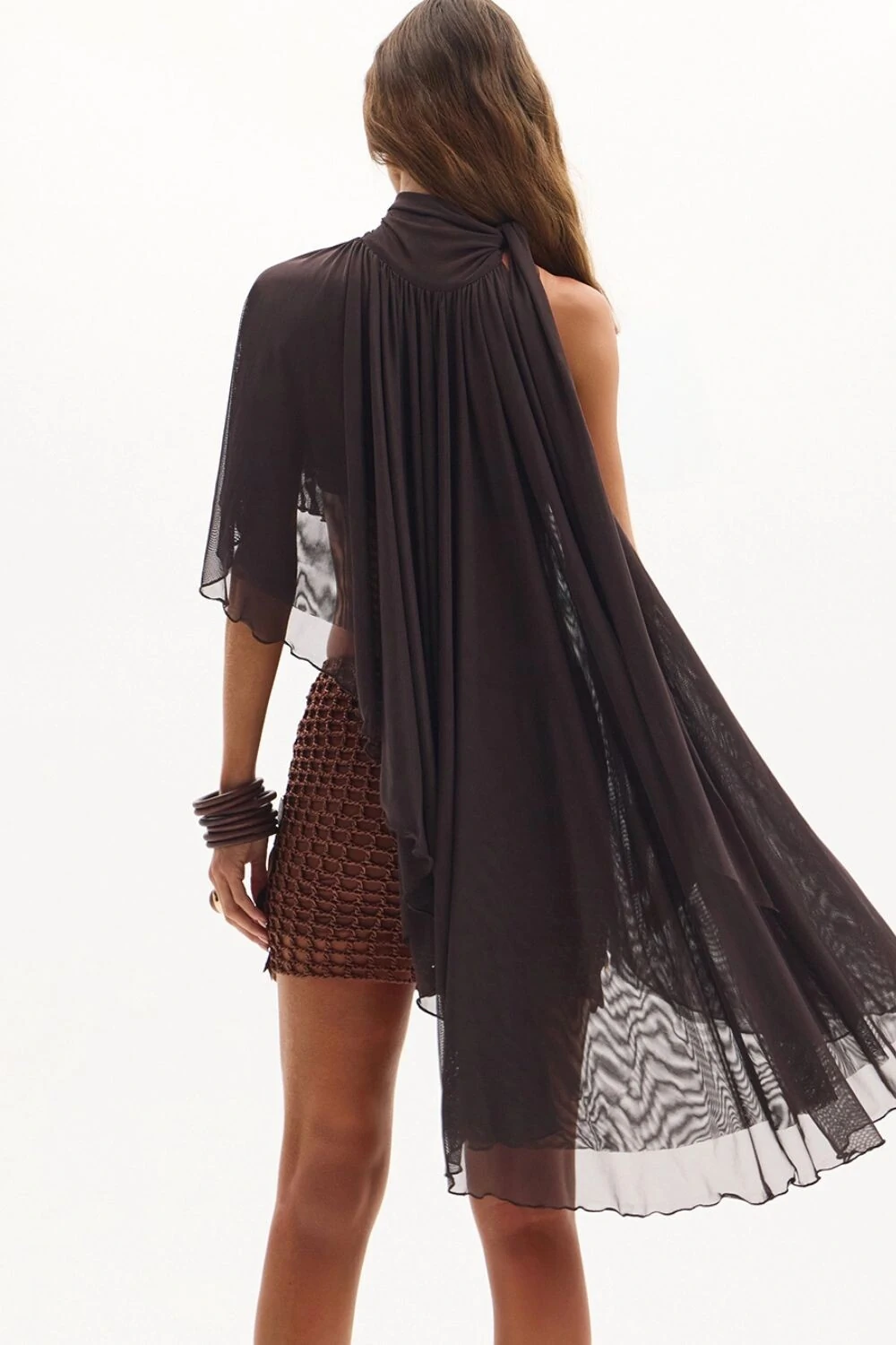 Detalhes: Amarração delicada no pescoço, transparência elegante e acabamento esvoaçante que acompanha o movimento do corpo.