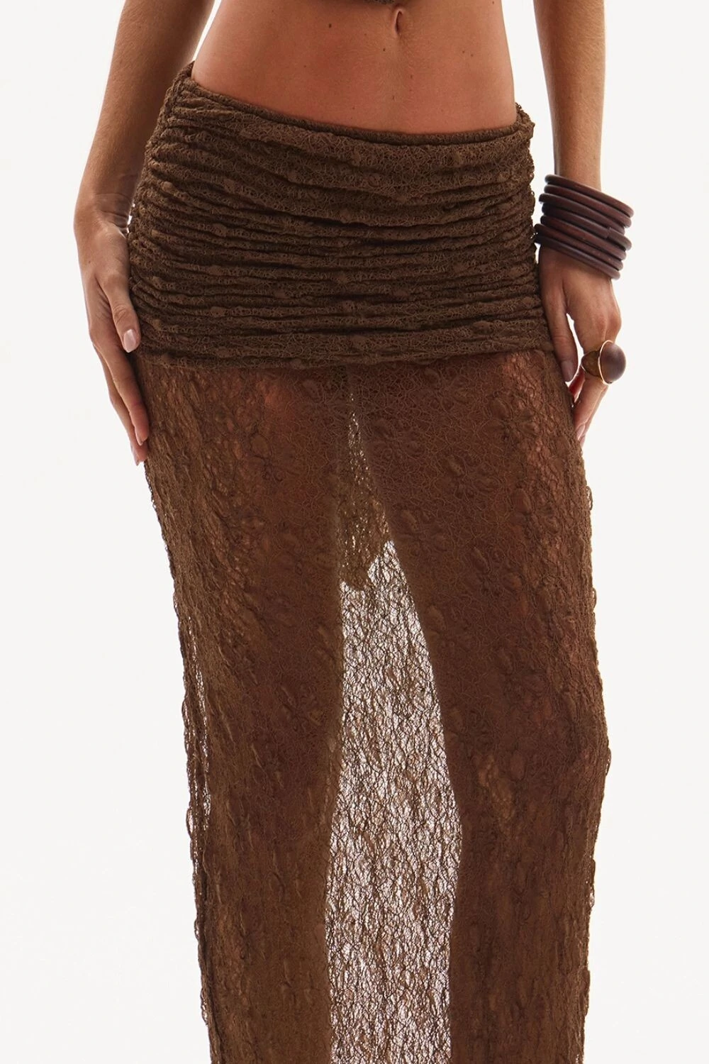 Design: Um duo que equilibra sensualidade e elegância. A blusa apresenta decote degagê (cowl neck) com drapeado fluido no busto e modelagem frente única. A saia longa de cintura baixa desenha a silhueta com um rico trabalho de franzidos no quadril, finalizando em um caimento levemente transparente e fluido.