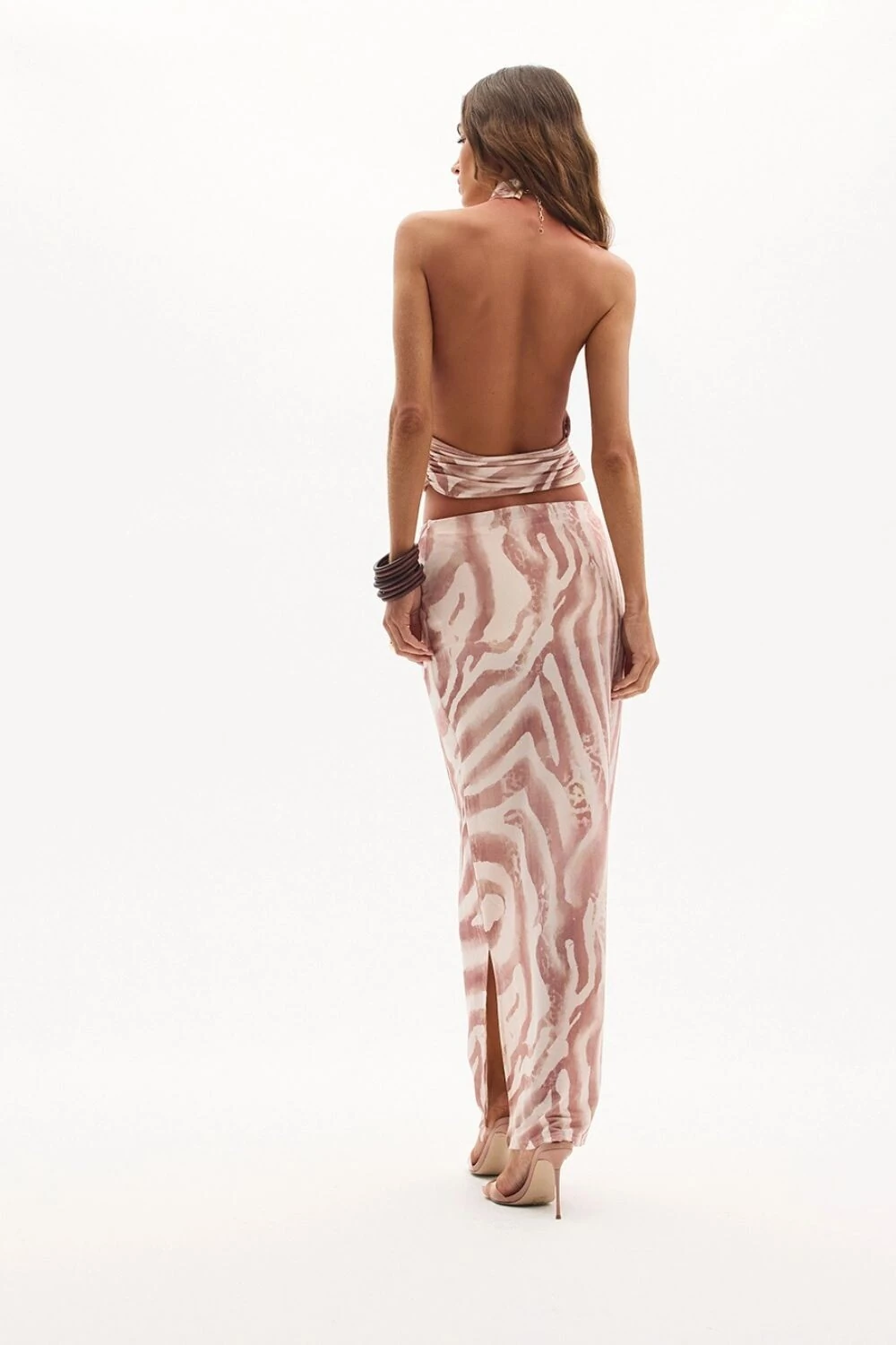 Detalhes: A blusa possui costas totalmente nuas, com fechamento na nuca através de um luxuoso hardware dourado e corrente ajustável. Franzidos estratégicos na base da blusa e no cós da saia elevam a textura da peça e esculpem a silhueta.