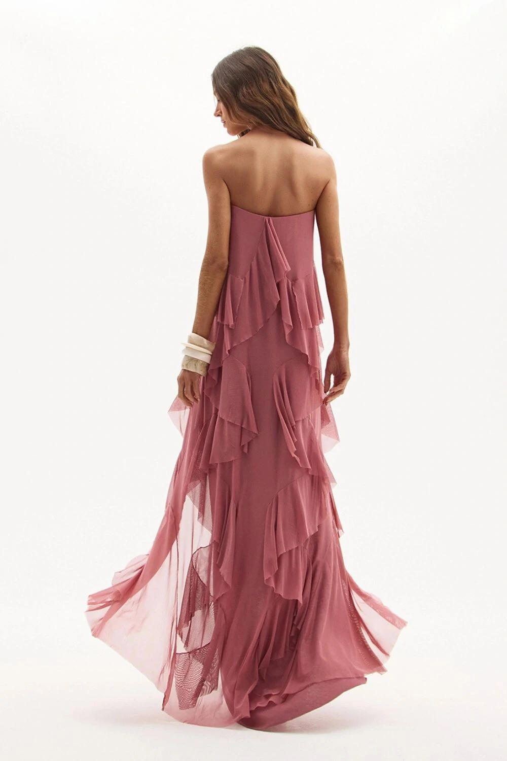 Detalhes: Camadas sobrepostas de babados leves em transparência sutil, com assimetria marcante e fenda frontal que valoriza o caminhar com delicadeza e movimento.