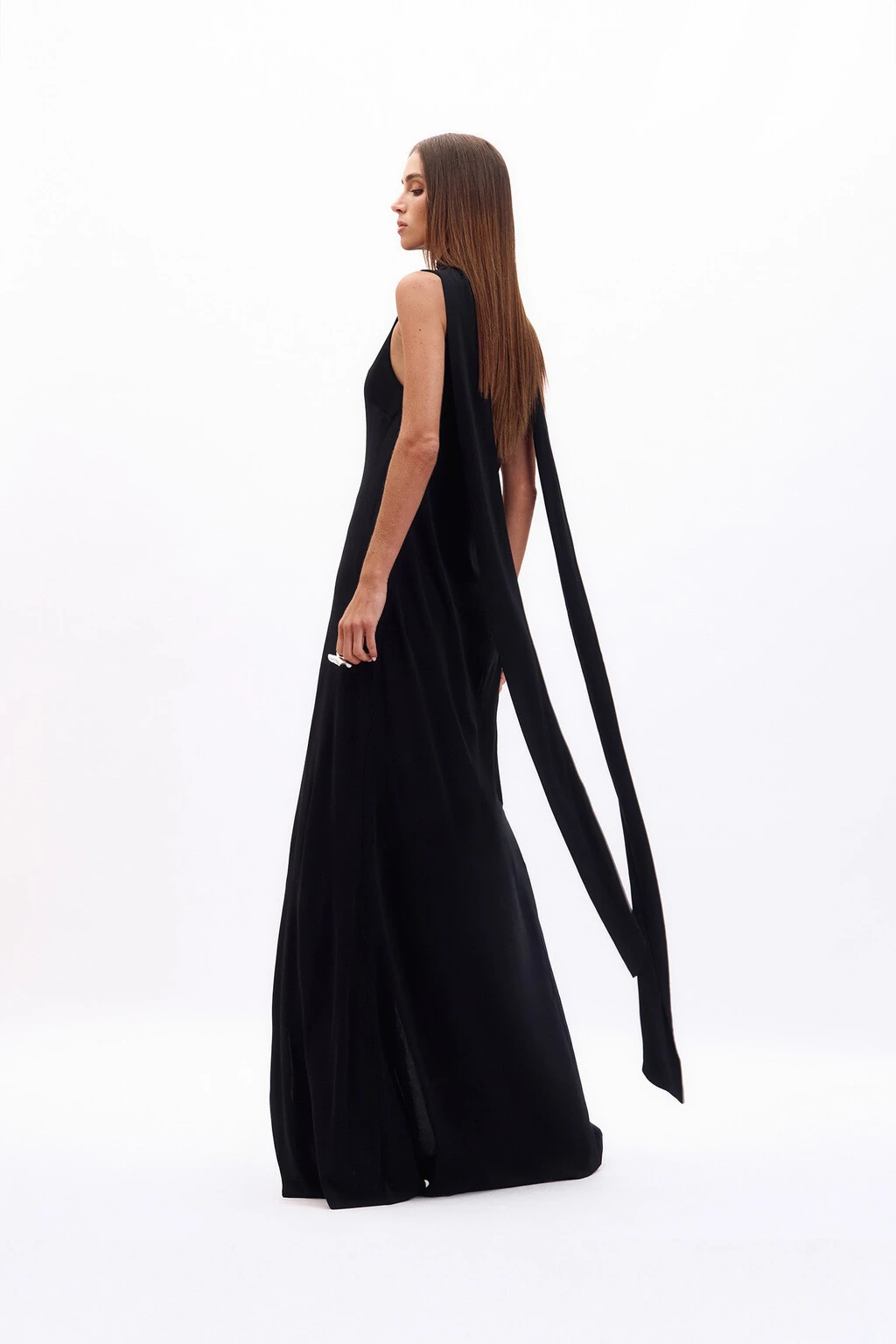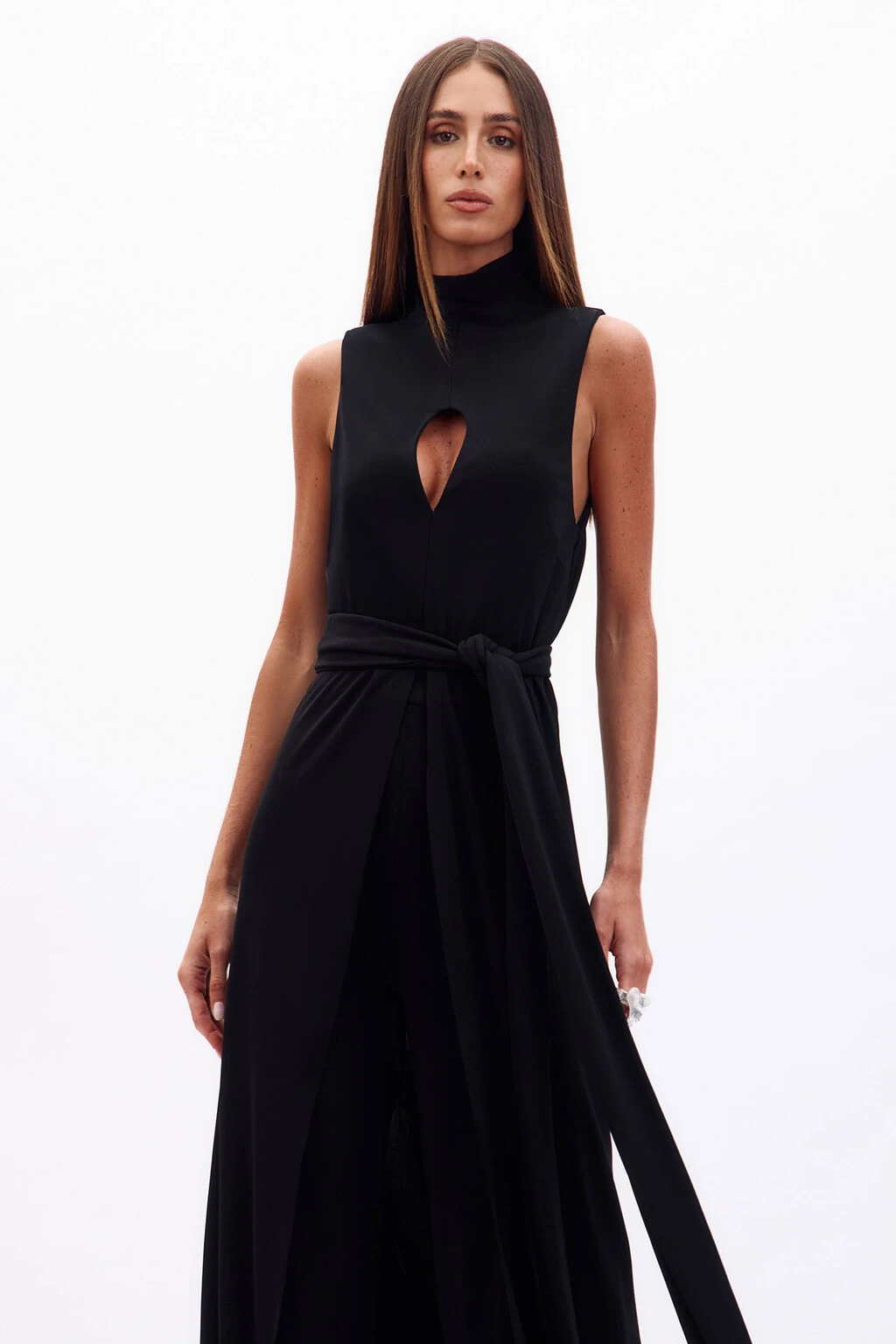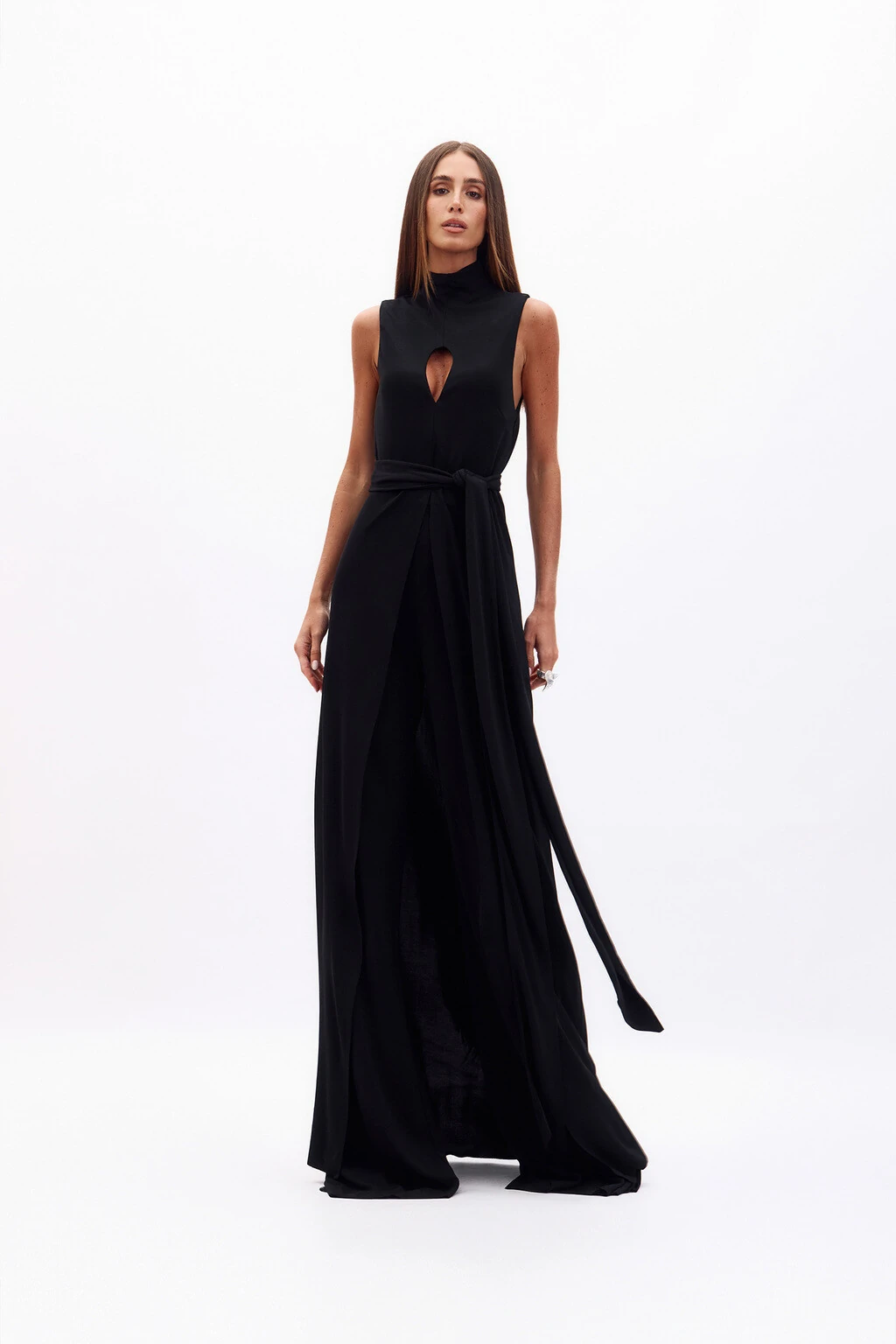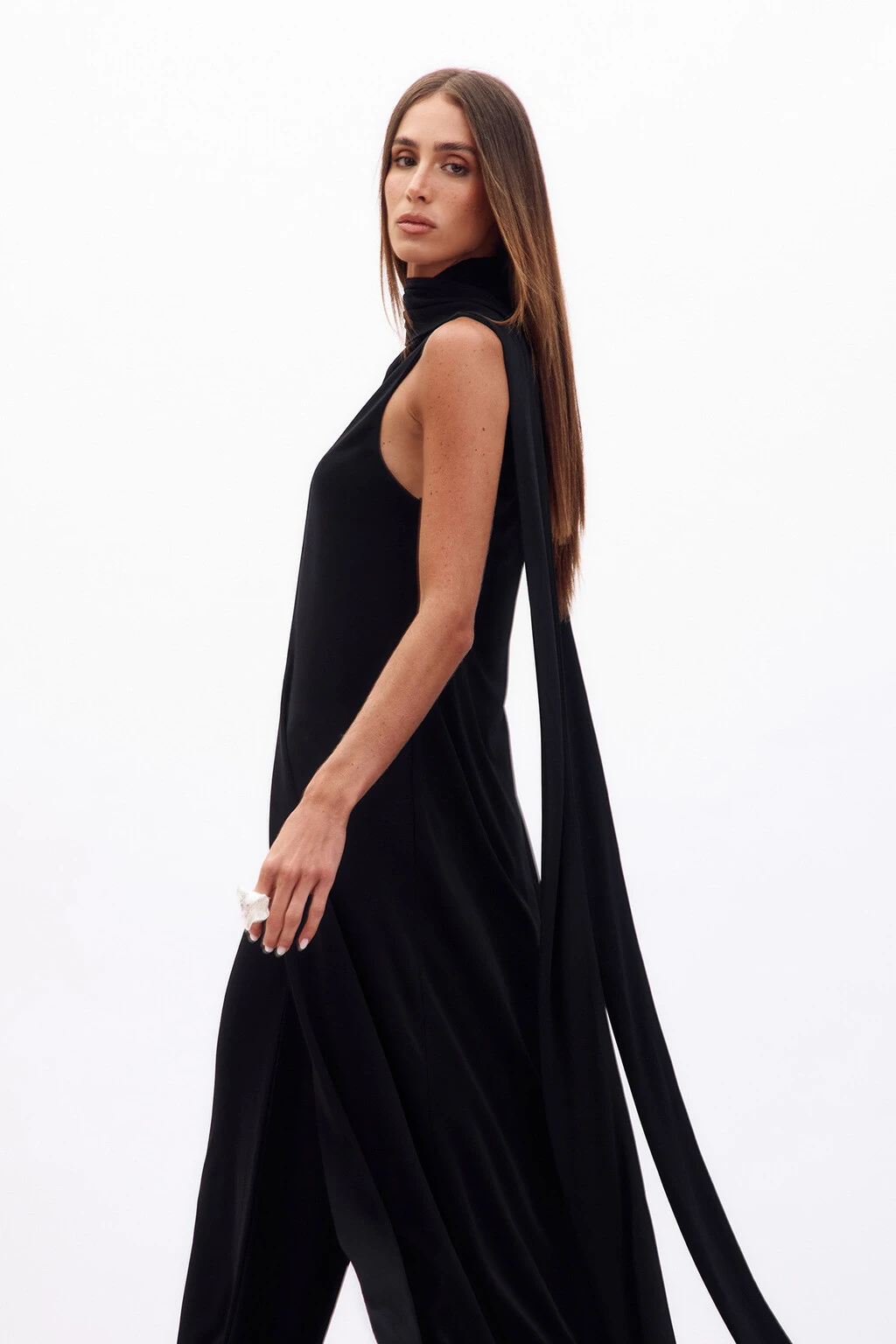 O conjunto Connie combina fluidez e presença. A blusa com modelagem de tunica e gola alta traz recorte frontal sutil que revela a pele com elegância, enquanto a capa alongada nas costas adiciona movimento e dramaticidade ao caminhar. A calça de modelagem ampla acompanha a silhueta com leveza e fluides. O look ainda acompanha uma faixa, permitindo diferentes criações. O conjunto equilibra minimalismo e força, pensado para ocasiões em que o essencial é marcar presença com naturalidade.