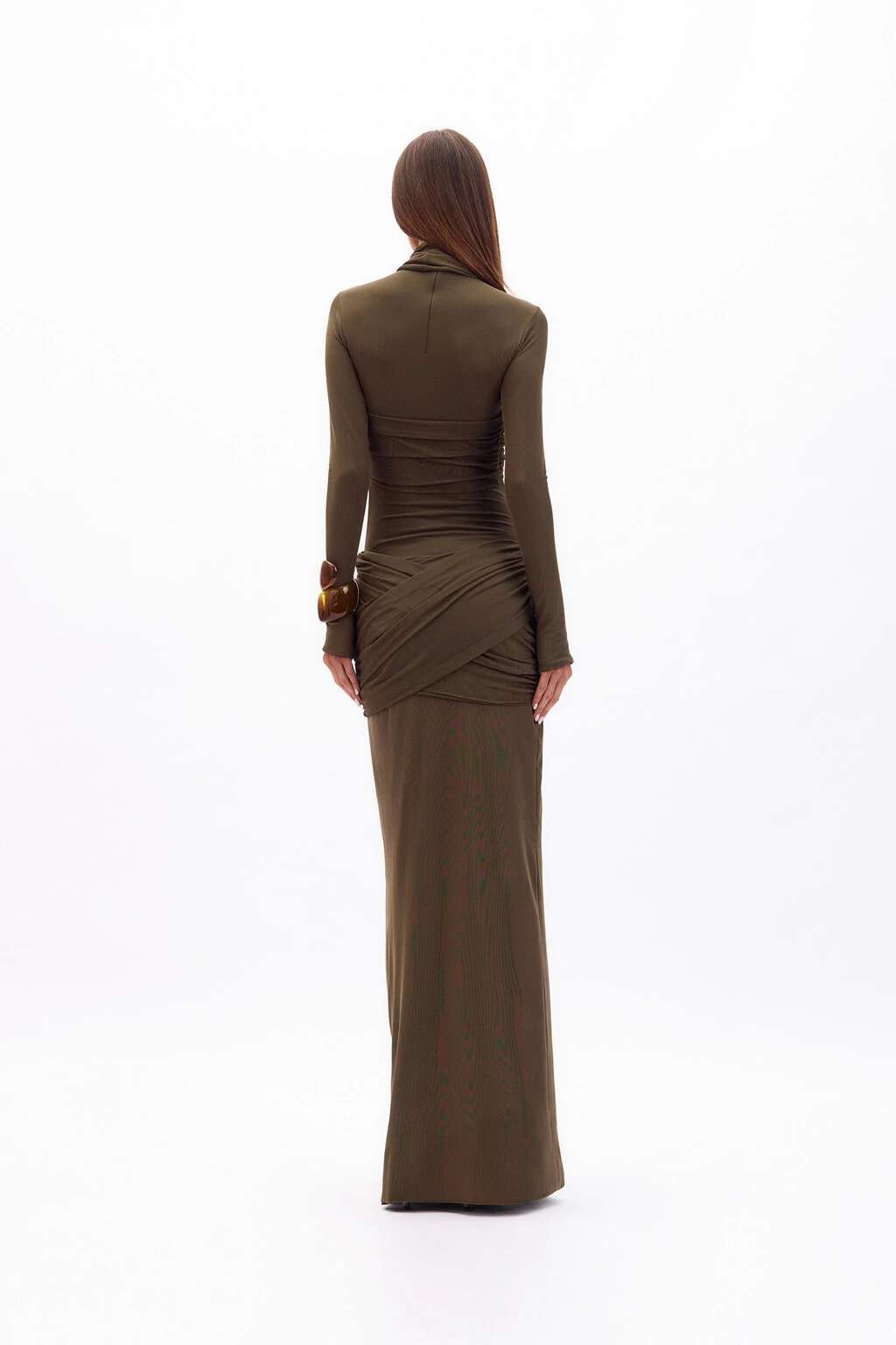O conjunto Judy em tule combina sensualidade e sofisticação em uma proposta que valoriza a silhueta com leveza. O body de manga longa e gola alta envolve o corpo como uma segunda pele, criando uma base minimalista e elegante que se une à saia, formando uma ilusão de continuidade. A peça se estrutura nas texturas das sobreposições, que desenham a cintura e realçam as curvas com suavidade. O resultado é uma composição marcante e contemporânea.