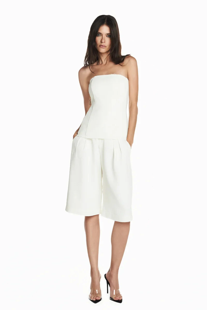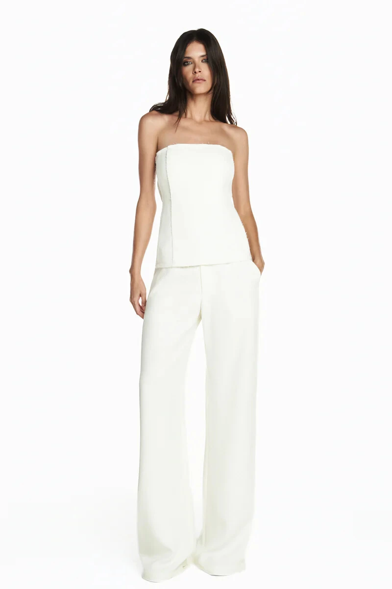 Top estruturado em crepe encorpado com modelagem acinturada e acabamento a fio e desfiado. Possui decote tomara que caia com barbatanas internas para maior sustentação e forro embutido para melhor conforto ao corpo. Fechamento por zíper aparente na parte de trás da peça.