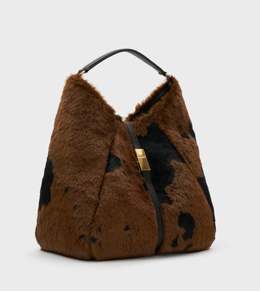 Luzia redefine a sobriedade com um traço geométrico de linhas puras. Sua silhueta se eleva firme, quase arquitetônica, enquanto sua superfície suaviza a rigidez com um luxo silencioso. O fecho metálico central concentra a tensão do design em um ponto exato, transformando cada abertura em um pequeno ritual. Versátil e atemporal, acompanha o presente com a serenidade daquilo que permanece.