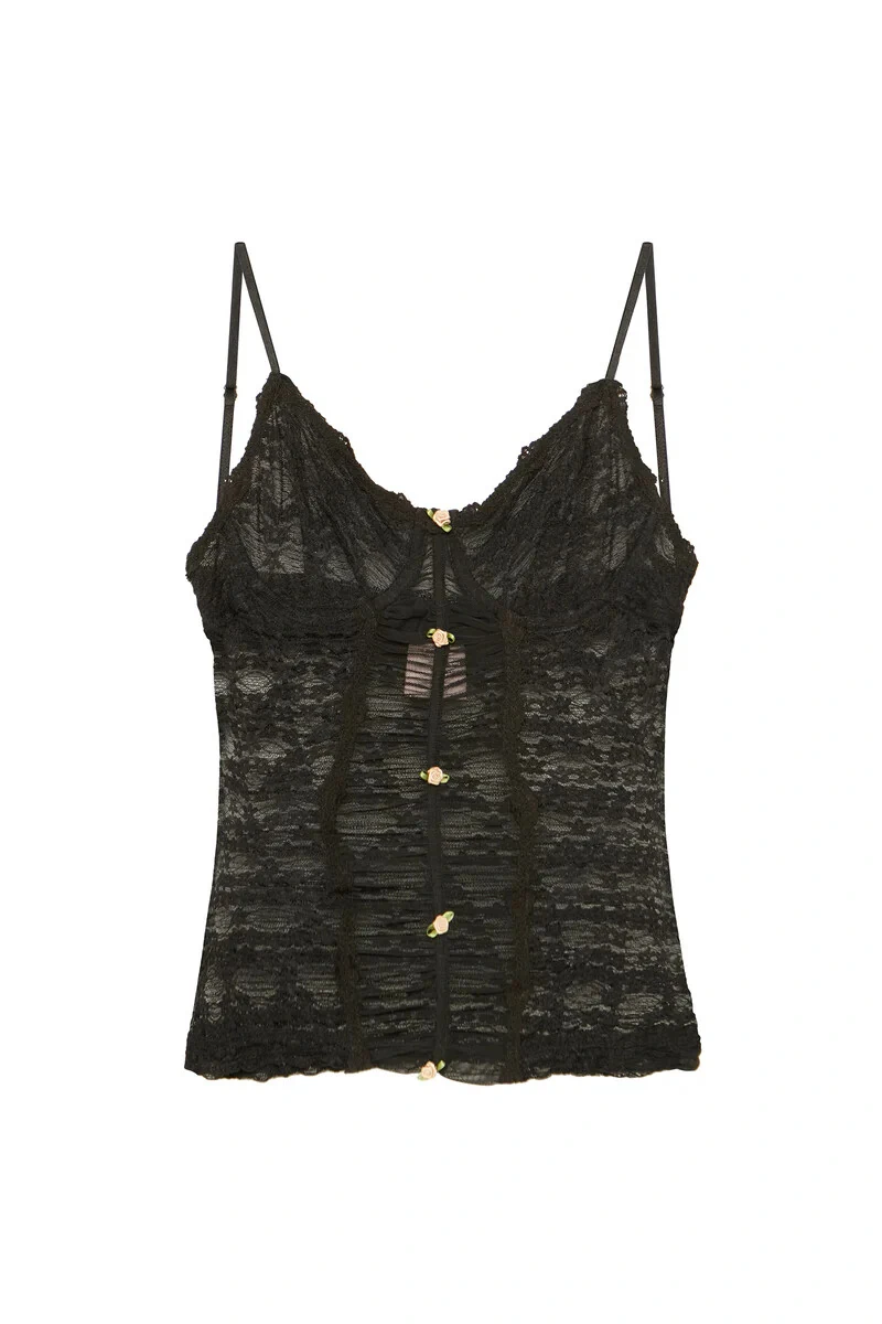Regata em renda, com recorte frontal drapeado e detalhe de elástico com bordados florais aplicados manualmente. Modelagem ajustada ao corpo. Possui leve transparência, decote V, aro no busto para maior sustentação, alças com regulagem e forro embutido. Não possui fechamento.