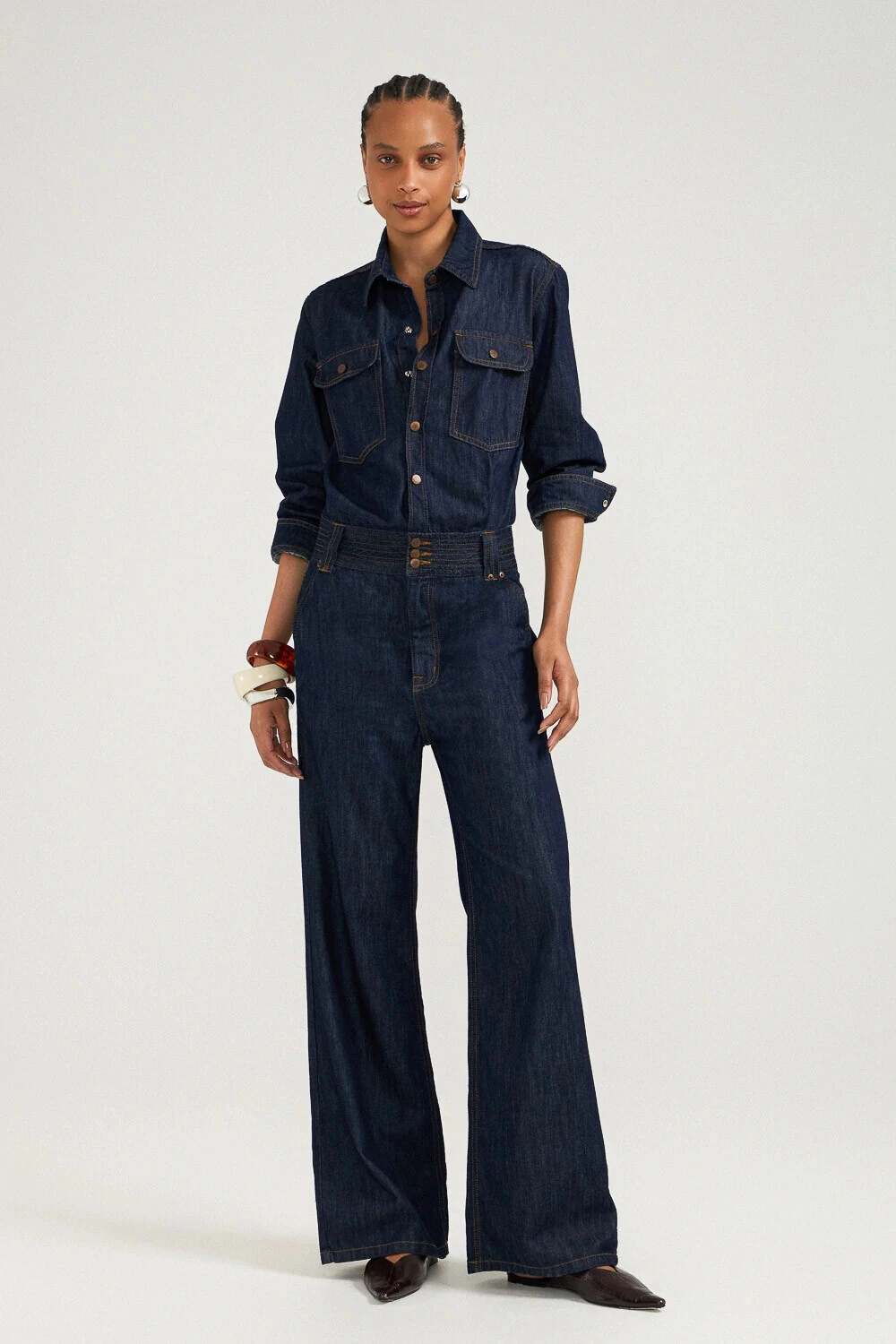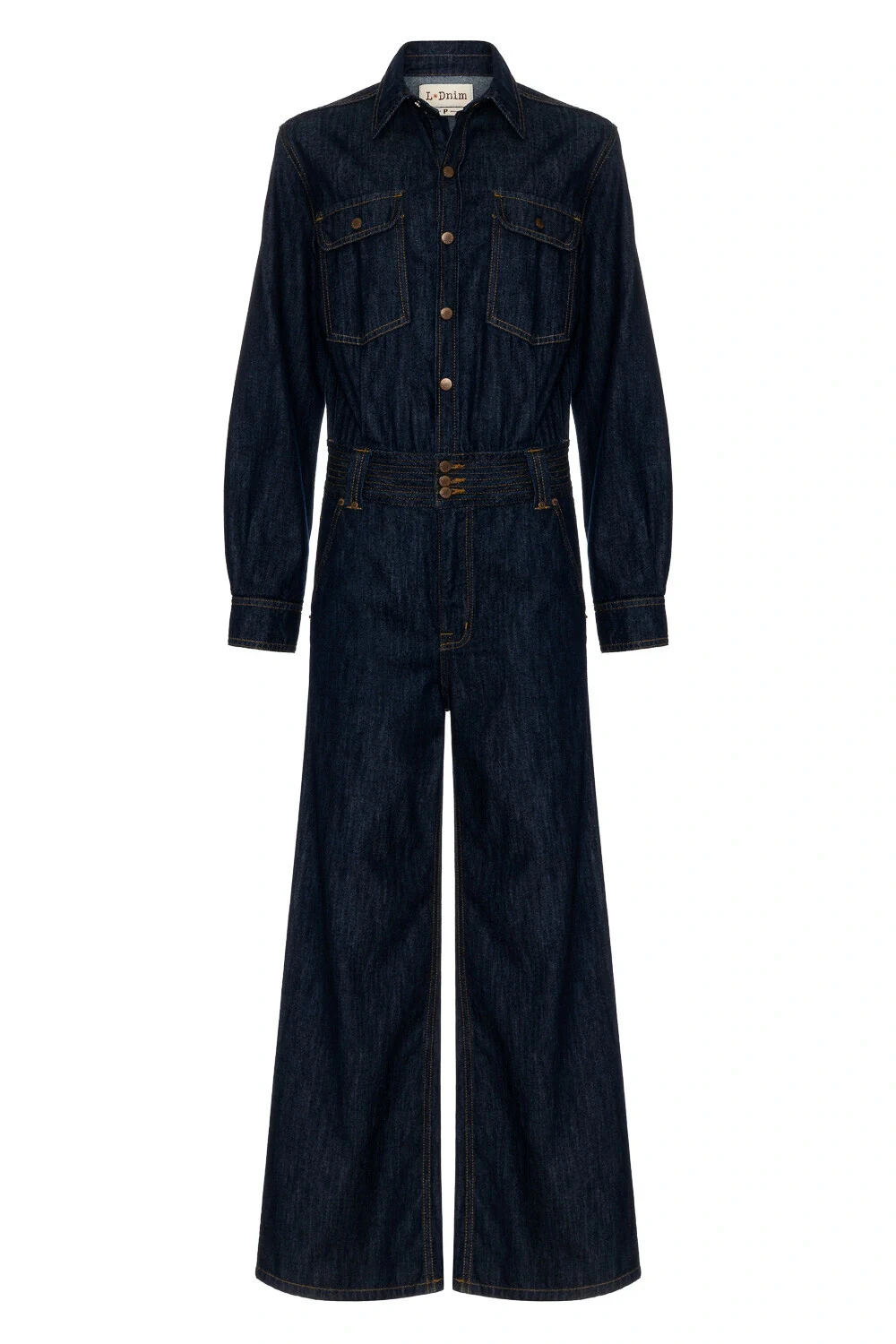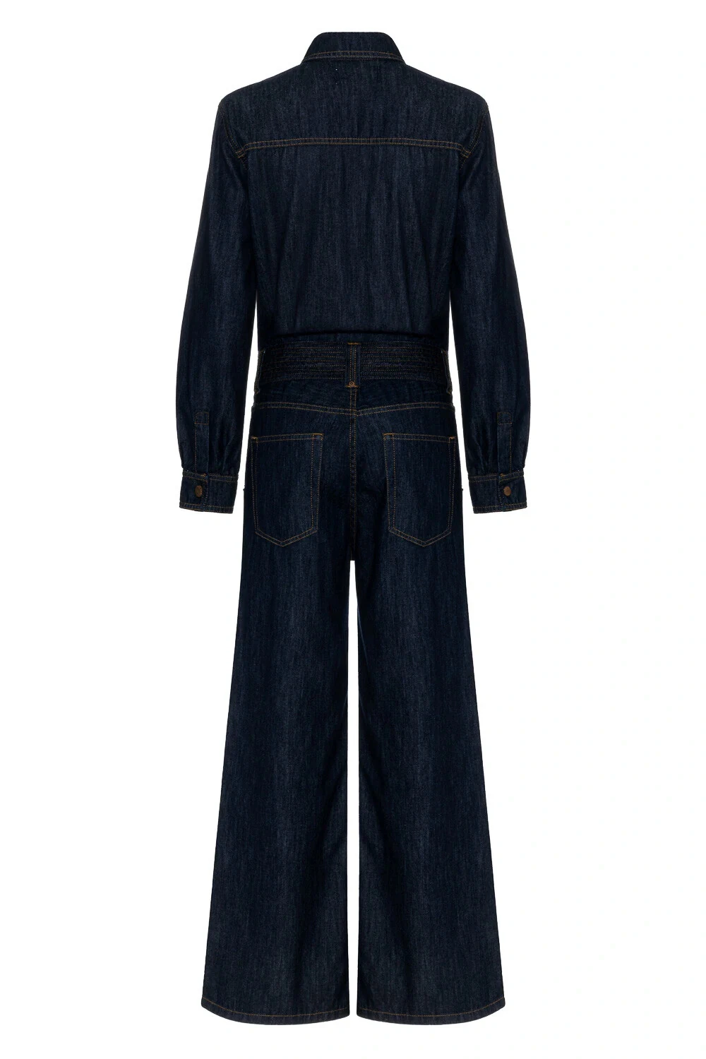 Macacão em denim 100% algodão com lavagem raw (jeans bruto), que valoriza a aparência natural do tecido. Possui mangas longas e fechamento frontal por botões de pressão na vista. Bolsos simétricos, além de cós ajustado com detalhe de pespontos aparentes. A modelagem da calça é ajustada na cintura e quadril, com leve abertura na barra, garantindo equilíbrio entre estrutura e movimento.
