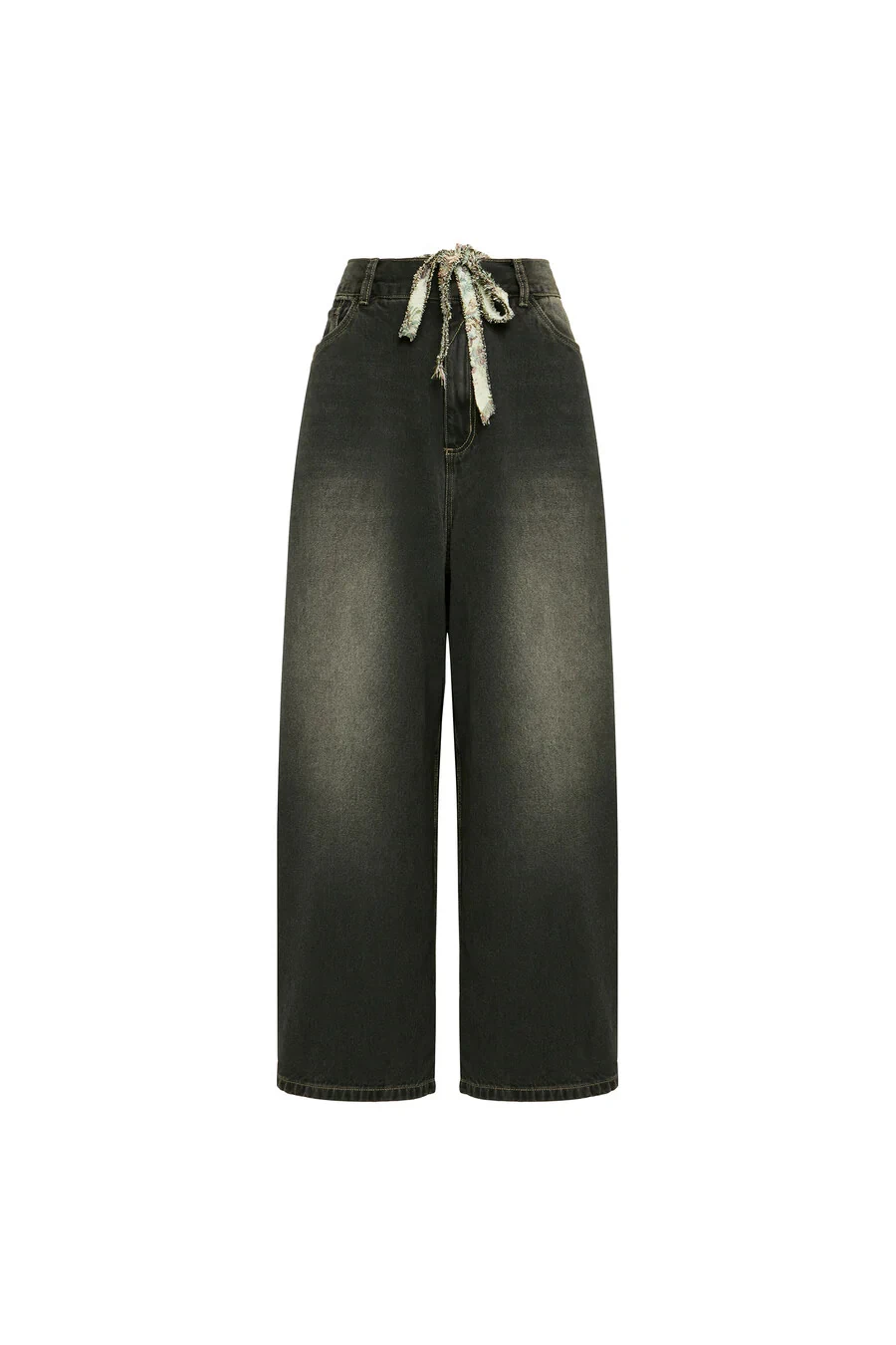 Calça jeans balloon com modelagem ampla nas pernas e ajuste suave na barra. Detalhe estonado com efeito desgastado localizado. Possui cintura alta, cós com passantes e bolsos na frente e atrás da peça. Fechamento por zíper, colchetes e cordão a fio estampado.