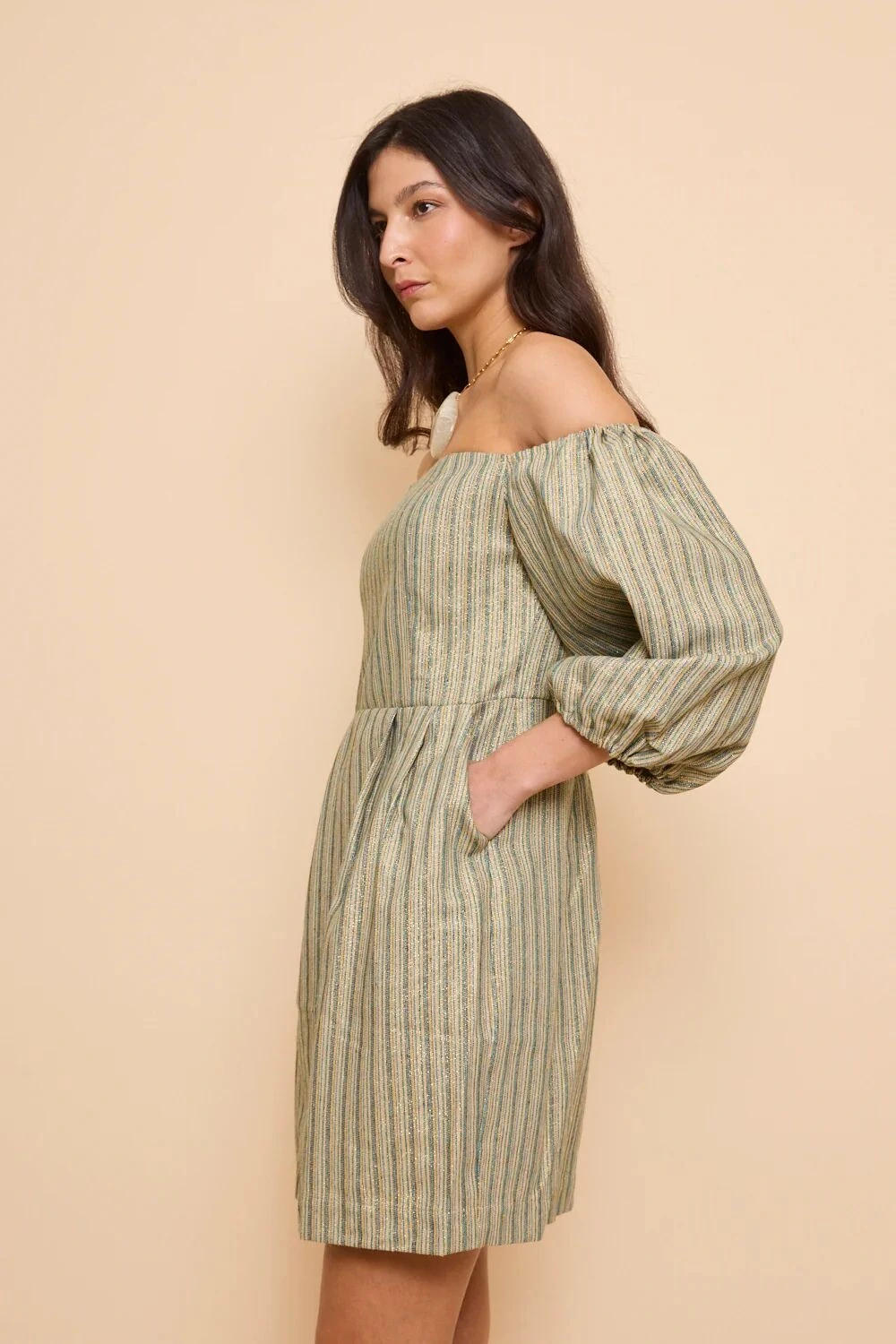 Vestido com decote reto e mangas bufantes em tecido texturizado com leve brilho. Caimento acinturado ao corpo, comprimento curto confortável, bolsos laterias e fechamento por zíper nas costas. Detalhe de elástico nas costas para maior conforto e segurança. Acompanha cinto forrado em próprio tecido.