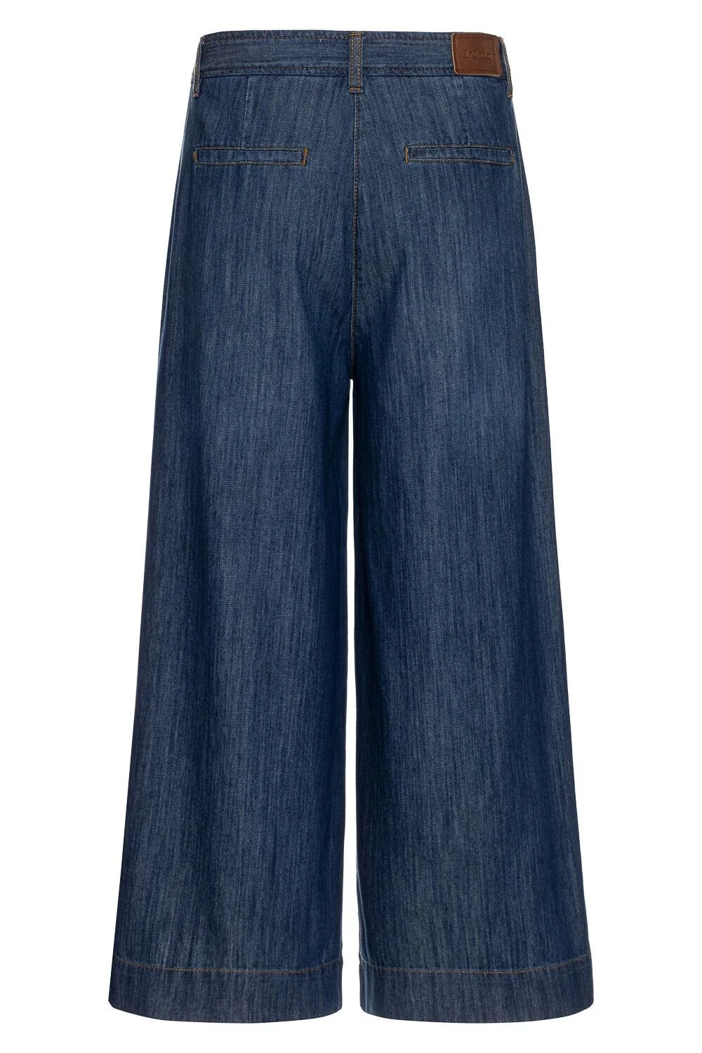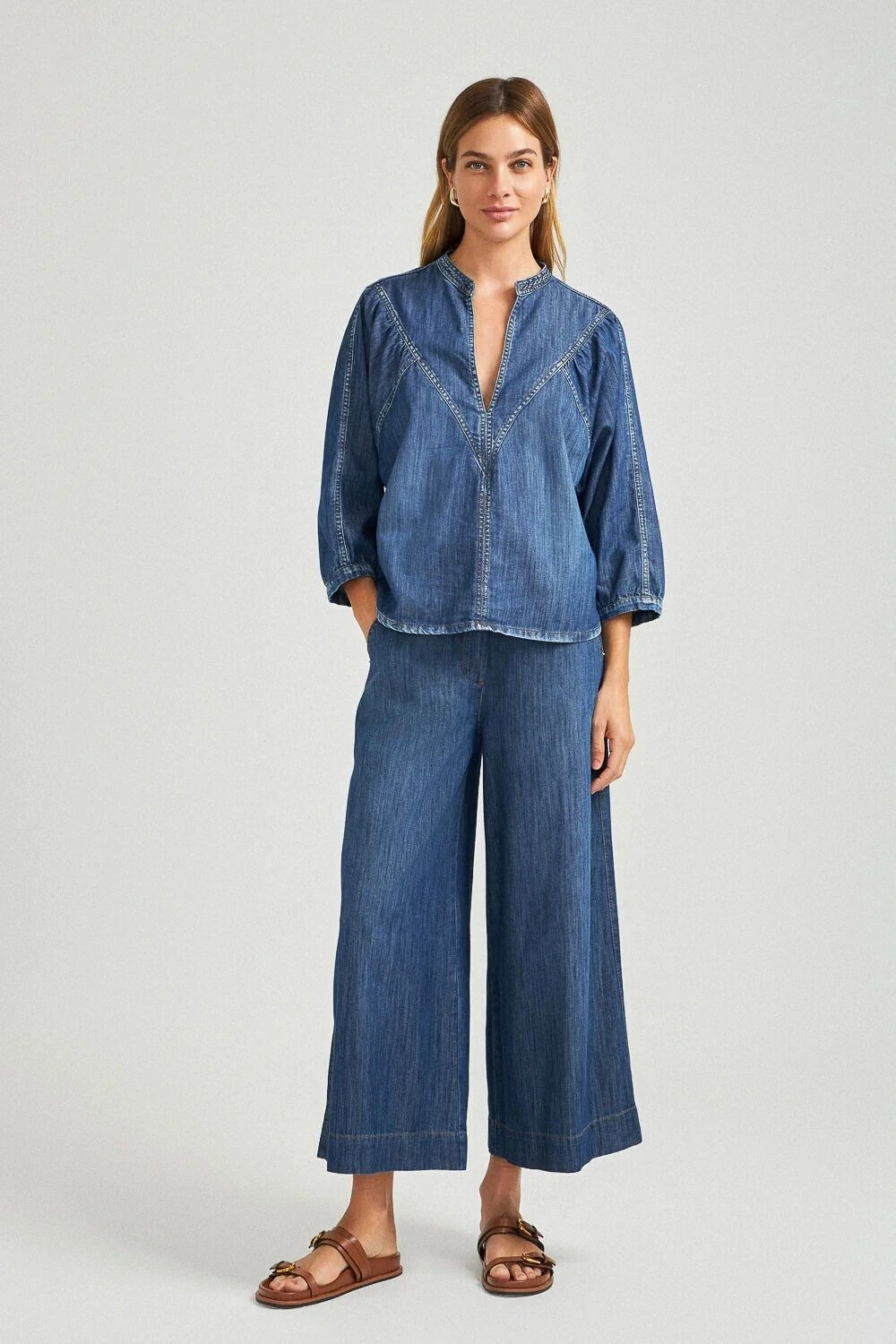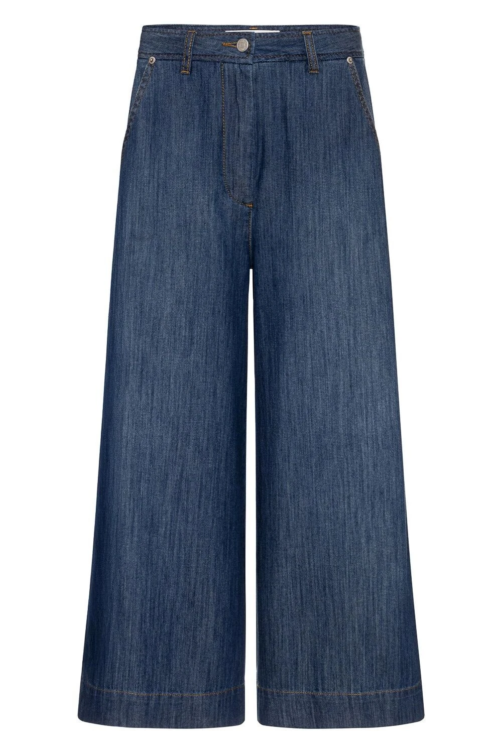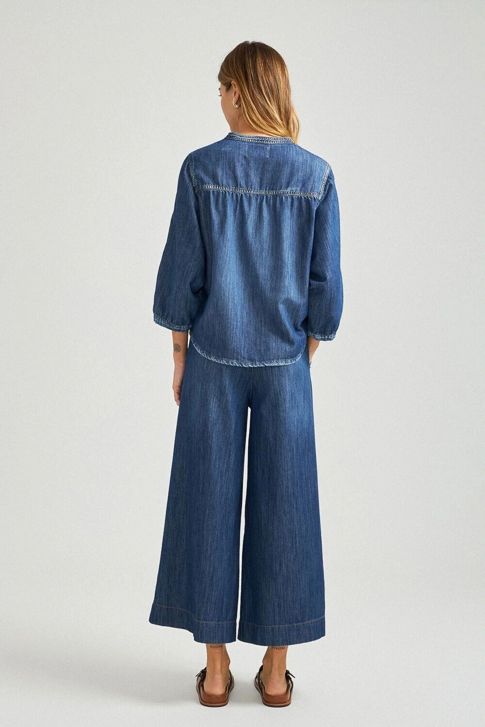 Calça Marine Tailor jeans 100% algodão, lavagem média e modelagem levemente ampla até a barra. Detalhe de bolso vertical que agrega sofisticação e funcionalidade à peça.