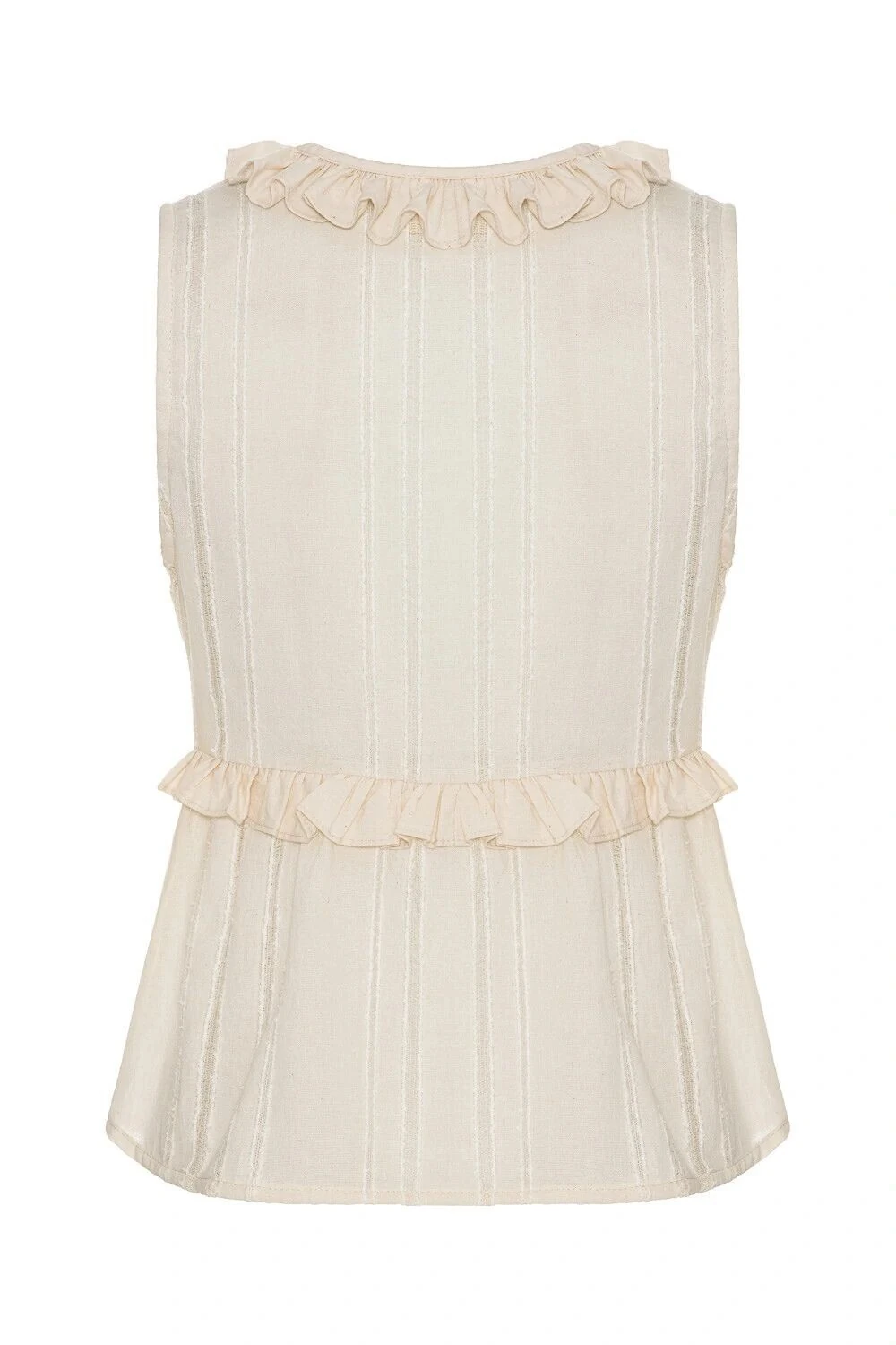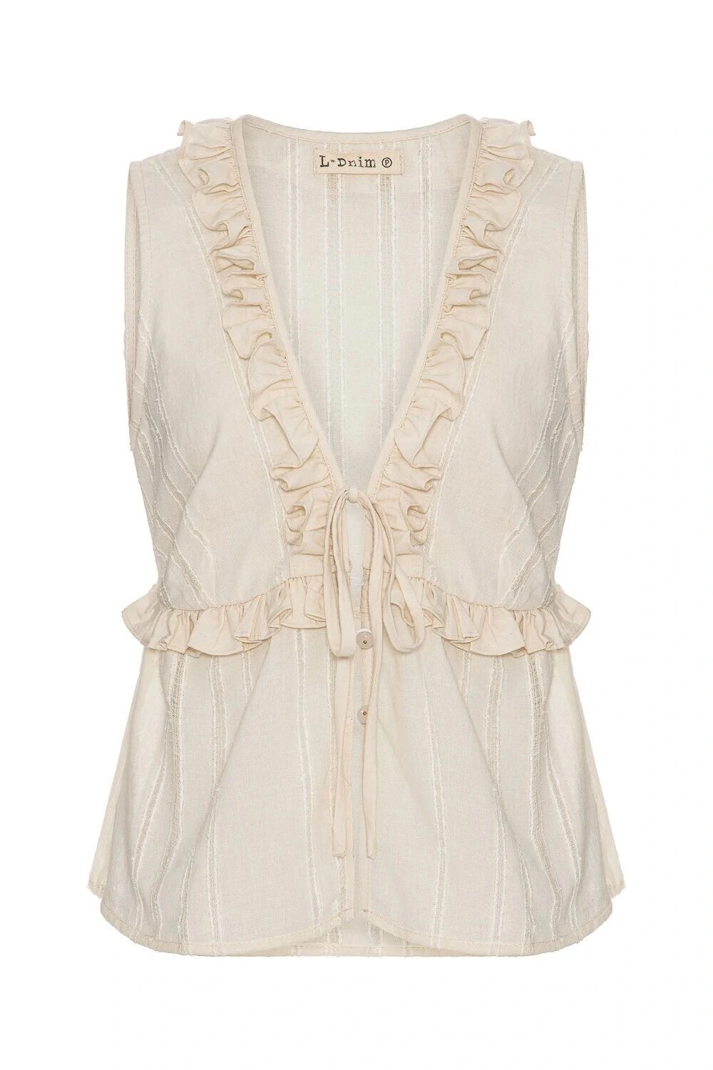 Top em algodão leve com textura de listras, decote V, detalhe de babados e amarração na altura do busto. Feminino e delicado, ideal para looks fresh e elegantes.