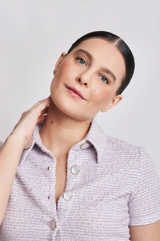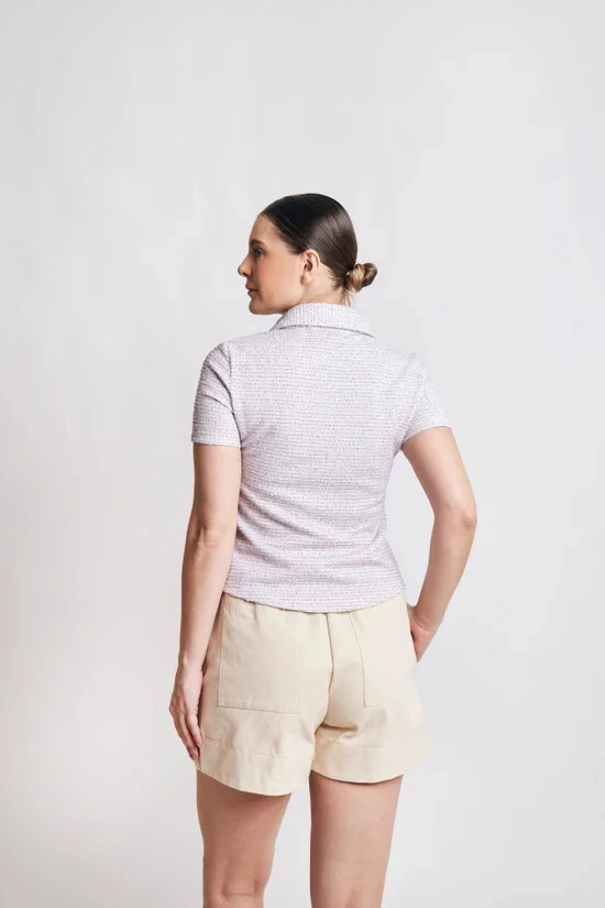 Camisa confeccionada em malha tweed. Tecido listrado texturizado disponível nas variantes lilás e verde, de fundo off-white e detalhe de fio metalizado prata. Modelo acinturado, com botões de base metálica dourada e interior branco leitoso.
